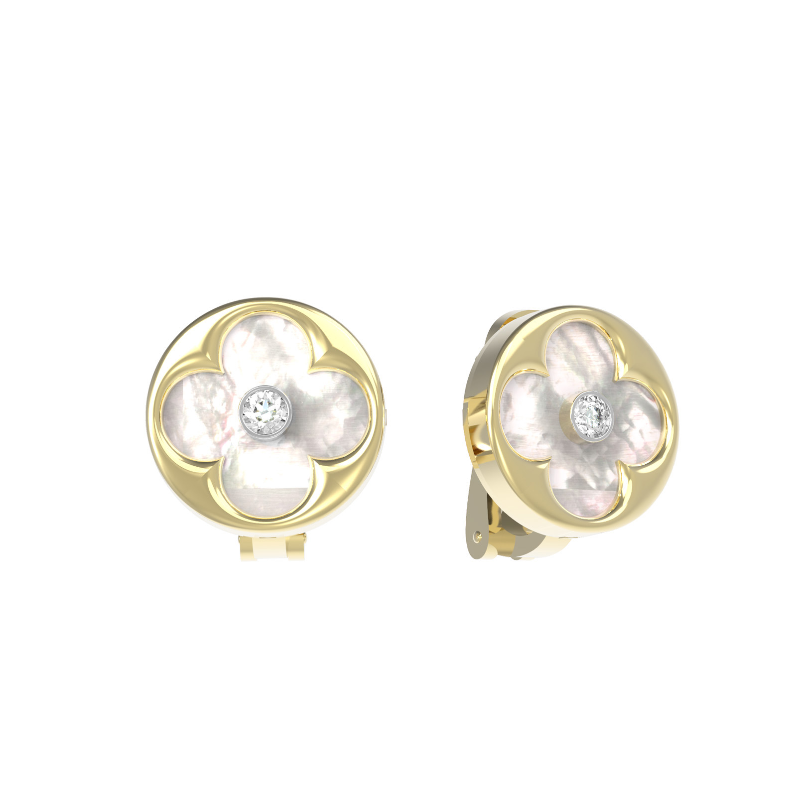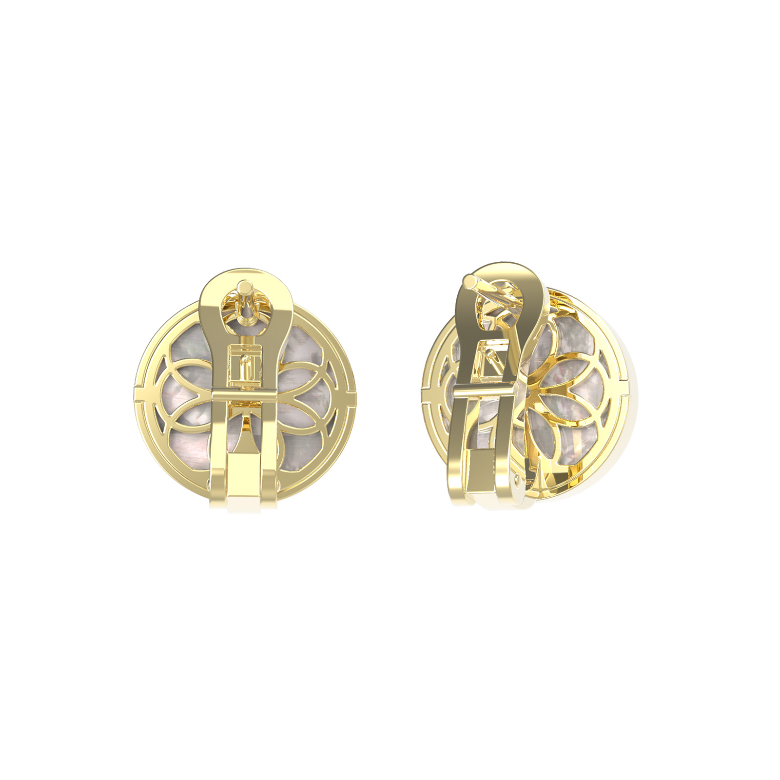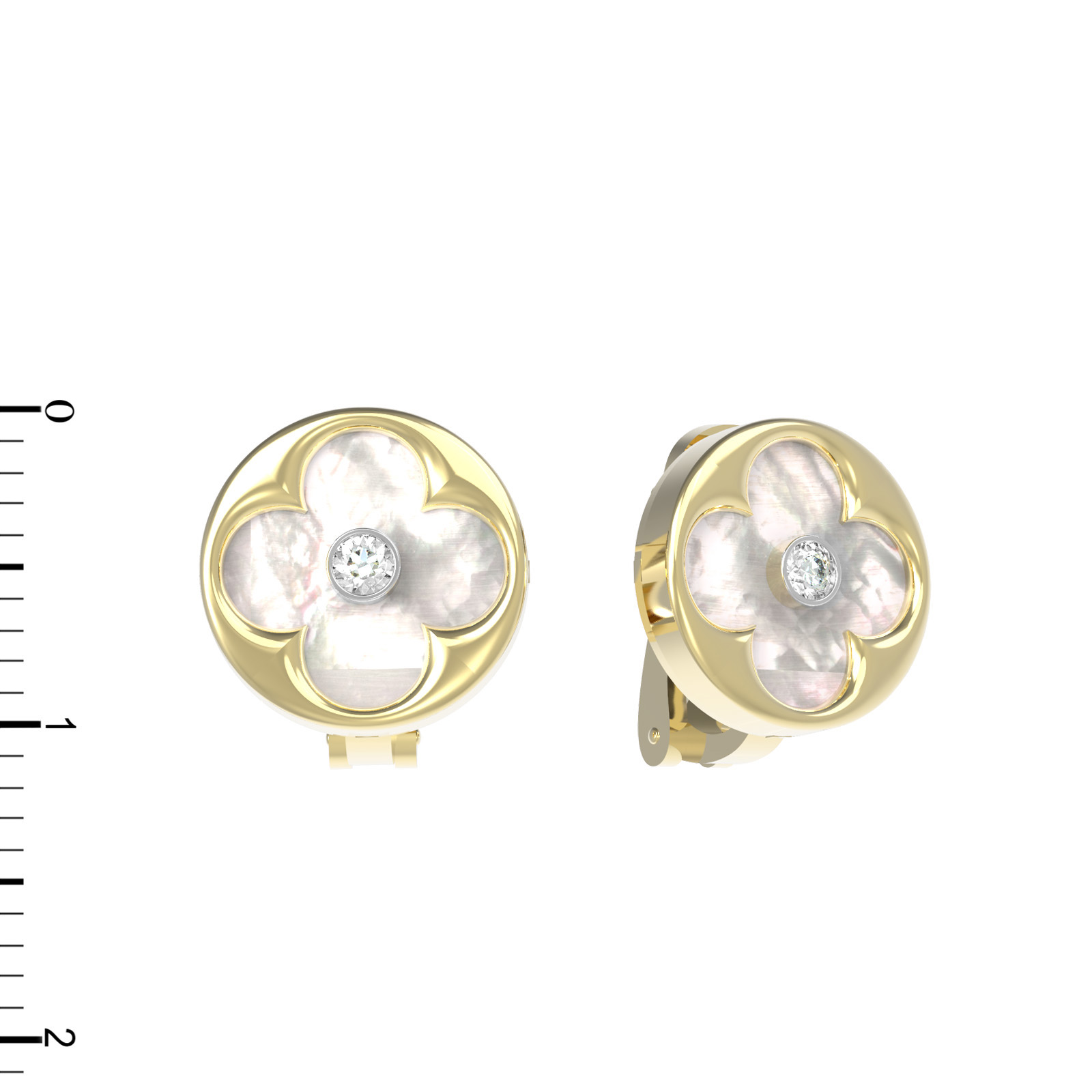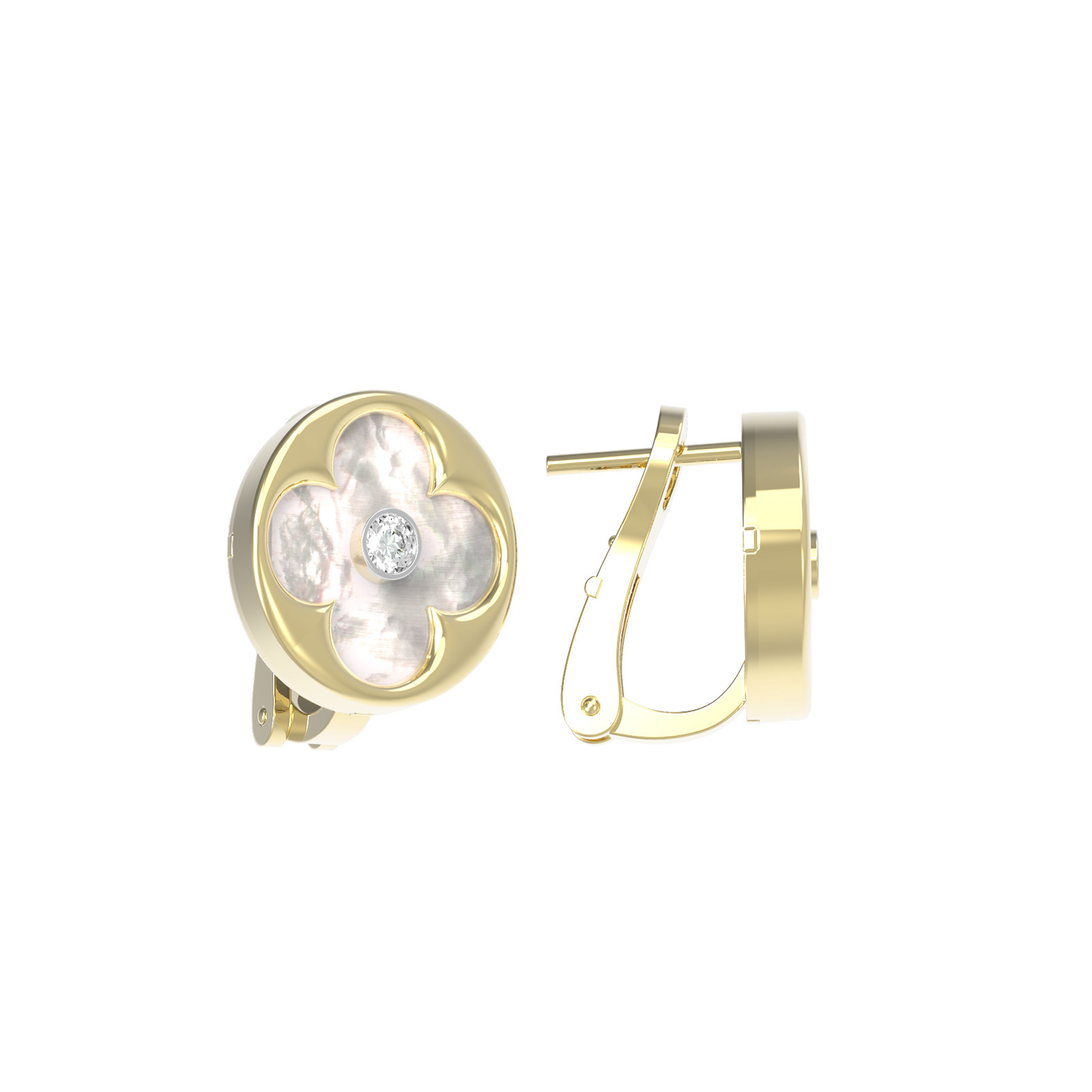 Основой композиции выступает благородный перламутр, чье нежное сияние мягко переливается при каждом движении. Центр каждой серьги украшен сияющим бриллиантом круглой формы, который добавляет изделию роскошный акцент и игру света. Белый цвет вставок идеально гармонирует с теплым оттенком лимонного золота, создавая сбалансированный и современный облик.