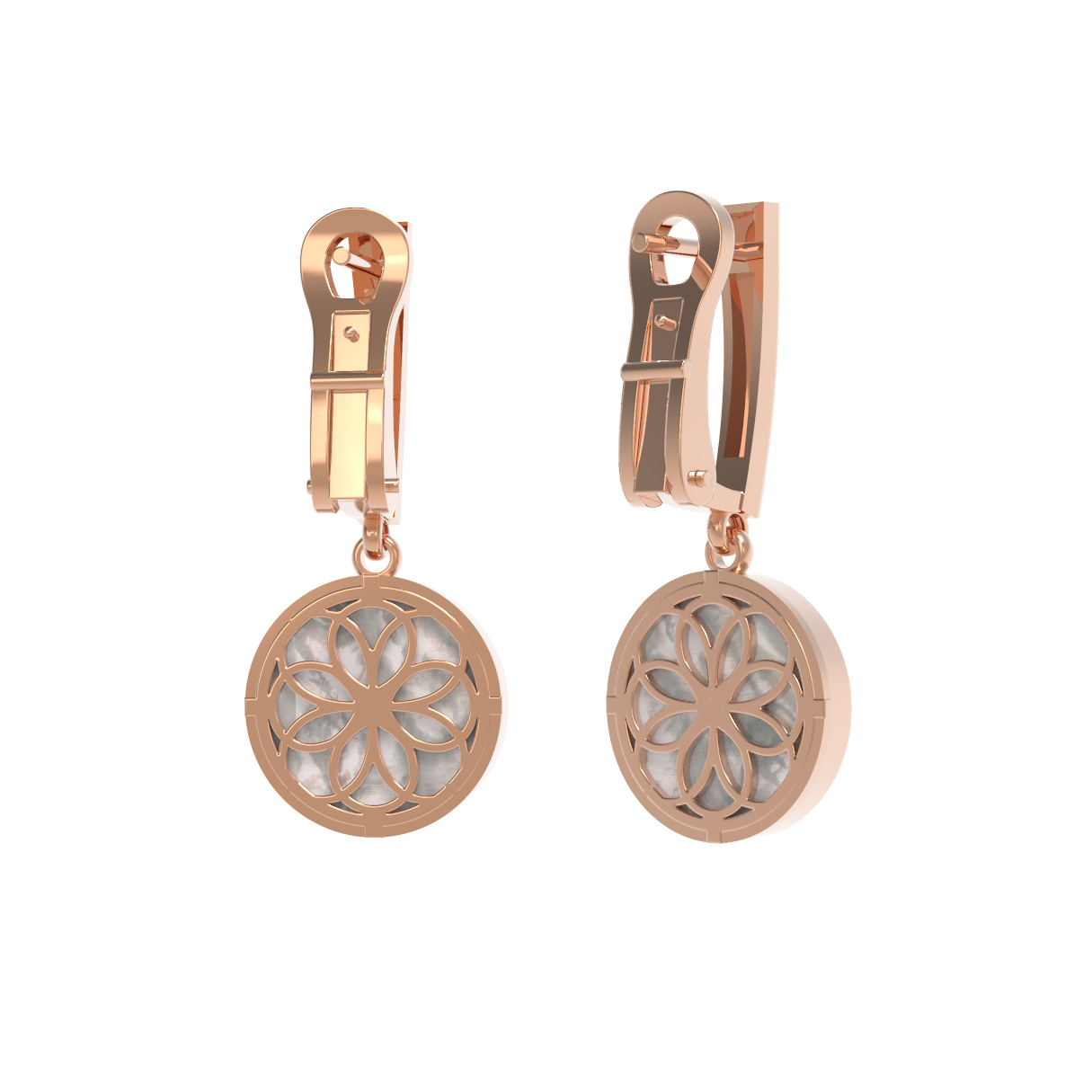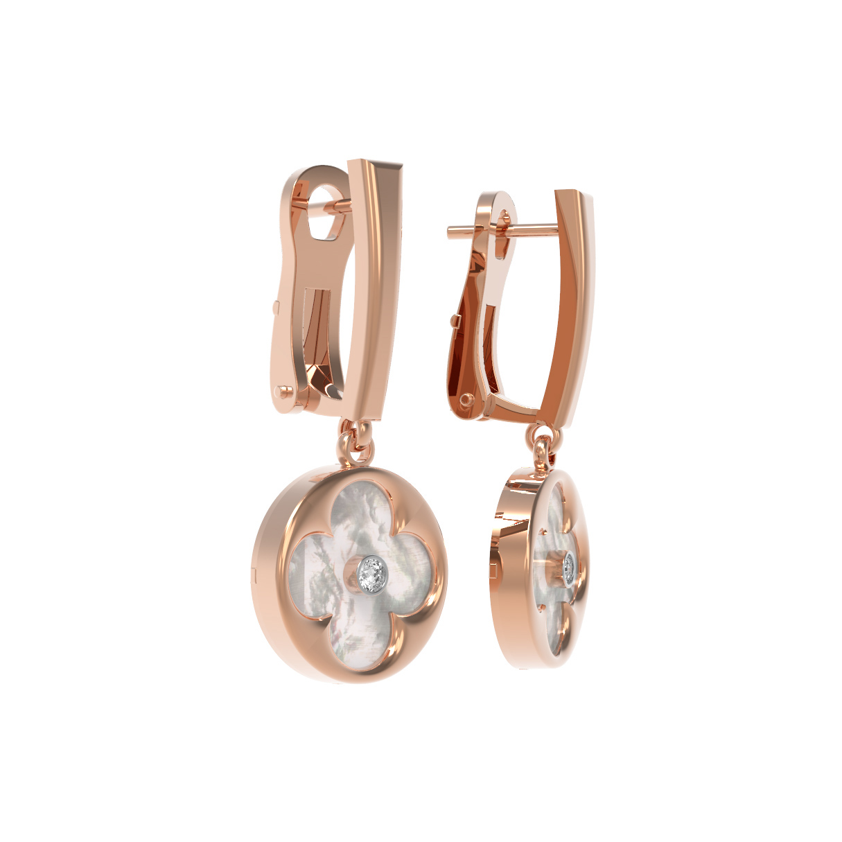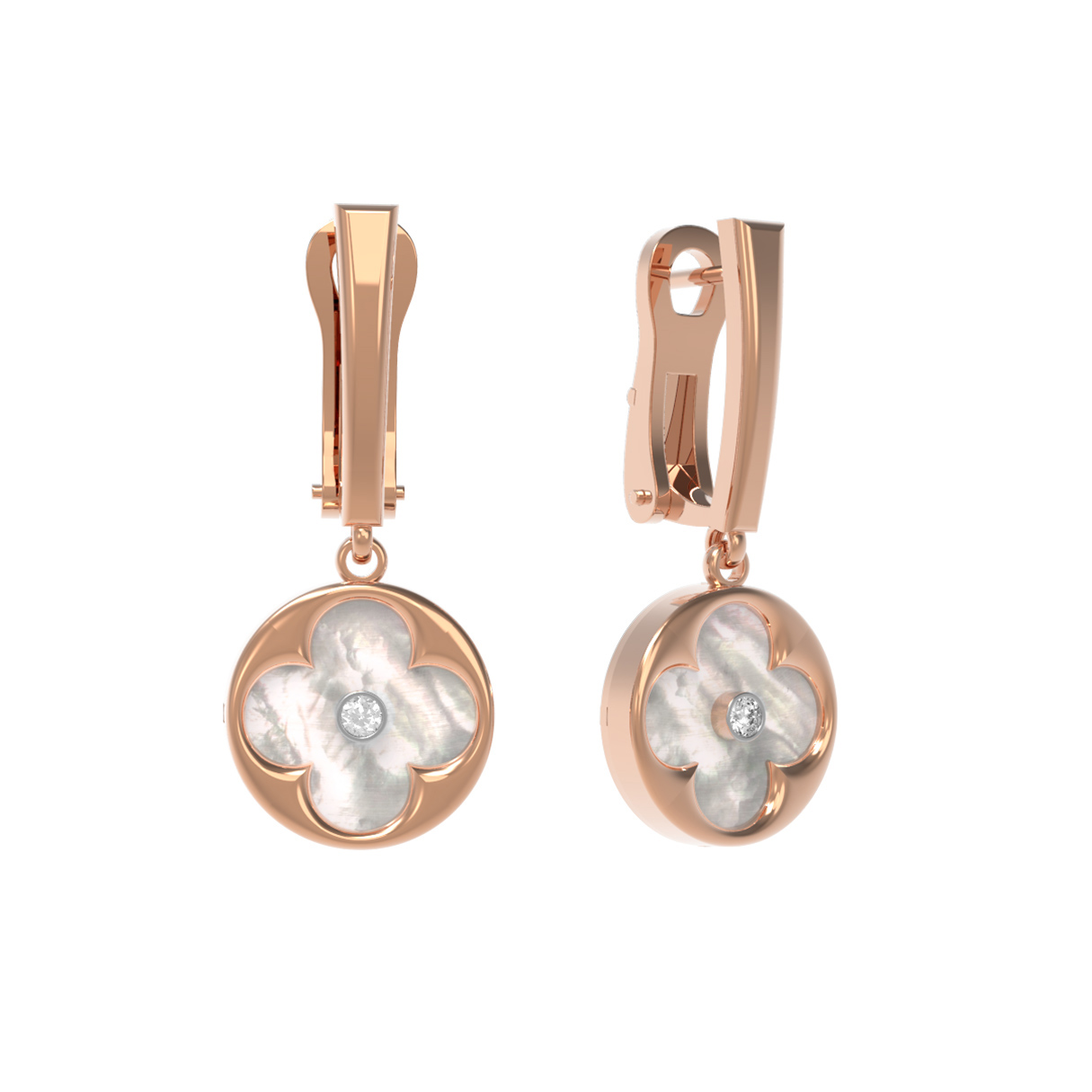 В центре композиции каждой серьги расположен сверкающий бриллиант круглой формы, который добавляет аксессуару благородного блеска. Вставка из перламутра белого цвета эффектно подчеркивает глубину и природную красоту камня. Всего в изделии использованы 2 вставки, гармонично дополняющие друг друга.