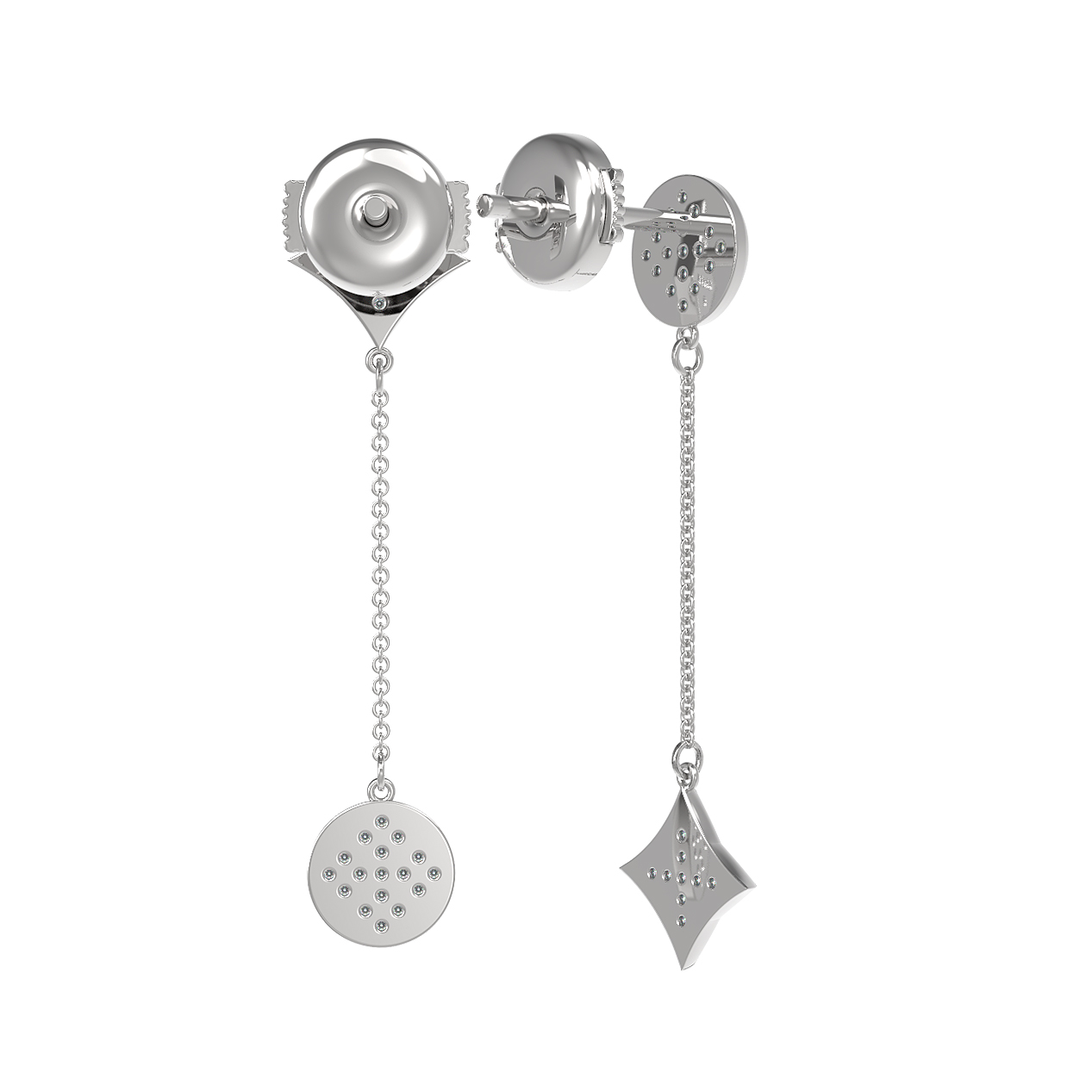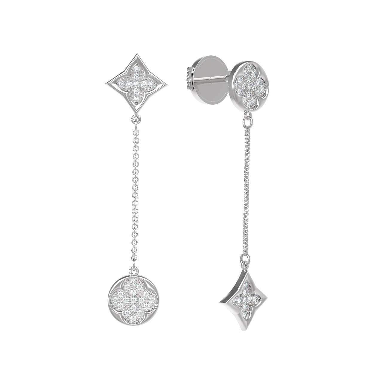 Основой изделия служит высококачественное белое золото 585 пробы. Холодный блеск металла гармонично сочетается с сиянием 52 вставок из бриллиантов. Камни имеют классическую форму круг и характеризуются чистым белым цветом, создавая неповторимую игру света при каждом движении. Изящные цепочки придают серьгам особую подвижность и легкость, делая их выразительным акцентом вашего стиля.