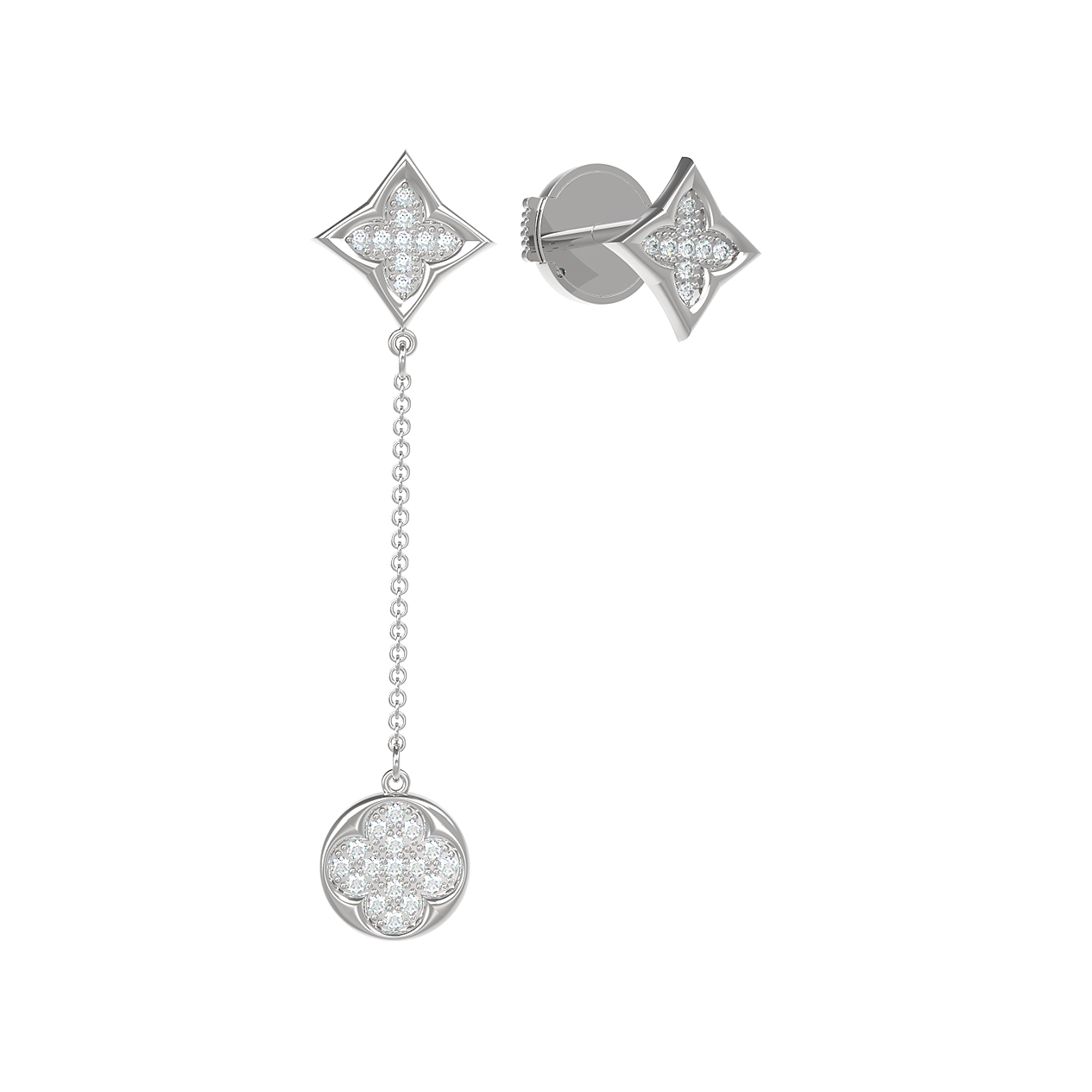 Серьги инкрустированы 35 бриллиантами круглой огранки, которые создают завораживающее сияние. Белый цвет вставок гармонично сочетается с холодным блеском белого золота, придавая образу особую свежесть и элегантность. Длинная подвесная часть на цепочке добавляет динамики и делает аксессуар заметным акцентом в любом наряде.