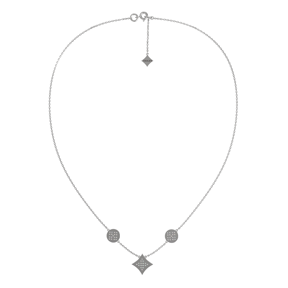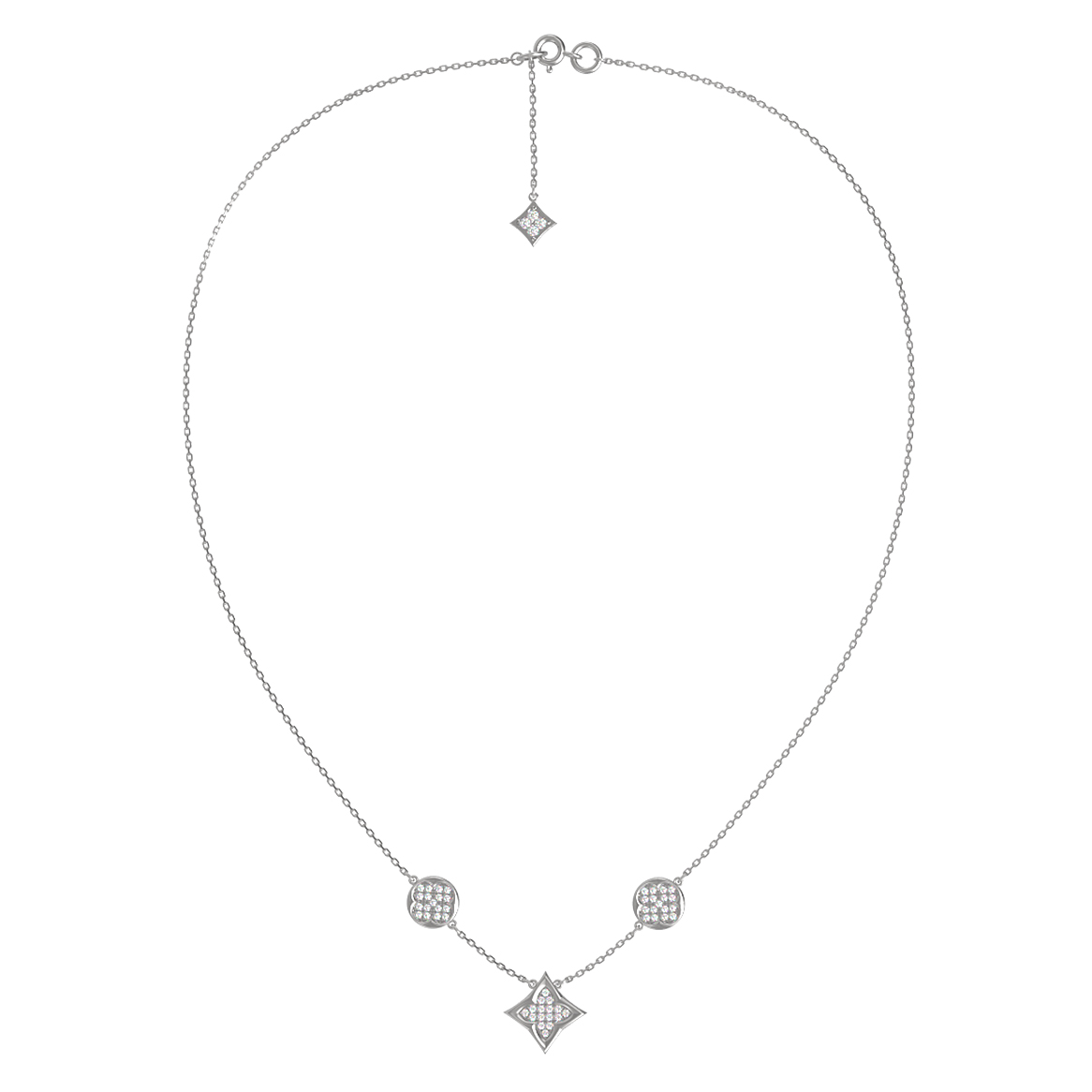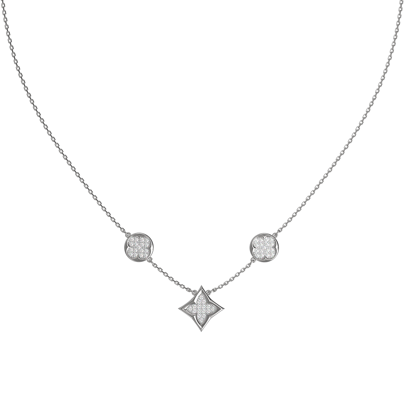 Изысканное колье из белого золота 585 пробы из коллекции De Luxe — Амальфи — Бриллианты станет безупречным акцентом вашего образа. Дизайн украшения, вдохновленный нежным мотивом клевера, объединяет в себе классическую элегантность и современную роскошь. Центральным элементом композиции выступают изящные формы вставок, искусно инкрустированные 216 сверкающими бриллиантами круглой огранки. Чистый белый цвет вставок идеально гармонирует с холодным блеском драгоценного металла, создавая чарующее сияние, которое приковывает взгляд.