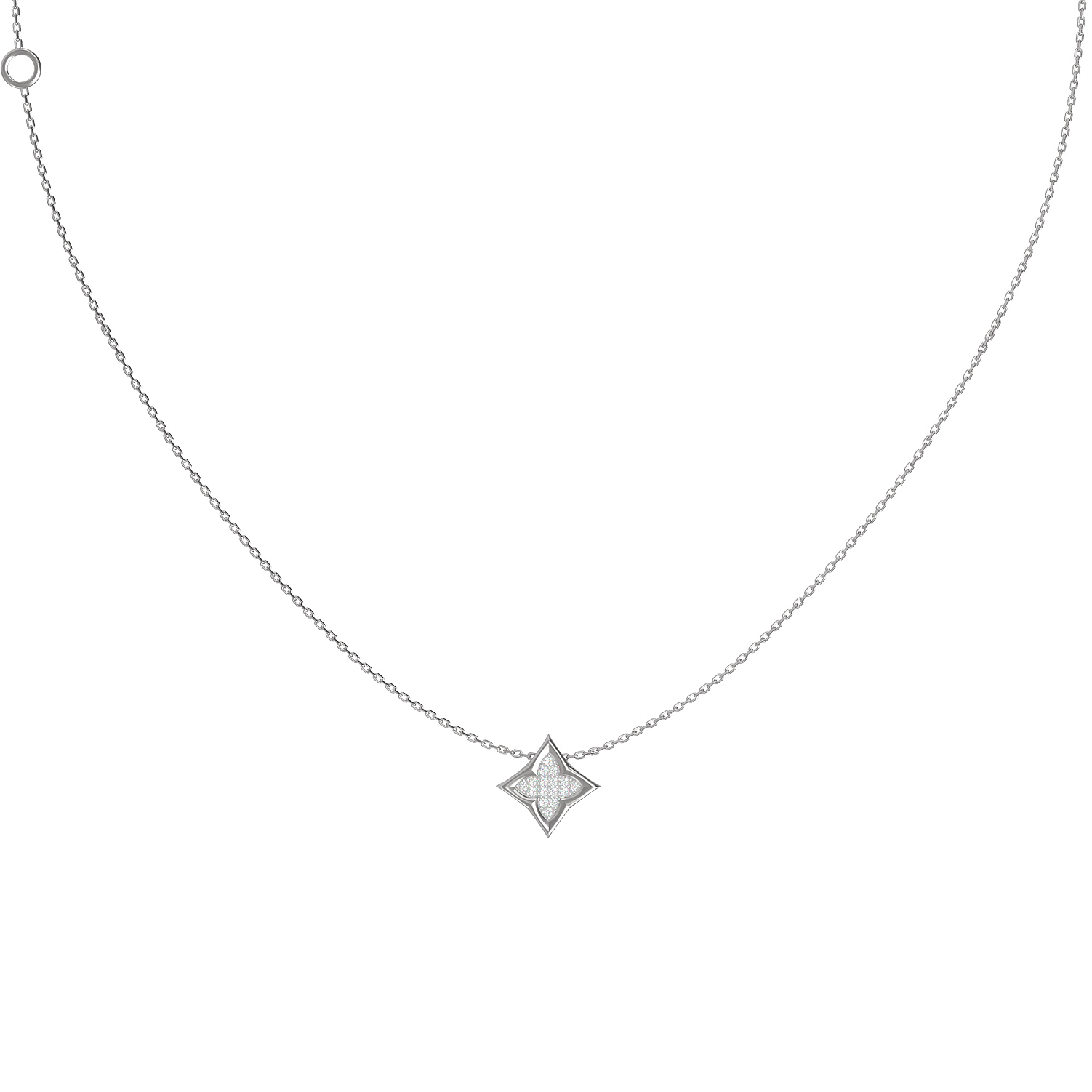 Изысканное колье из белого золота 585 пробы станет утонченным завершением любого образа. Это ювелирное изделие, представленное в коллекции De Luxe — Амальфи — Бриллианты, отличается лаконичным дизайном и безупречным исполнением. В центре внимания — декоративный элемент в форме клевера, символизирующий удачу и благополучие. Его очертания подчеркнуты благородным сиянием драгоценного металла, а инкрустация создает эффект непрерывного блеска.