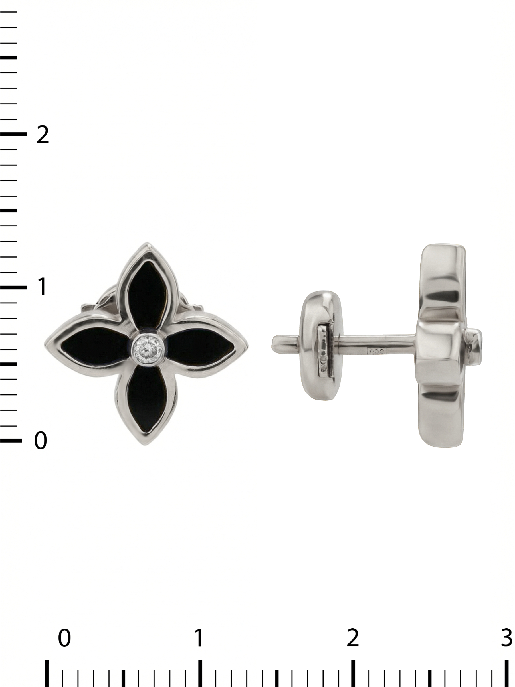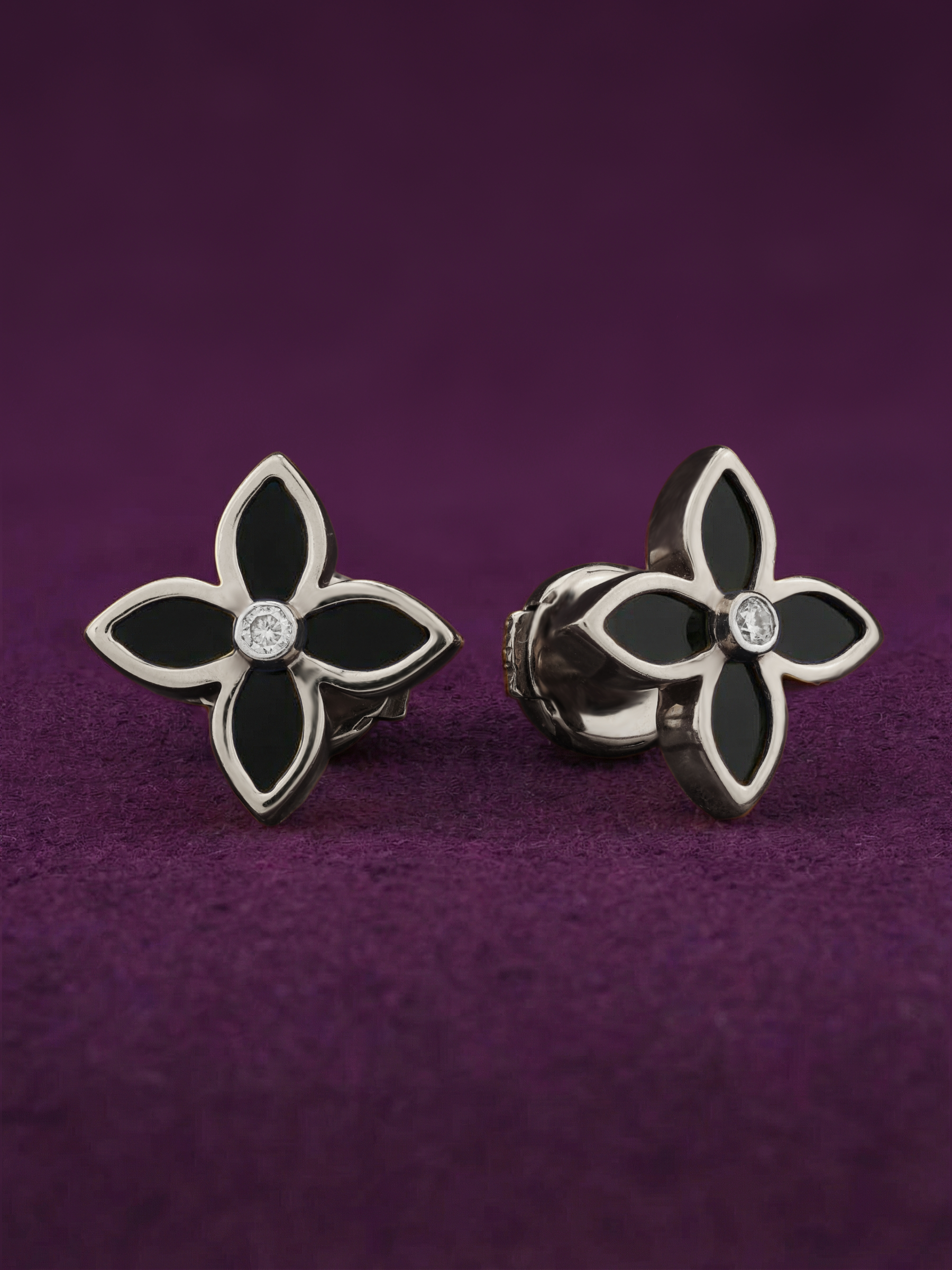 В центре композиции расположен сверкающий бриллиант круглой огранки, который притягивает взгляд своей чистотой и яркостью. Его окружают изысканные лепестки из оникса глубокого черного цвета, образующие узнаваемый силуэт четырехлистника. Контраст между белым цветом металла, прозрачностью камня и насыщенным черным оттенком оникса придает украшению особую выразительность и глубину.