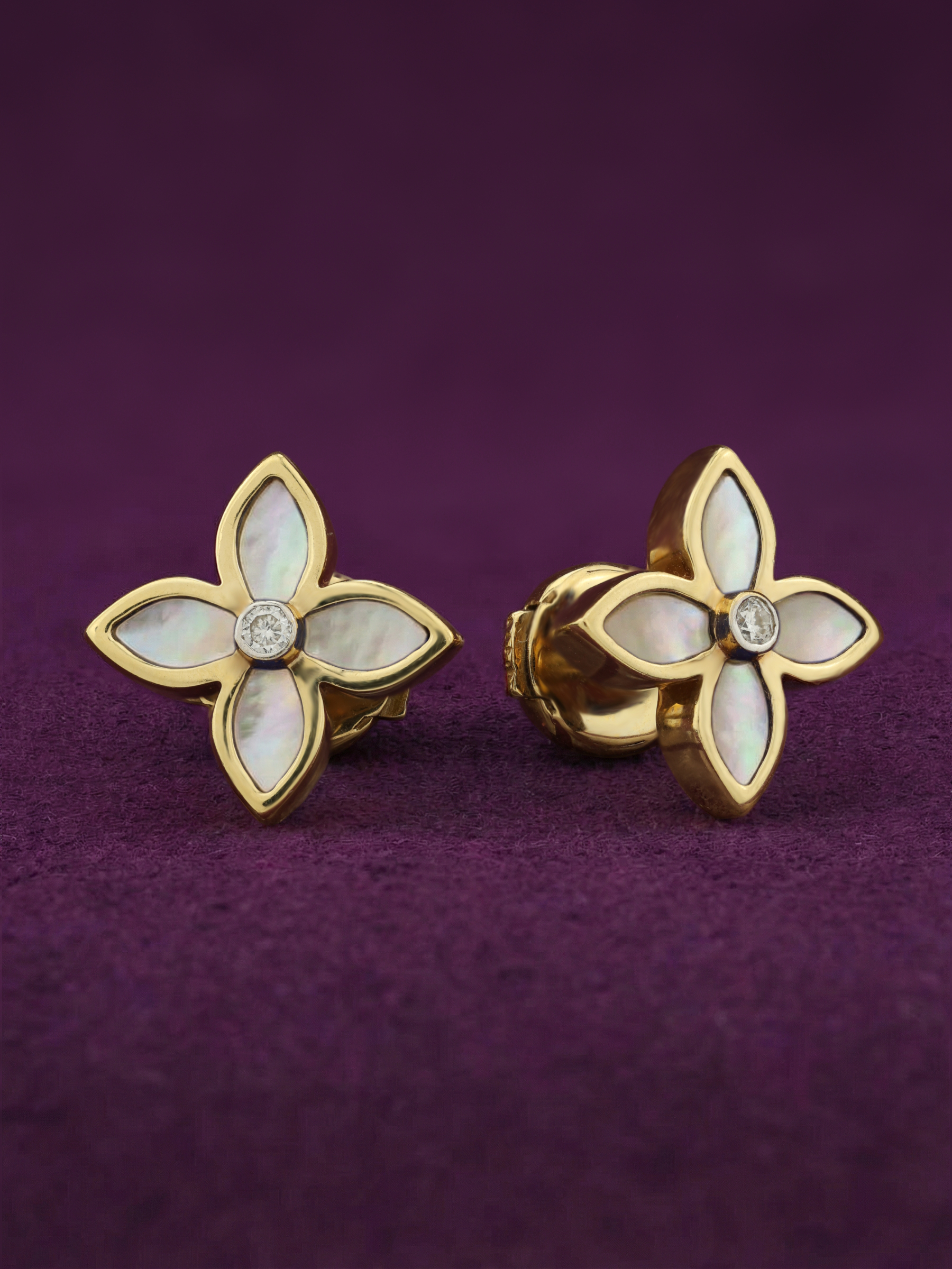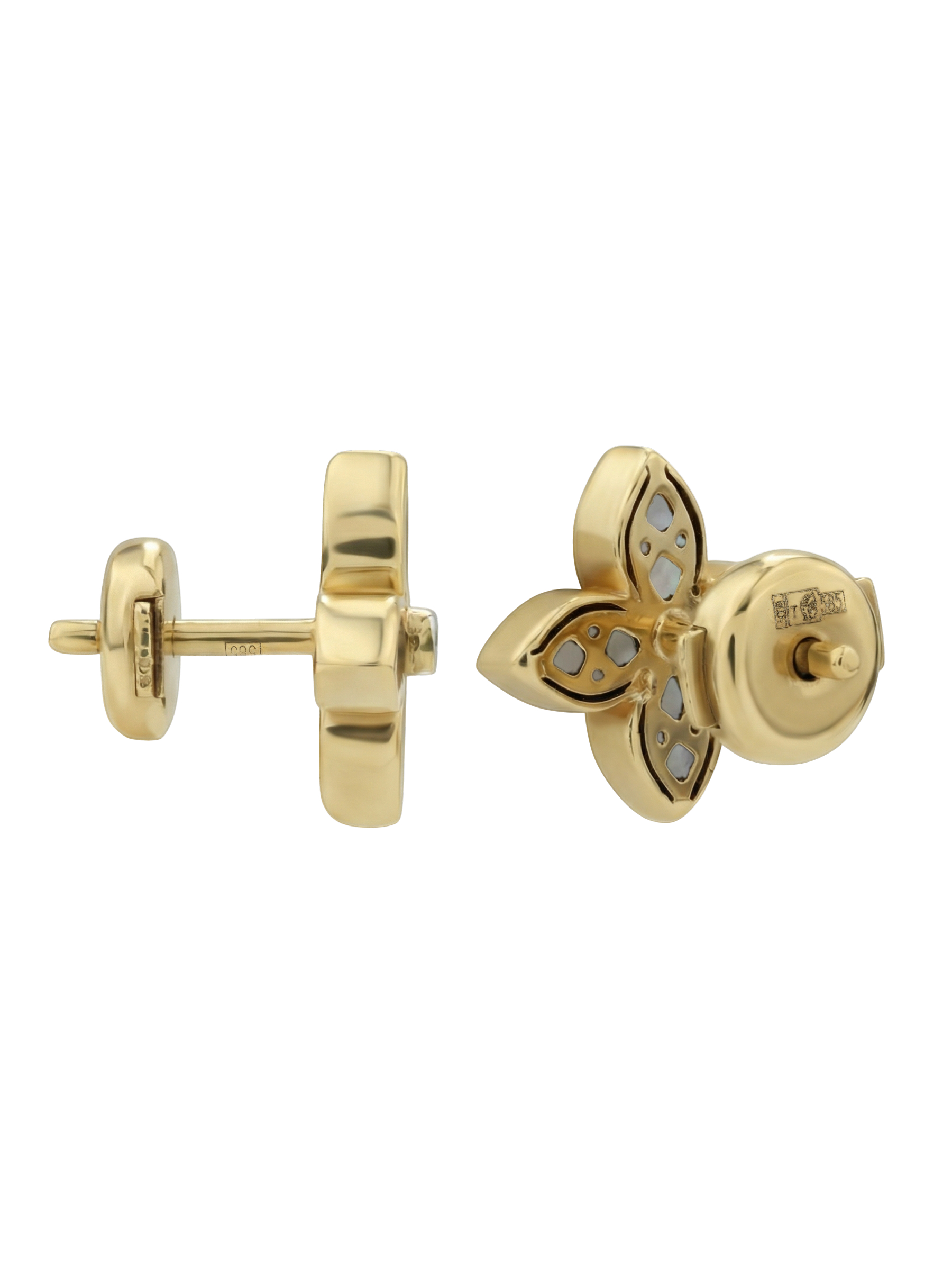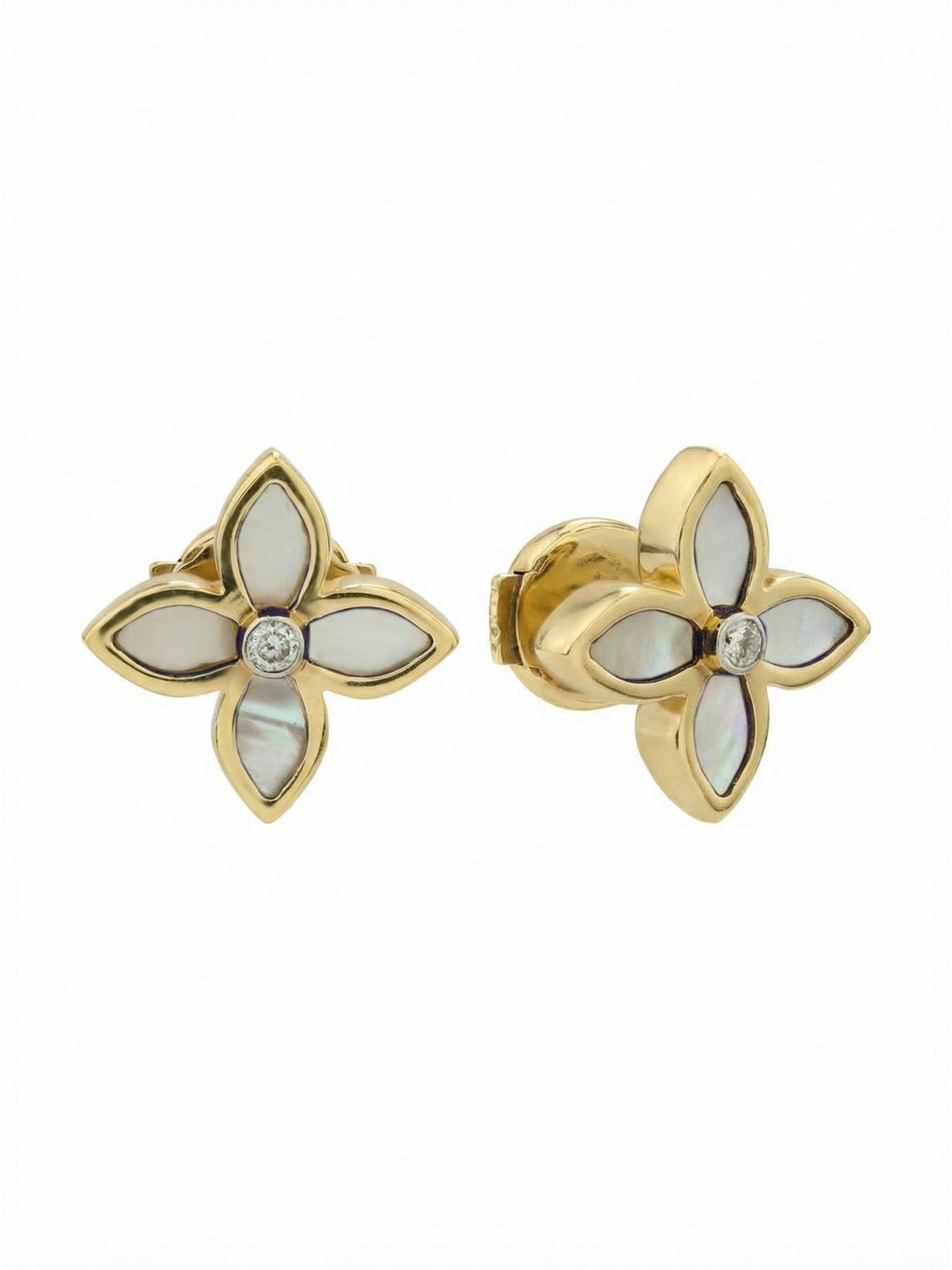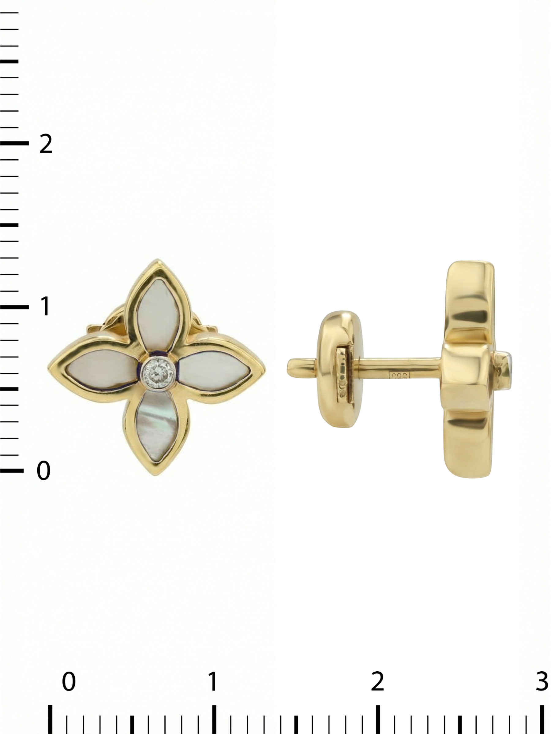 Центральным элементом композиции является вставка в форме круга — сверкающий бриллиант, окруженный лепестками из перламутра. Форма вставок в виде четырехлистника придает серьгам нотки символичности и легкости. Контраст между белым цветом бриллианта и переливами перламутра создает чарующую игру света, которая притягивает взгляды. В изделии использовано 2 вставки, которые мастерски вписаны в общую архитектуру украшения.