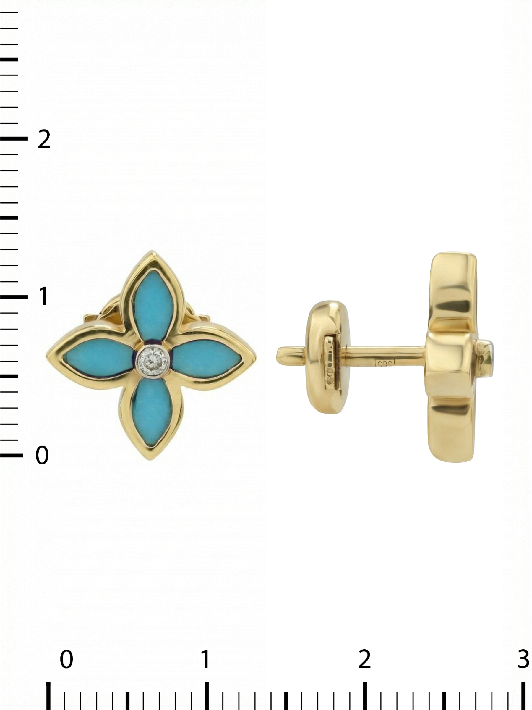 Центральным элементом композиции является чистый белый бриллиант круглой формы, который придает изделию роскошное мерцание. Его яркость подчеркивает нежная бирюза с ее глубоким и притягательным бирюзовым цветом, оформленная в виде стилизованного четырехлистника. Общее количество вставок в изделии составляет 4, что обеспечивает идеальный баланс и выразительность каждой детали. Качественное исполнение и продуманный дизайн делают эти серьги универсальным аксессуаром, который одинаково гармонично подходит как для женщин, так и для мужчин.
