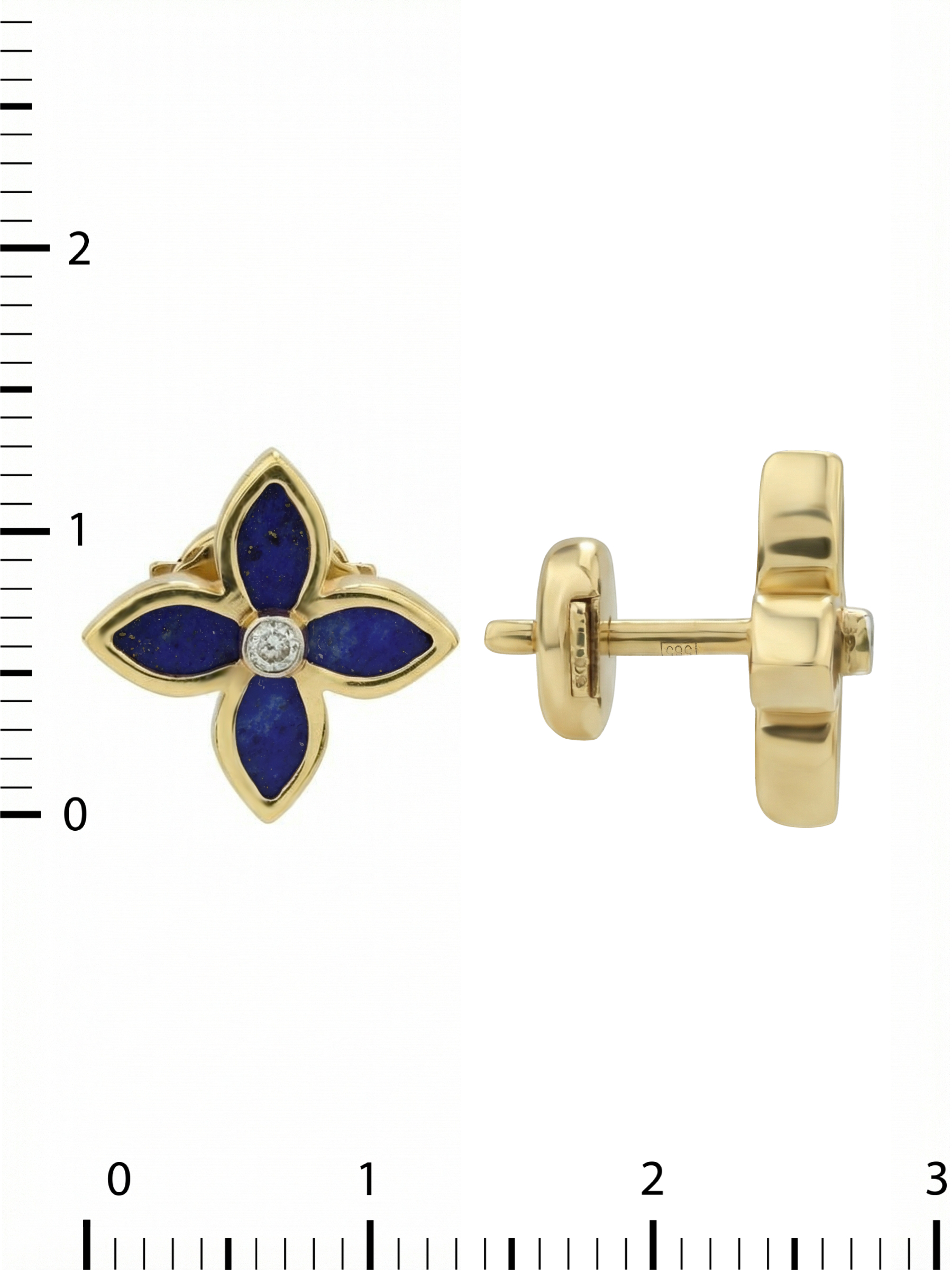 Центральным акцентом композиции выступают два сияющих бриллианта круглой огранки белого цвета, которые окружают лепестки из глубокого синего лазурита. Общее количество вставок составляет четыре, что создает сбалансированный и выразительный образ. Эти серьги — универсальное дополнение ювелирного гардероба, одинаково подходящее как для женщин, так и для мужчин, ценящих премиальные материалы и безупречное исполнение.