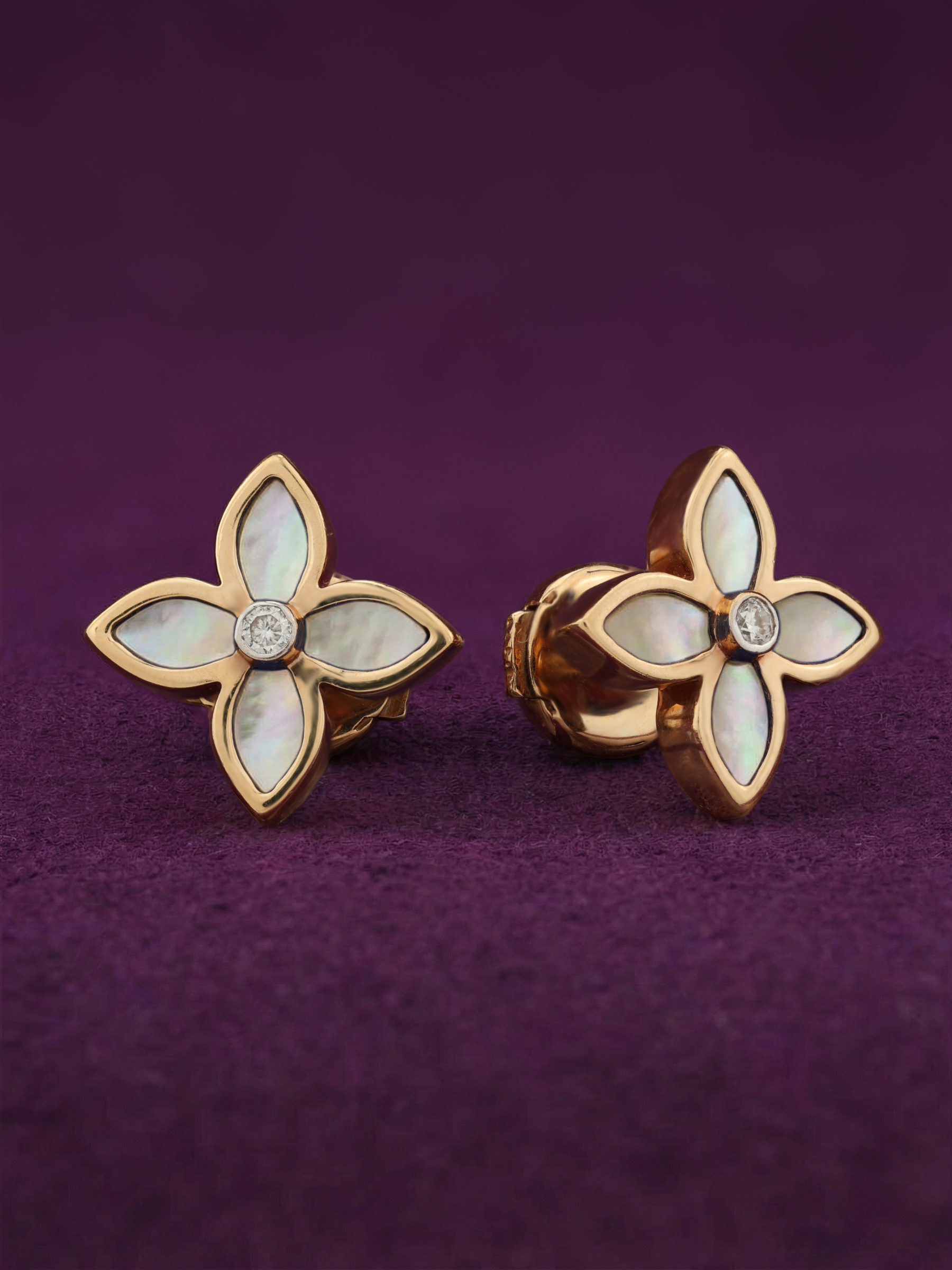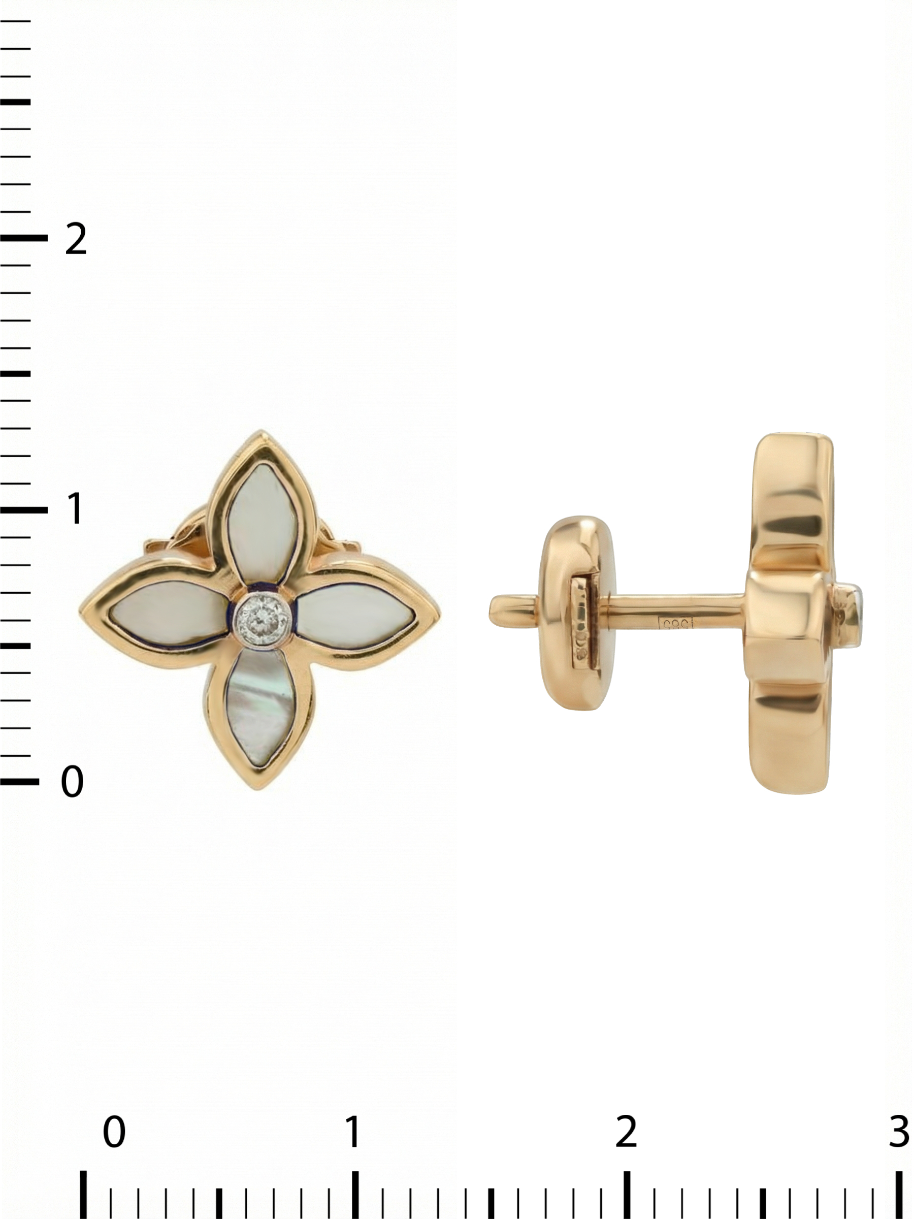 Центральным акцентом композиции стал безупречный бриллиант круглой формы с чистым белым блеском, который притягивает взгляд и подчеркивает роскошь материала. Гармоничным дополнением выступают вставки из натурального перламутра с мягким переливом, создающие нежное сияние. В изделии использовано две вставки, идеально сбалансированные по форме и цветовой гамме: благородный блеск белого бриллианта эффектно контрастирует с деликатным перламутровым оттенком.