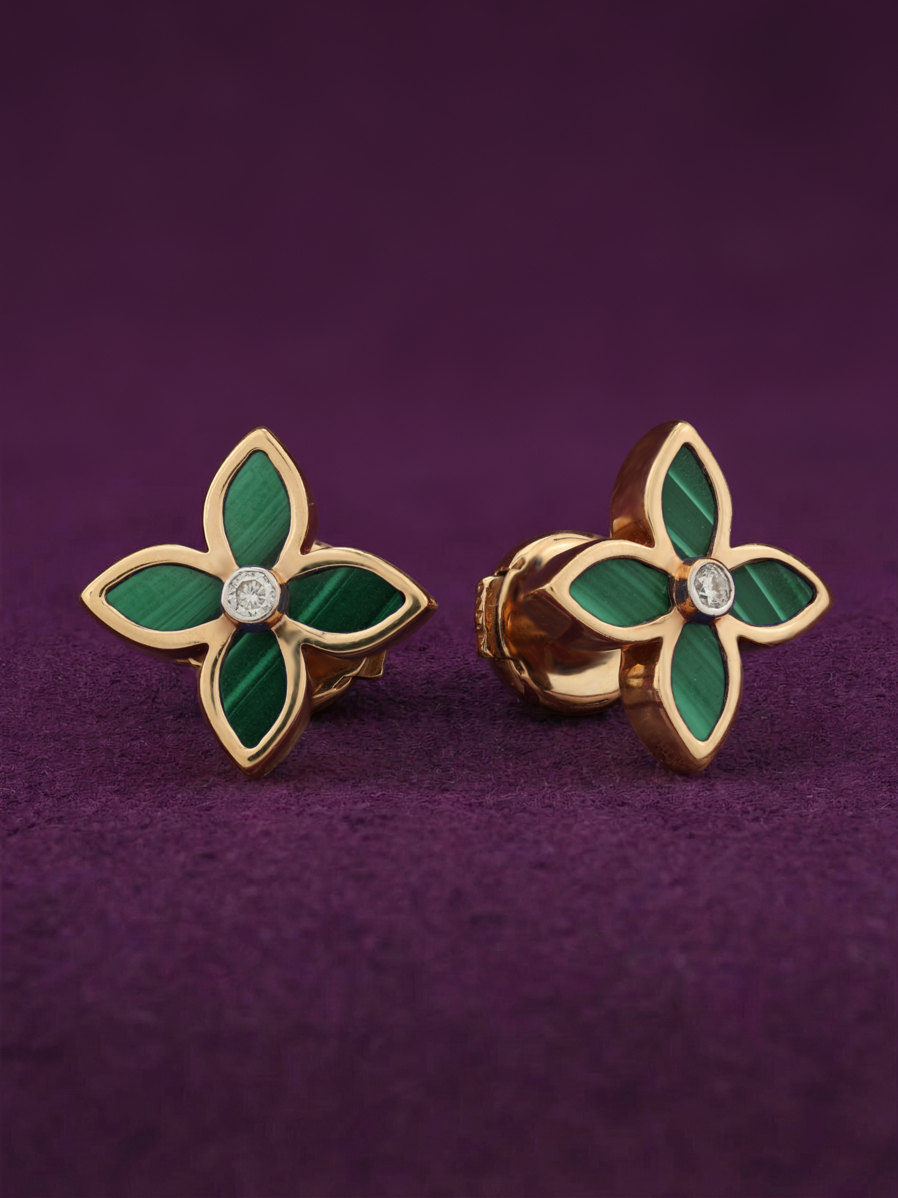 Центральным элементом композиции является вставка круглой формы: сияющий бриллиант белого цвета, окруженный лепестками зеленого малахита. Всего в изделии предусмотрено 4 вставки, которые создают завораживающий контраст между теплотой красного золота и глубиной камня. Дизайн в стиле клевер делает эти серьги универсальным дополнением к любому образу — от строгого делового костюма до вечернего наряда. Лаконичная форма и выверенные линии гарантируют, что украшение станет акцентной деталью, придающей владельцу уверенности и аристократичного шарма.