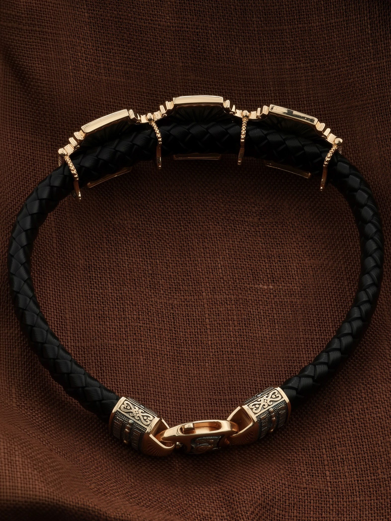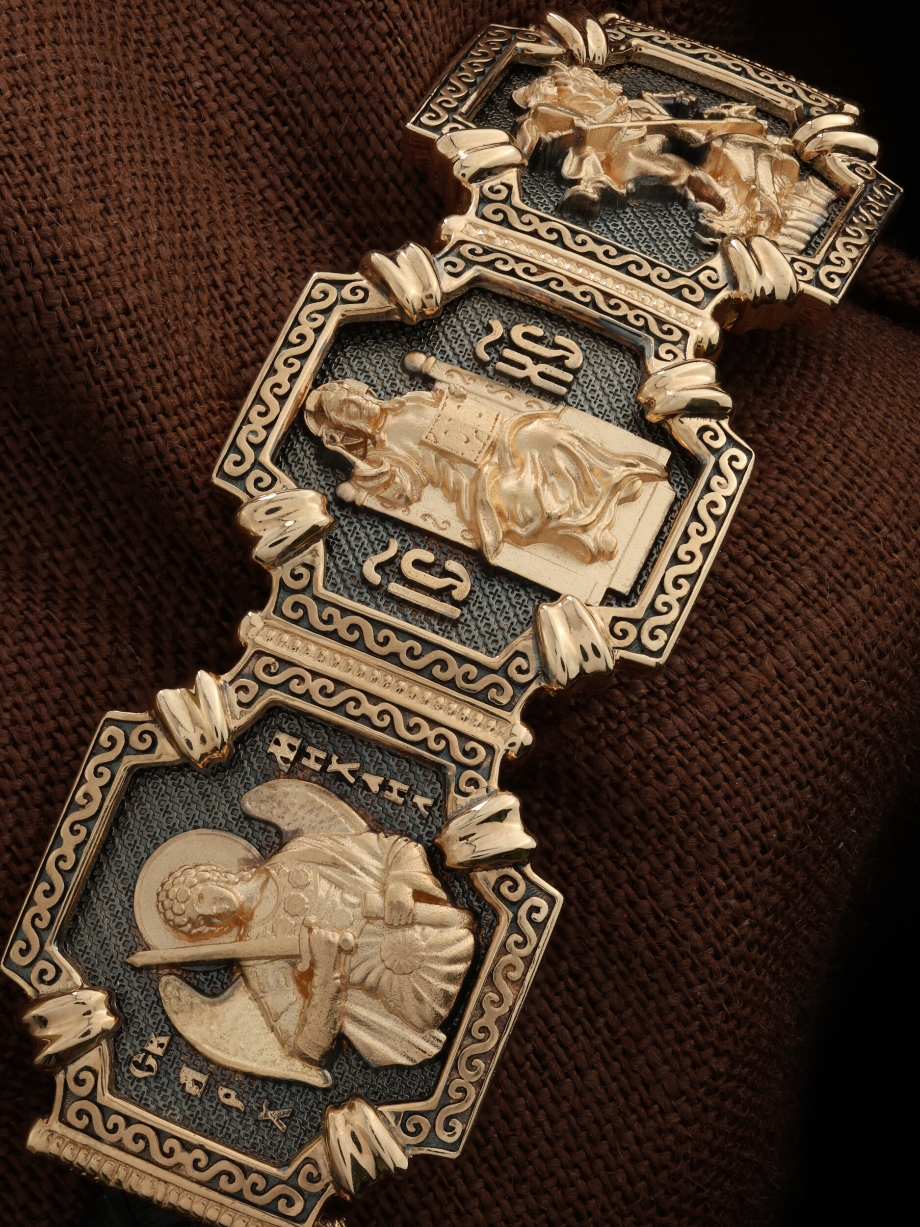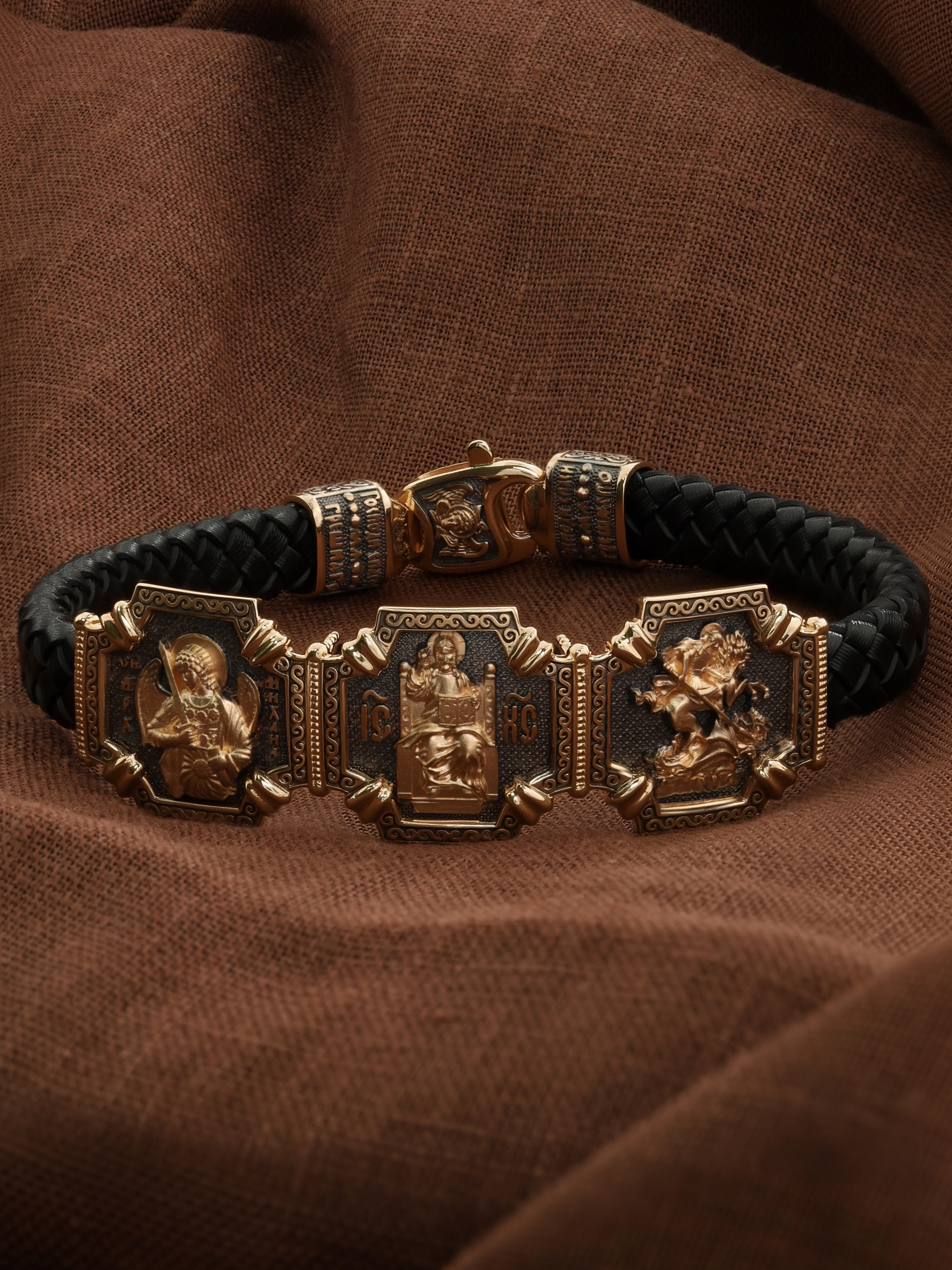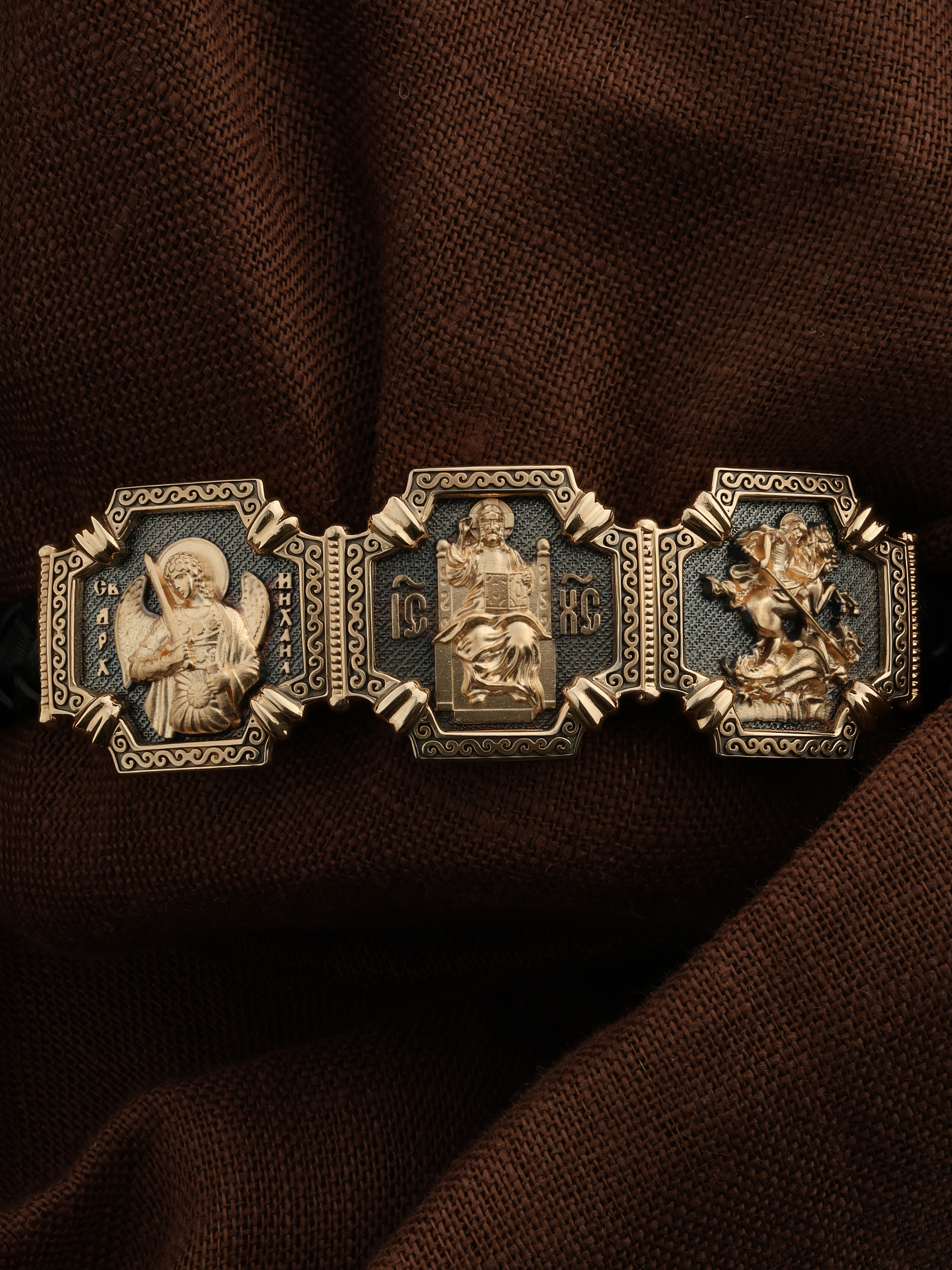 Композиционным центром браслета является Иисус Христос в образе Вседержителя, по-гречески «Пантократор». Это древнейший образ Спасителя, на котором Он представлен как властелин и правитель мира. Христос держит в руках Книгу, которая символизирует Книгу Бытия, то есть весь сотворенный Богом мир. В этой Книге судьбы всех людей, живущих на земле. Слева от образа Вседержителя — икона Архангела Михаила — Архистратига всех Небесных Воинств. Он ведет непримиримую войну против сил зла, охраняет райские врата и защищает души людей. Его имя означает «Кто яко Бог?», так как он самый могучий и грозный враг зла. Он первым ополчился на Денницу, когда тот восстал против Бога, низверг его с Неба и не перестает сражаться с его темным воинством. Поэтому он часто изображается в виде воина, в доспехах и с огненным мечом. Справа от образа Вседержителя — Великомученик Георгий Победоносец. Образ Великомученика считают одним из наиболее чтимых святынь в Святыни Православных, он олицетворяет собой заступника для верующих, чья жизнь имеет какое-либо отношение к военным делам, также он может оберегать и землевладельцев. Одно из самых великих чудес которое сотворил Великомученик так это — спасения всего города от устрашающего змия. Молитвами и своей непреклонной верой, взываемой к Всевышнему, он смог одолеть чудовище. Святой убил змея, спас жителей и их души от влияния дьявола, породив в них надежду и веру в Господа, призывая людей принять христианскую веру. Поскольку при жизни Святой Георгий был военным, он считается покровителем всех, кто имеет отношение к армии — военнослужащим, участникам боевых действий. Молитва перед иконой Георгия Победоносца поможет защититься от врагов, одержать победу в сражении (военном, спортивном, духовной брани с дьяволом), содействие в установлении мир