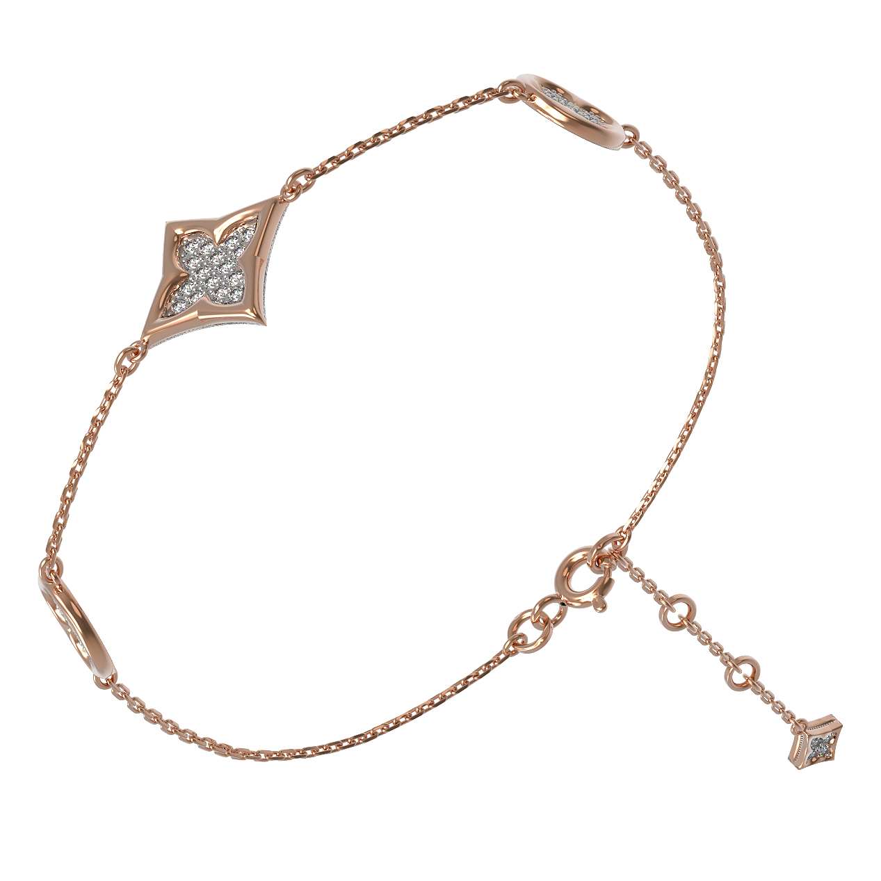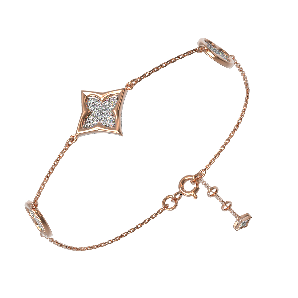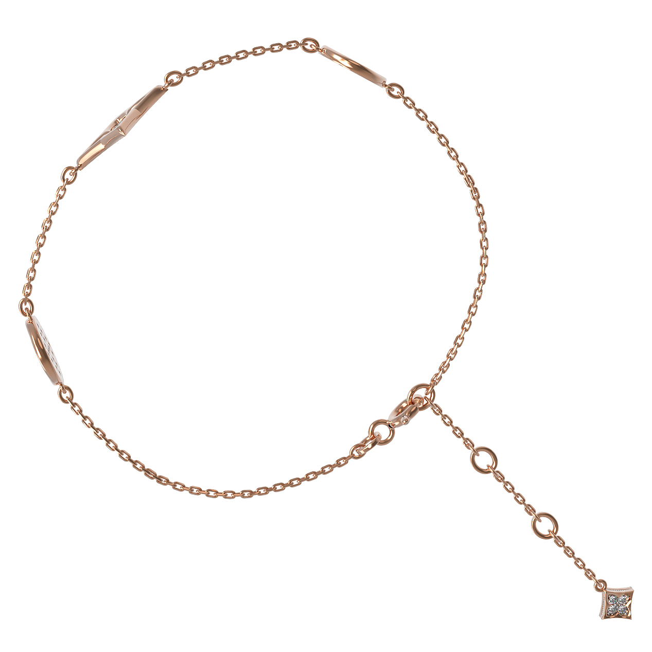 Особую ценность украшению придает инкрустация бриллиантами. В изделии использовано 54 вставки белого цвета круглой формы, которые эффектно сияют при каждом движении, притягивая восхищенные взгляды. Качественное красное золото теплого оттенка идеально сочетается с холодным блеском драгоценных камней, создавая изысканный контраст. Браслет обладает продуманной конструкцией, обеспечивающей комфортное ношение в течение дня.