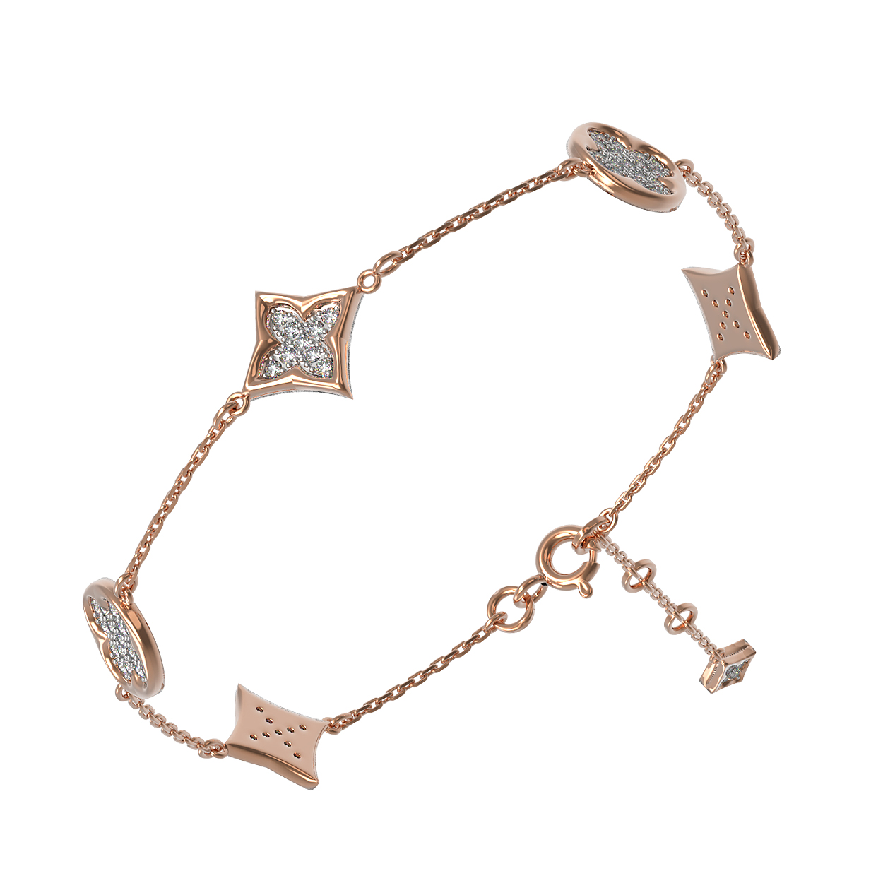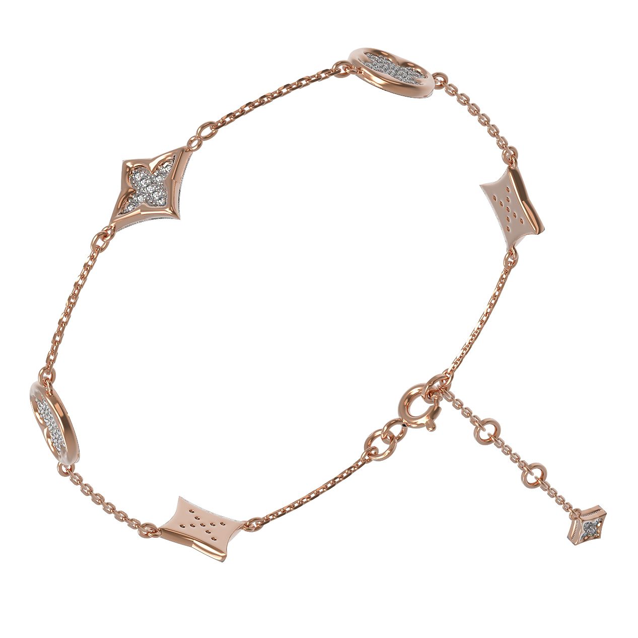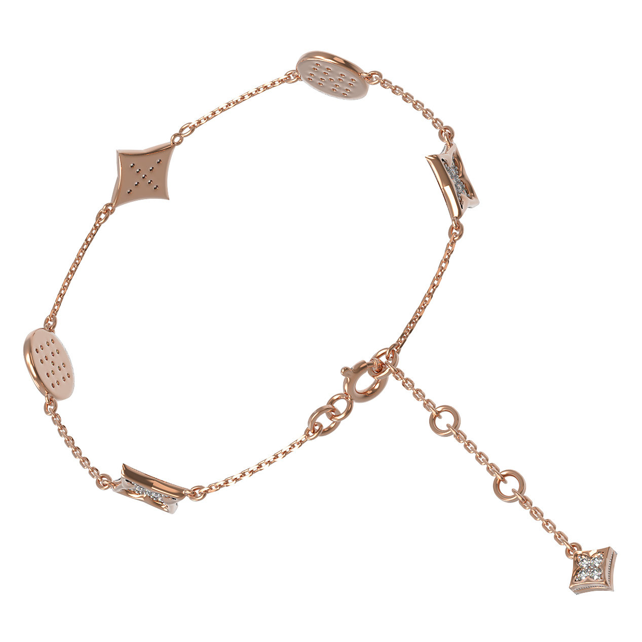 Изящный браслет из коллекции De Luxe — Амальфи — Бриллианты воплощает эстетику утонченности и высокого ювелирного мастерства. Это украшение выполнено из красного золота 585 пробы, чей теплый оттенок идеально гармонирует с сиянием драгоценных вставок. Дизайн изделия вдохновлен лаконичной формой клевера, что придает аксессуару нотки романтики и символичности. Изысканная композиция включает 65 бриллиантов круглой огранки с безупречным белым цветом, которые создают завораживающую игру света при каждом движении.