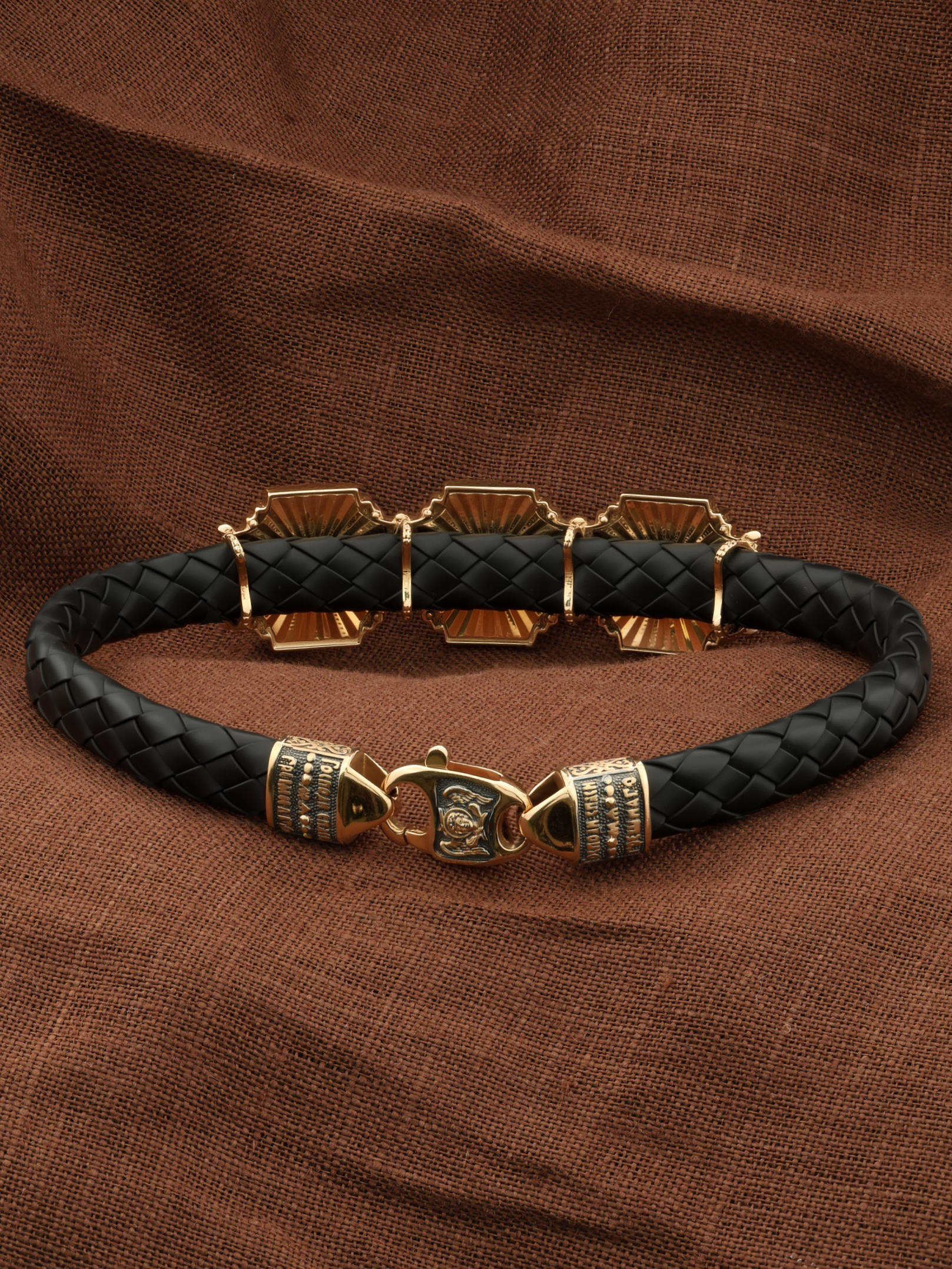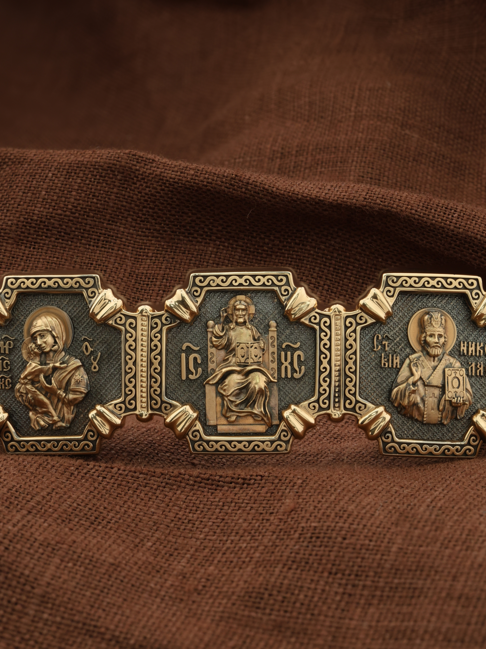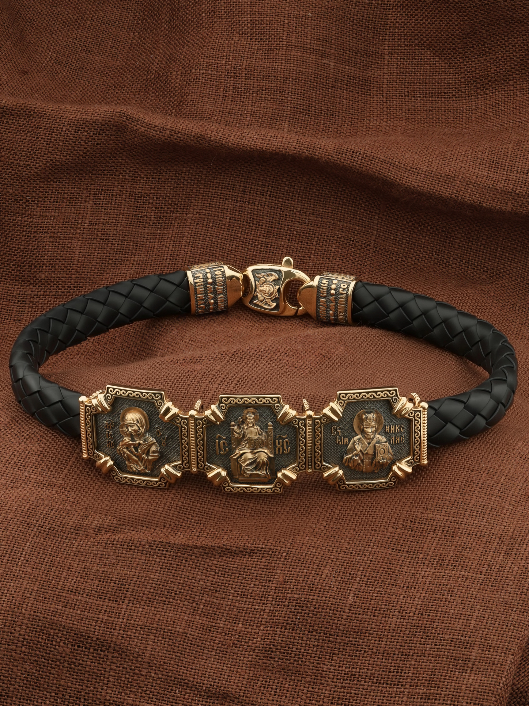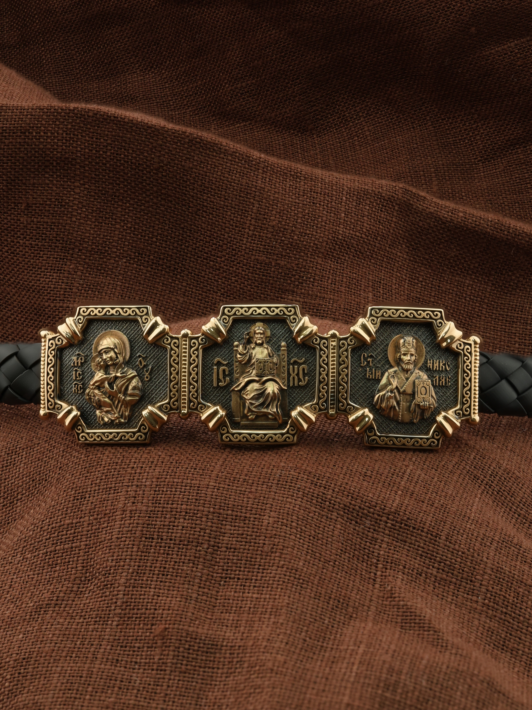 Композиционным центром браслета является Иисус Христос в образе Вседержителя. Это древнейший образ Спасителя, на котором Он представлен как властелин и правитель мира. Христос держит в руках Книгу, которая символизирует Книгу Бытия. В этой Книге судьбы всех людей, живущих на земле. Слева от образа Вседержителя — Владимирская икона Божией Матери. По преданию, была написана на доске трапезного стола из дома Иисуса Христа. На Русь Владимирская икона Божией Матери была привезена в начале XII века и с тех пор почитается как главная святыня нашего Отечества. Перед ней молитвенно просят Богородицу об исцелении от телесных недугов, в частности, заболеваний сердца и сердечнососудистой системы. За помощью к ней обращаются во время бедствий, когда нуждаются в защите от врагов. Справа от образа Вседержителя изображена икона Святого Николая Чудотворца. Живший в III веке епископ Ликийского города Миры — самый почитаемый святой не только в России, но и во всем мире. Николай Чудотворец — помощник в делах, защитник путешествующих, покровитель учащихся, утешитель обиженных и нуждающихся, целитель самых страшных и тяжелых недугов, представитель и молитвенник за людей перед Богом.