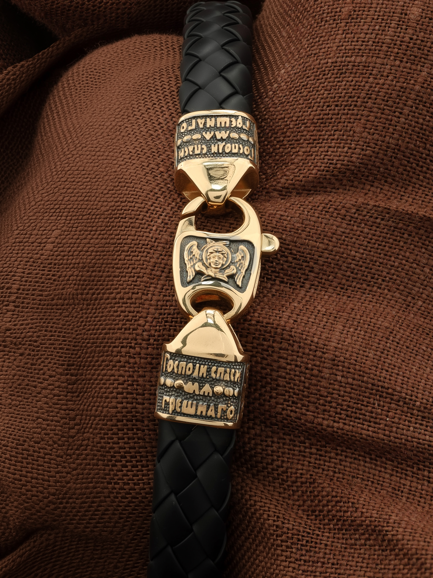 На концевиках расположена молитва: «Господи, спаси мя грешного». Соединяет концевики замочек-карабин, на котором изображен шестикрылый Серафим.
