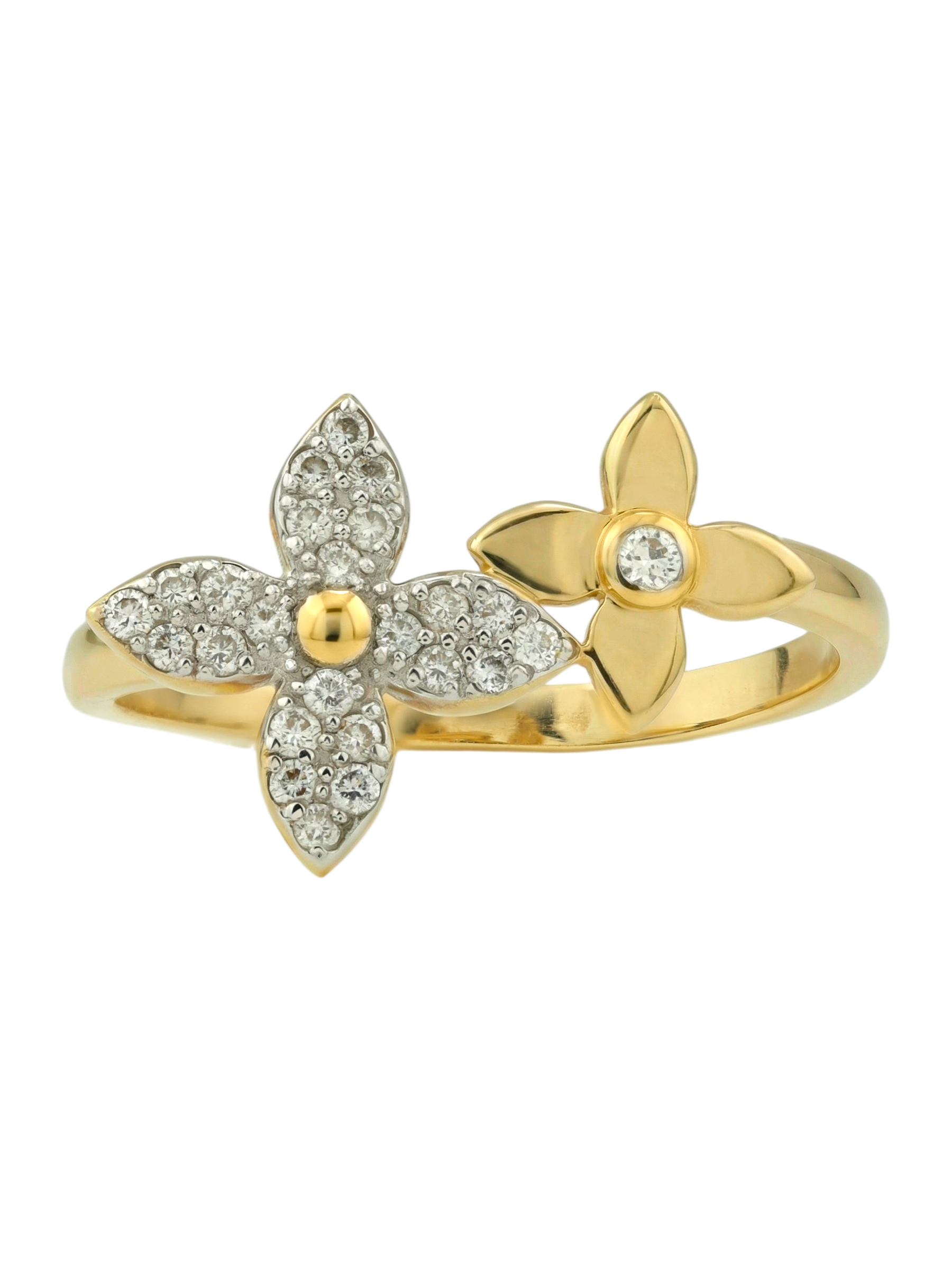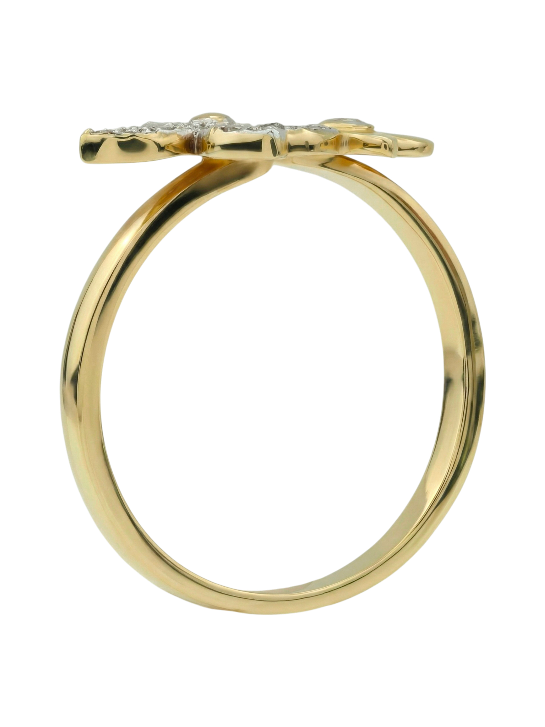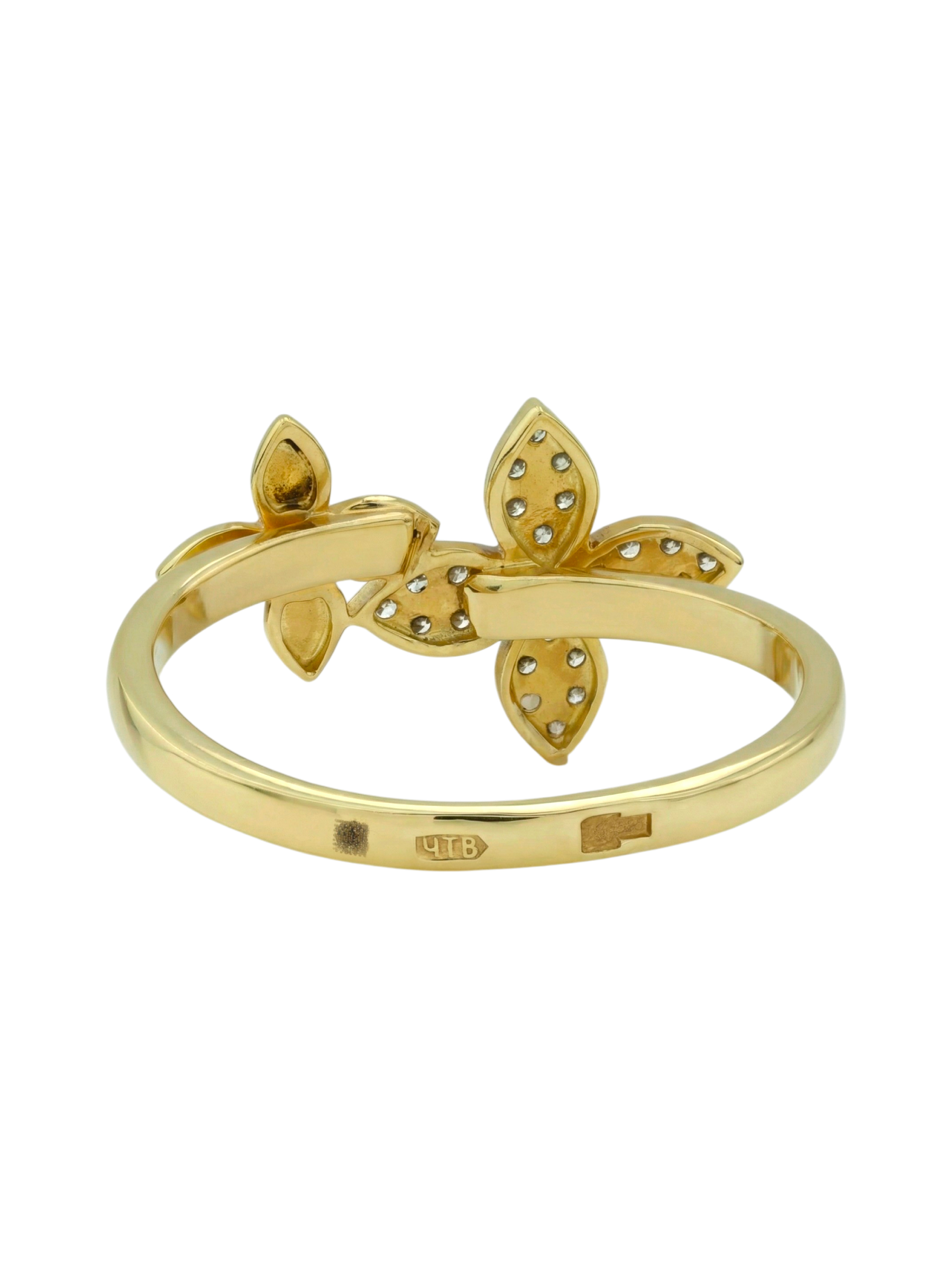 Элегантное кольцо из лимонного золота 585 пробы станет изысканным акцентом вашего образа. Дизайн украшения, выполненный в форме нежного клевера, притягивает взгляды и подчеркивает утонченный вкус своего владельца. Декоративный элемент инкрустирован 25 бриллиантами круглой формы с классическим белым цветом вставок, которые восхитительно играют на свету, придавая изделию благородное сияние.