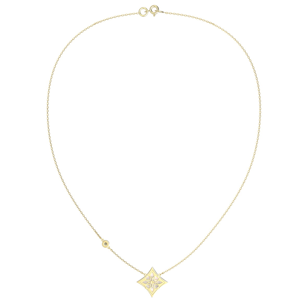 Всего в изделии предусмотрено 4 вставки разной формы: круг и ромб, что придает колье особую выразительность и глубину. Лаконичная цепочка с дополнением в виде аккуратного бриллианта подчеркивает линию шеи. Универсальный дизайн позволяет носить украшение как женщинам, так и мужчинам, дополняя повседневные или вечерние ансамбли. Колье доступно в двух вариантах длины — 40 и 45 см, что позволяет подобрать идеальную посадку.