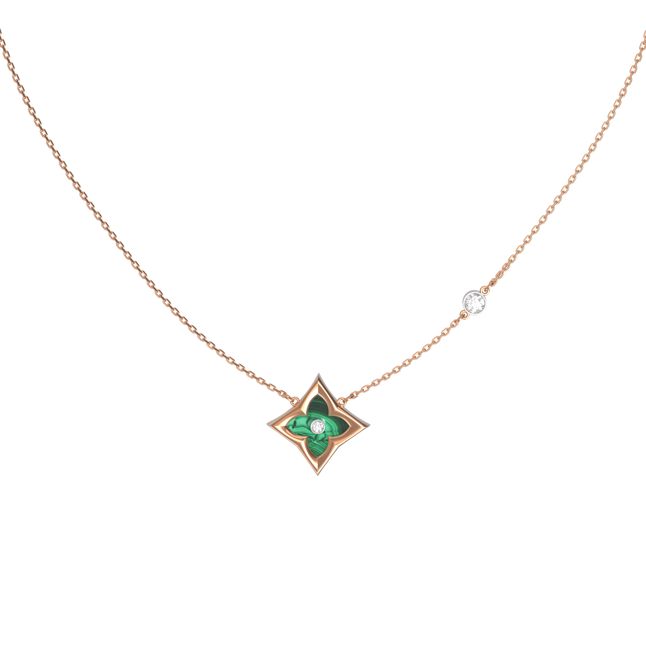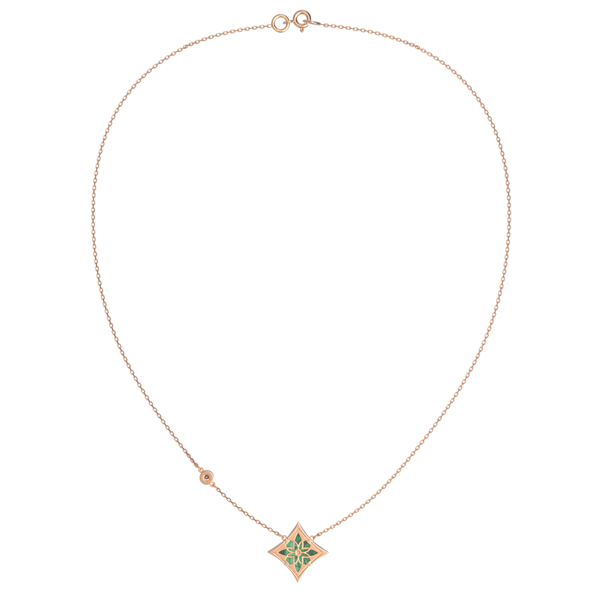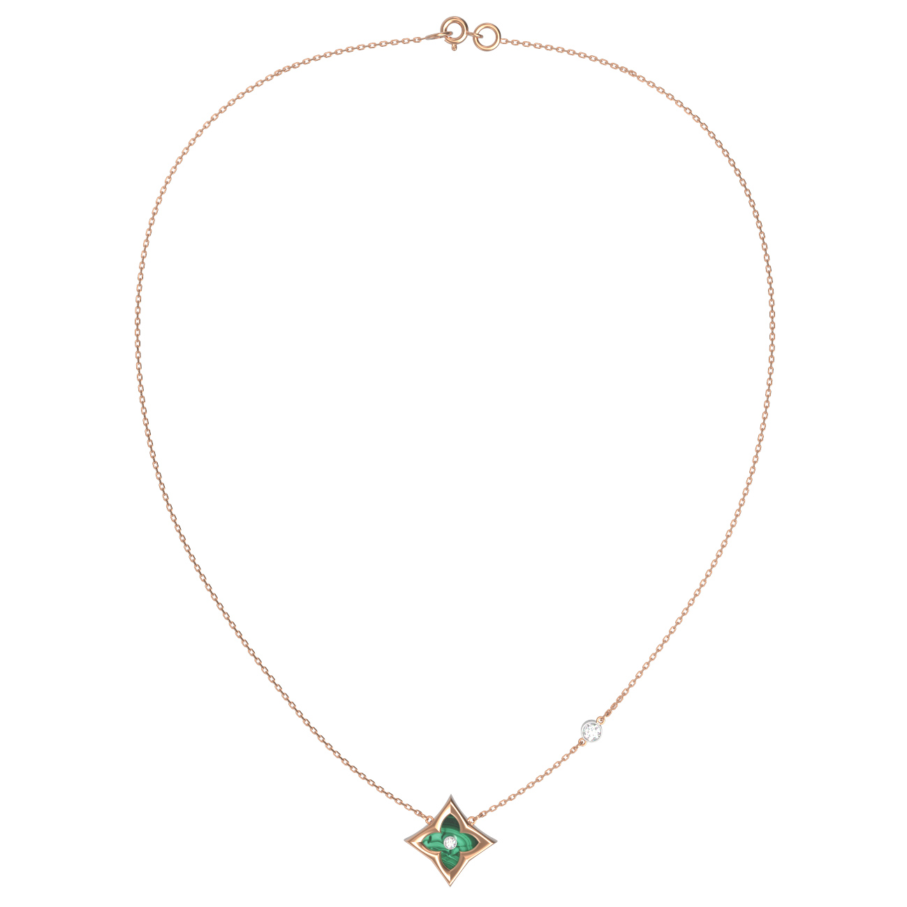 Колье из красного золота 585 пробы — это воплощение утонченного стиля и глубокого смысла. Украшение из коллекции De Luxe — Амальфи — Бриллианты привлекает внимание своим изысканным дизайном в форме клевера, который традиционно считается символом удачи. Мастерское сочетание материалов подчеркивает благородство изделия: насыщенный зеленый цвет малахита в форме ромба гармонично дополняется ярким блеском белых бриллиантов круглой огранки.