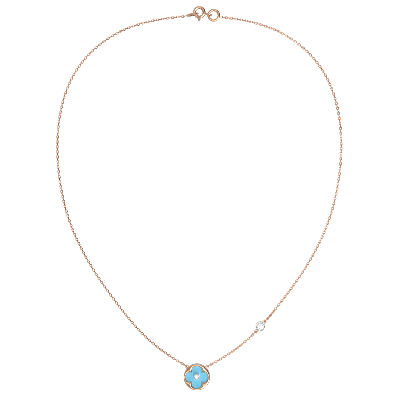 В центре композиции расположена бирюза небесно-голубого цвета, эффектно дополненная сияющим бриллиантом. Общее количество вставок составляет 6 штук, среди которых представлены как круглые бриллианты белого цвета, так и выразительные вставки бирюзового оттенка. Такое сочетание материалов придает колье особую эстетику и глубину.