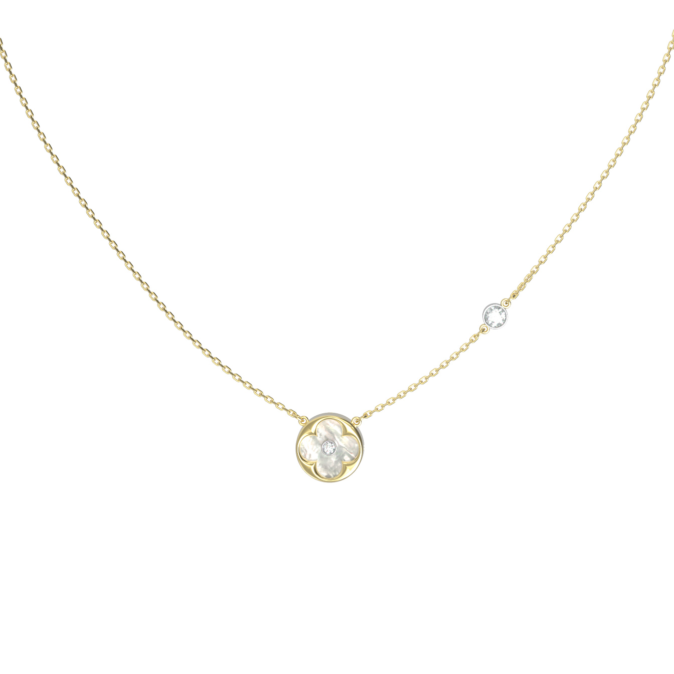 Элегантное колье из лимонного золота 585 пробы станет утонченным акцентом вашего образа. Дизайн украшения, выполненный в популярном стиле клевер, придает изделию особое очарование и символичность. В центре внимания — нежное сочетание классического лимонного золота с перламутром и сияющими бриллиантами, что делает аксессуар универсальным дополнением как для дневного, так и для вечернего наряда.
