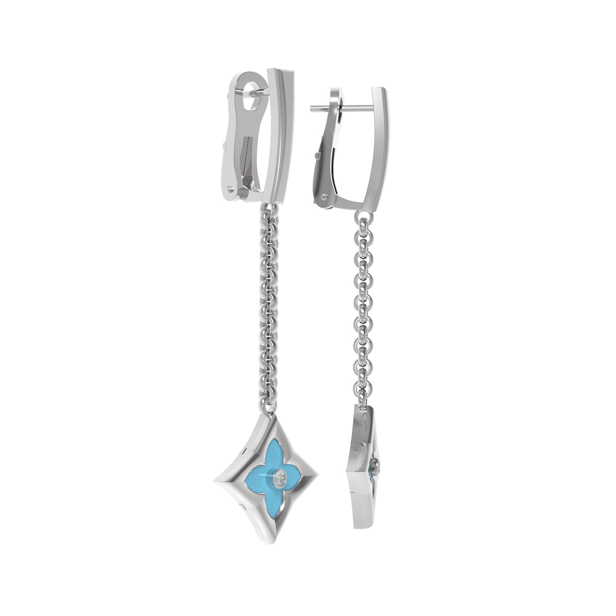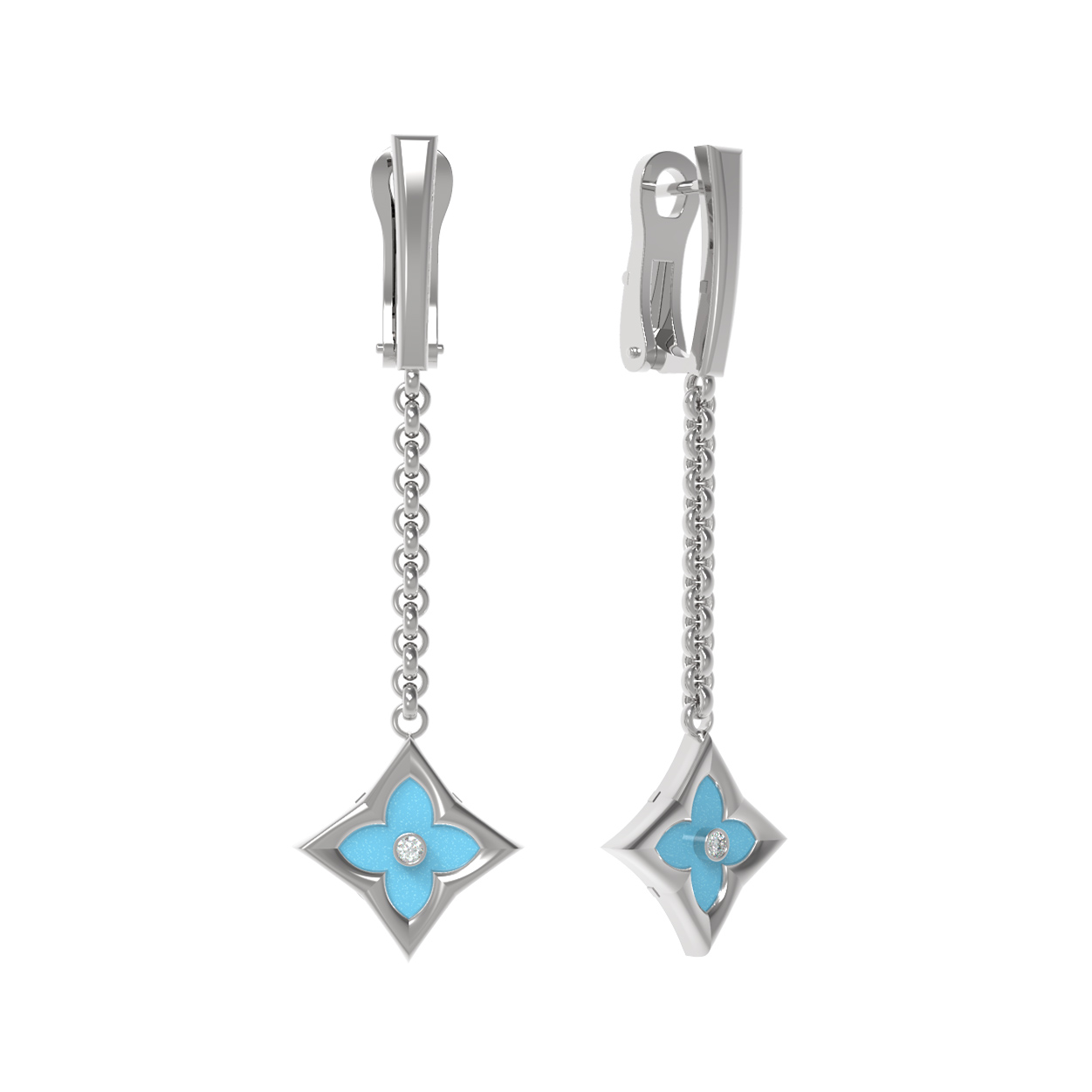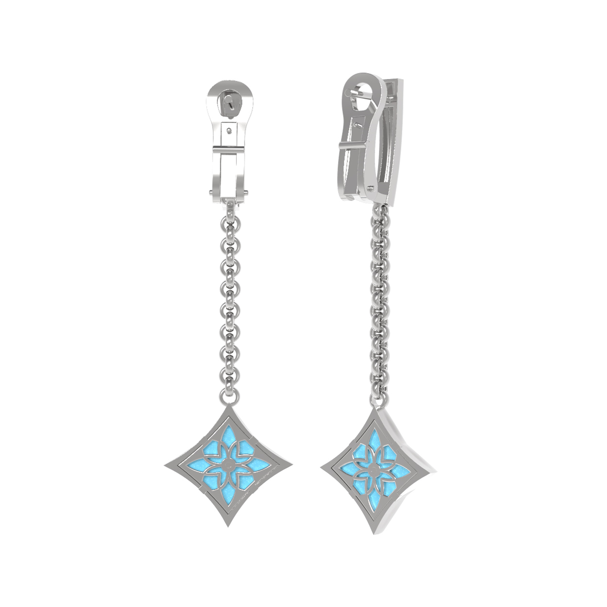 Особое внимание привлекает сочетание вставок: насыщенный бирюзовый цвет камней в форме ромба идеально дополняется сиянием бриллиантов круглой огранки. Всего в украшении использованы 4 вставки, которые создают неповторимую игру света и цвета. Холодный блеск белого золота подчеркивает чистоту белых бриллиантов и глубину небесного оттенка бирюзы. Такие серьги универсальны — они прекрасно подойдут как для женщин, так и для мужчин, предпочитающих изящные и стильные аксессуары.