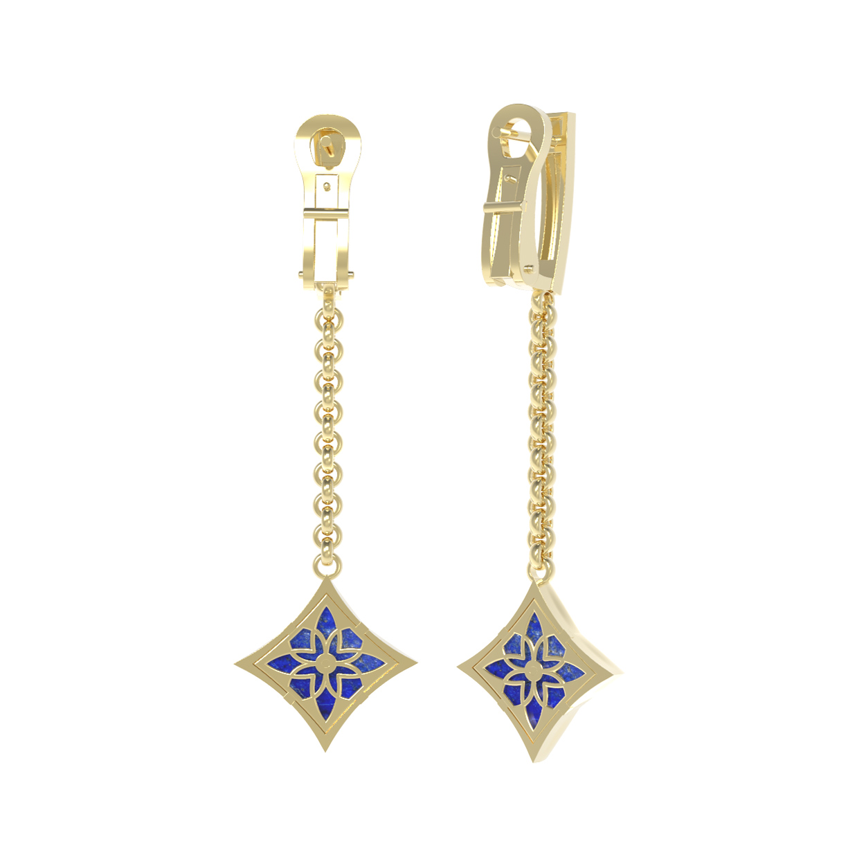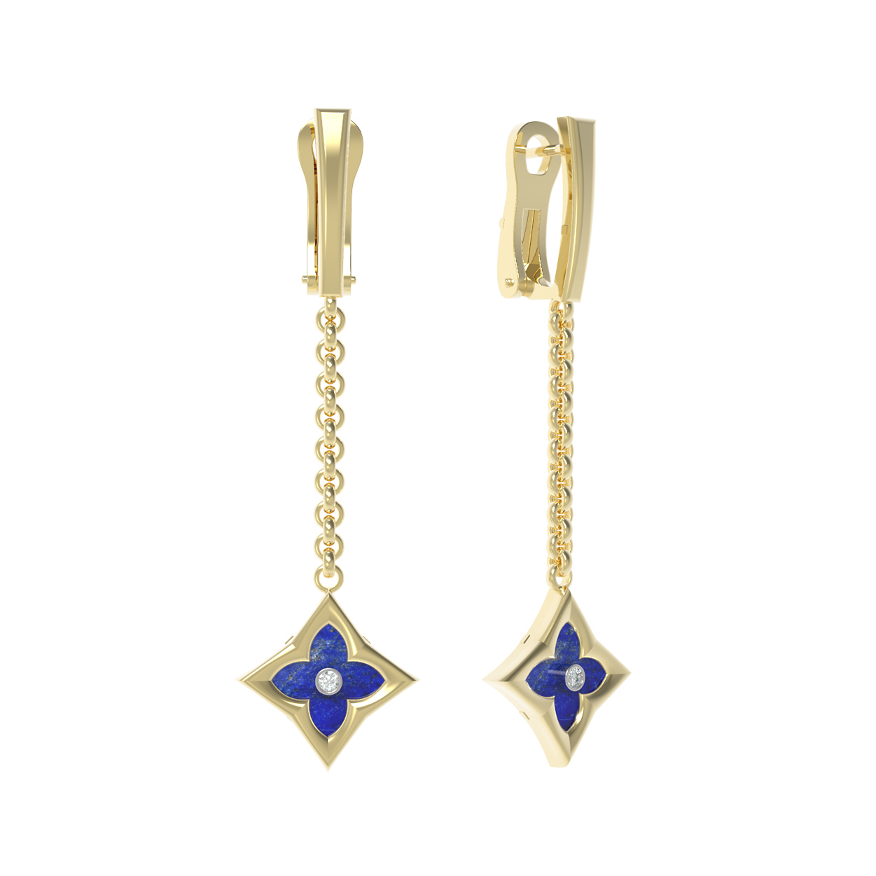 Элегантные серьги из лимонного золота 585 пробы из коллекции De Luxe — Амальфи — Бриллианты станут безупречным акцентом вашего образа. Дизайн украшения выполнен в изящной форме клевера, что придает изделию особое очарование и символичность. Подвесная часть, закрепленная на надежной цепочке, эффектно качается при каждом движении, притягивая взгляды окружающих. В центре композиции расположены четыре вставки: синий лазурит в форме ромба и сверкающий белый бриллиант круглой огранки, гармонично дополняющие друг друга.