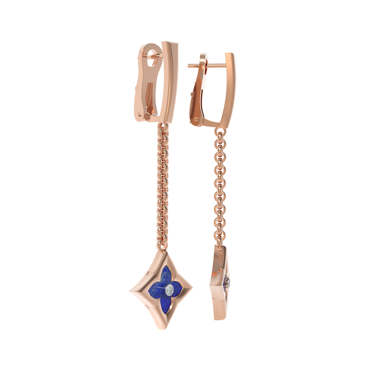 Центральным элементом композиции является вставка в форме ромба, внутри которой гармонично расположился глубокий синий лазурит. Контрастный тандем дополняет яркий белый бриллиант круглой огранки, который играет бликами света при любом освещении. Всего в изделии использованы 4 вставки, создающие завершенный и выразительный облик. Красное золото придает украшению теплое сияние, которое идеально сочетается с холодным блеском камней.