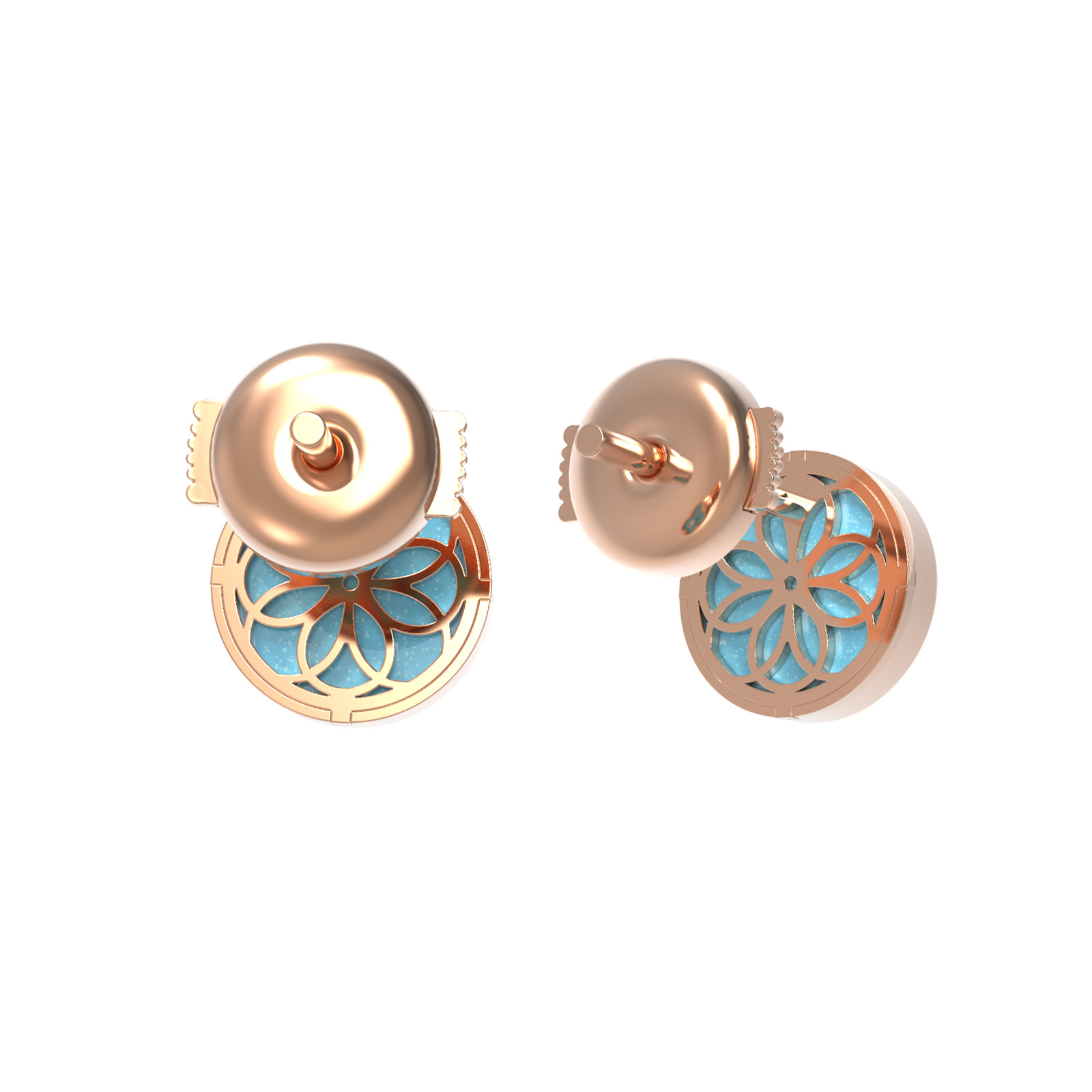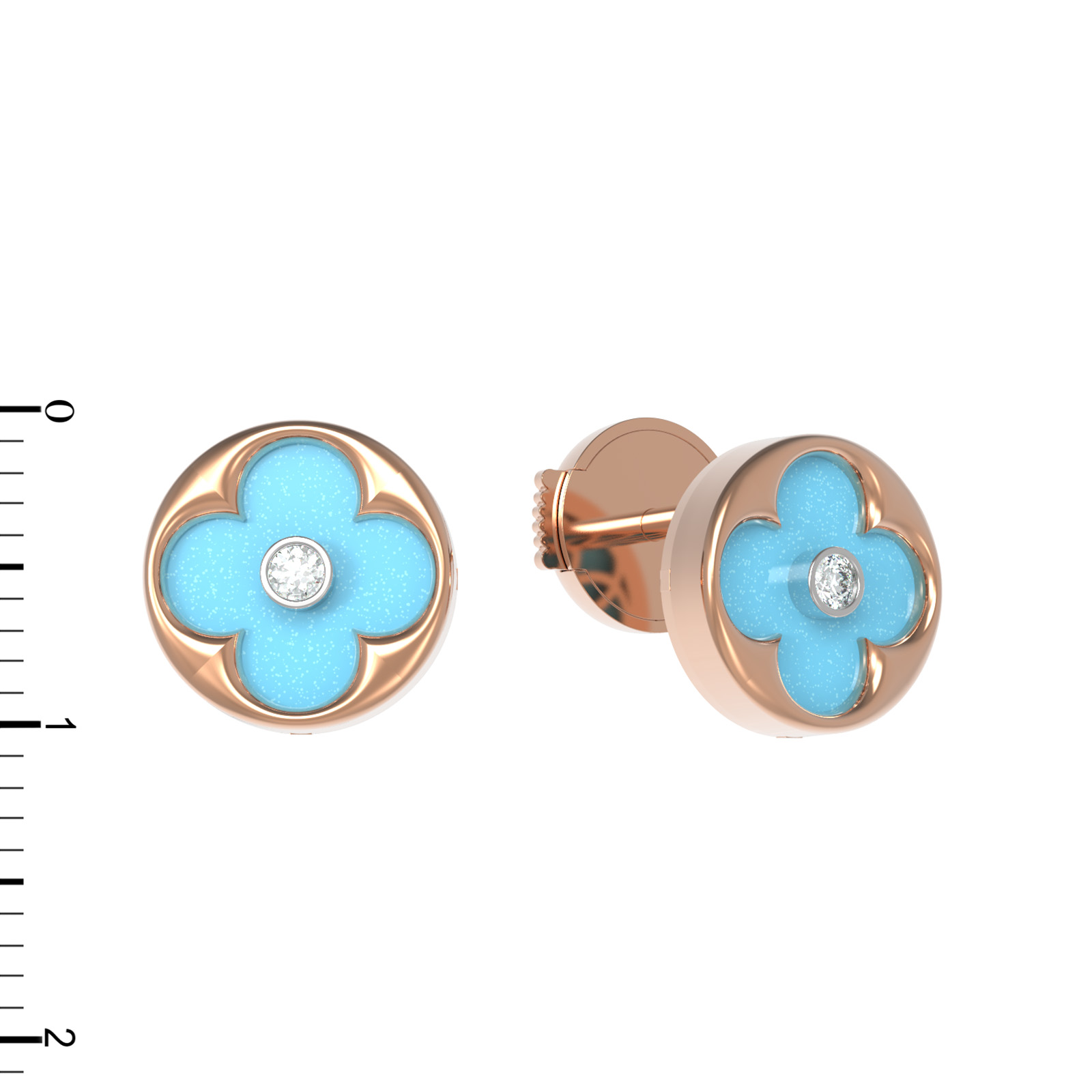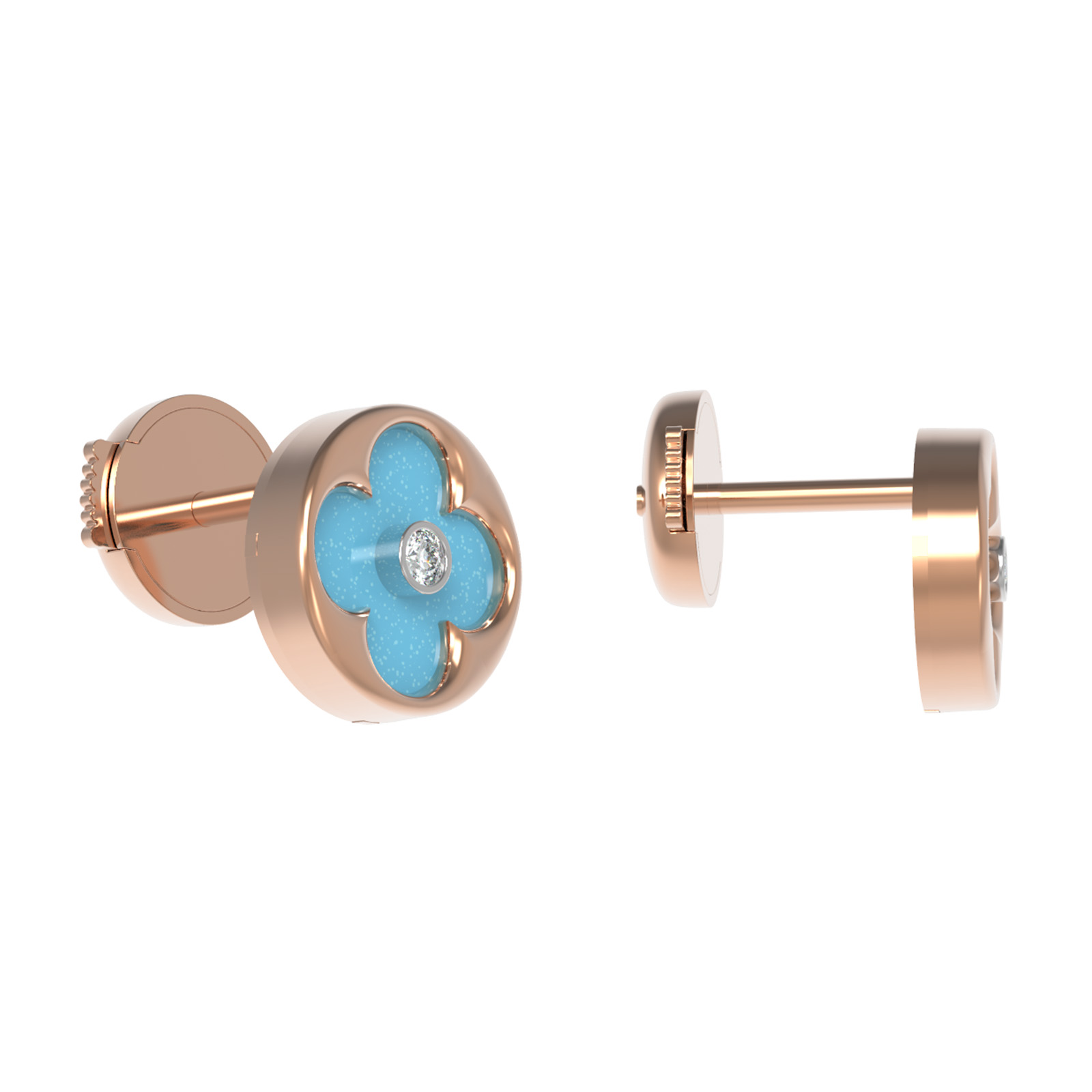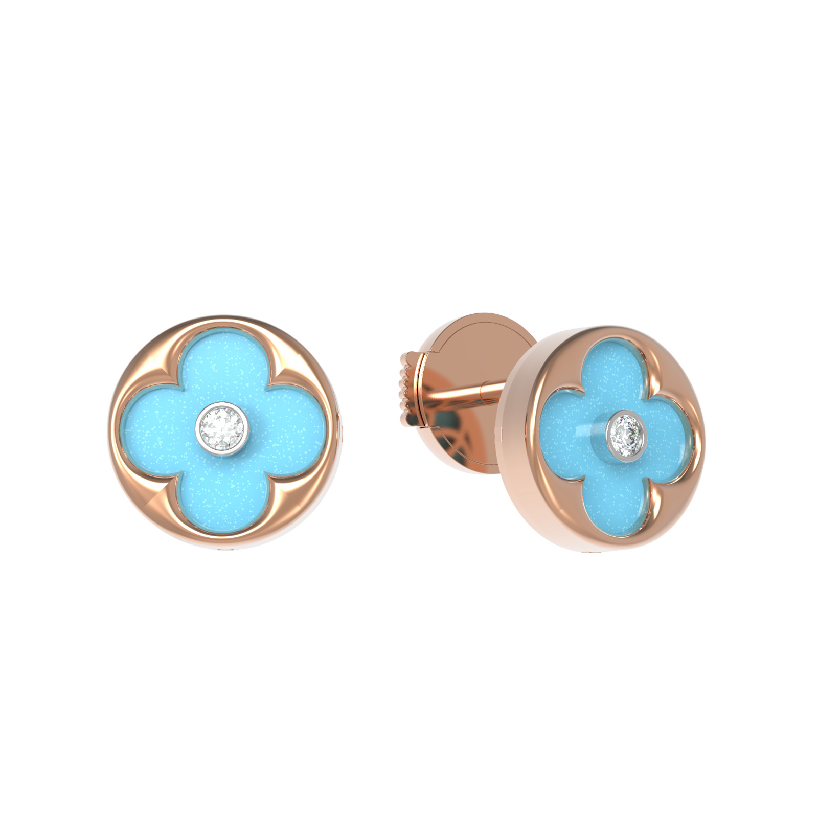 Центральным элементом композиции является насыщенная бирюза с ее небесно-голубым цветом, которая эффектно подчеркивает сияние драгоценных камней. В каждой серьге расположена инкрустация круглым бриллиантом с чистым белым цветом, создающим изысканный контраст с бирюзовым оттенком. Всего в изделии использовано 4 вставки, которые мастерски объединены в гармоничную форму клевера.