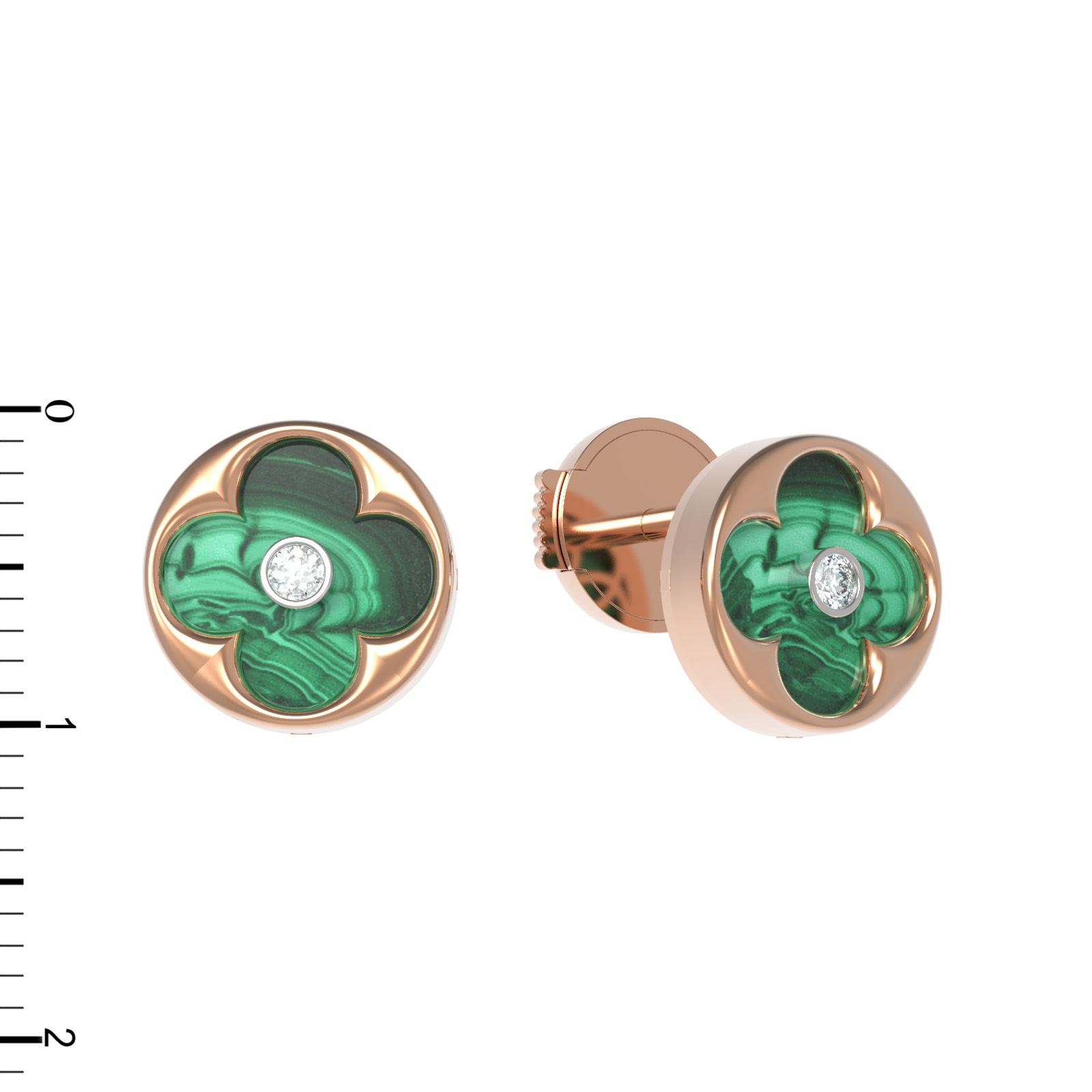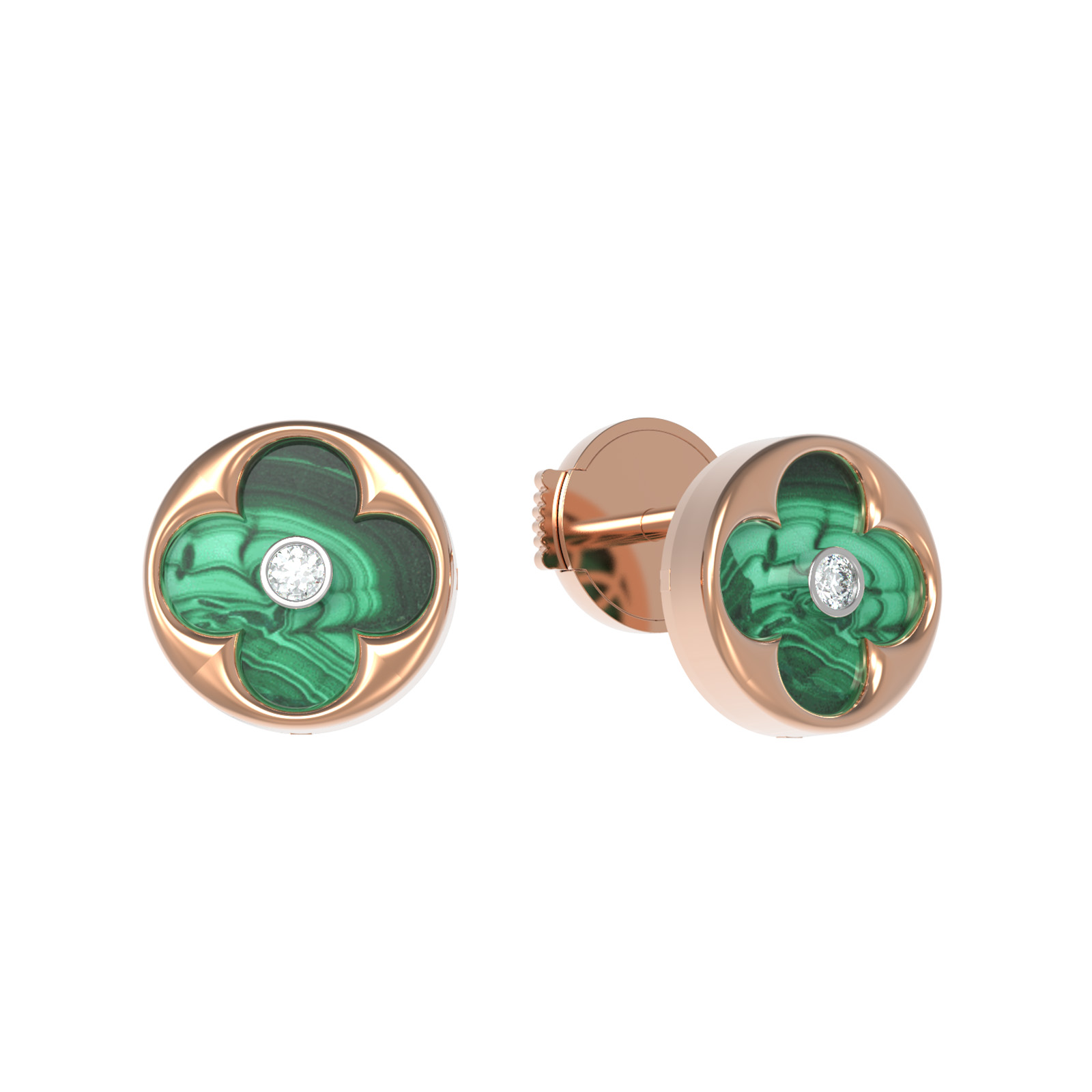 В центре композиции расположен насыщенный зеленый малахит, чей уникальный природный рисунок эффектно контрастирует с теплым блеском красного золота. Вставки круглой формы подчеркнуты сиянием белых бриллиантов, расположенных в самом сердце каждого клевера. Общее количество вставок составляет 4 штуки, что создает сбалансированный и выразительный образ.