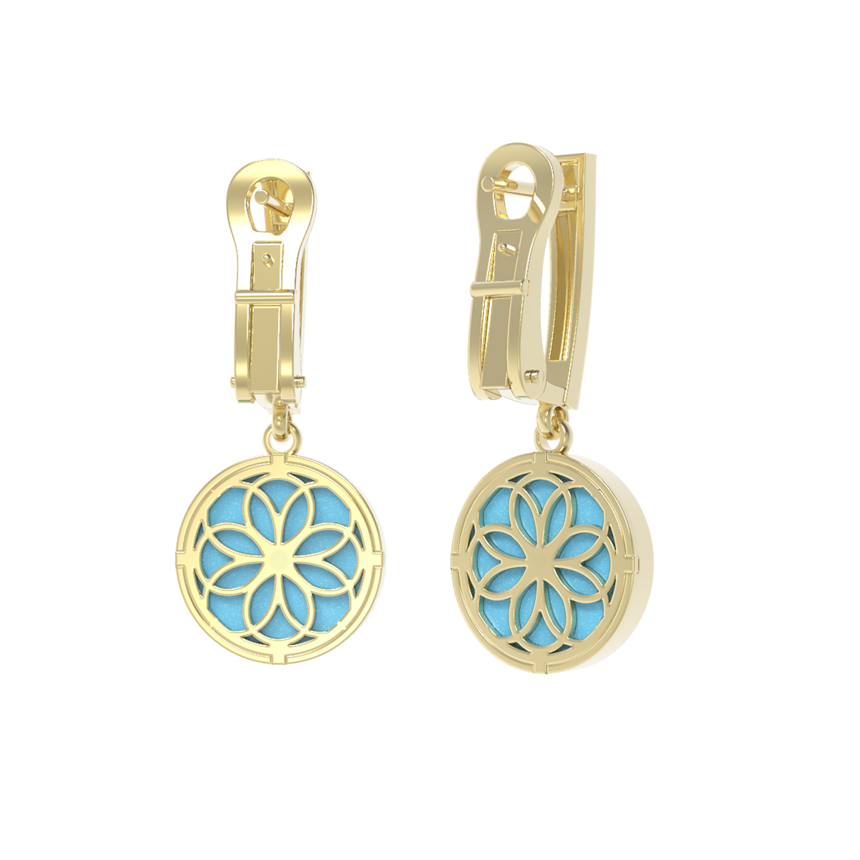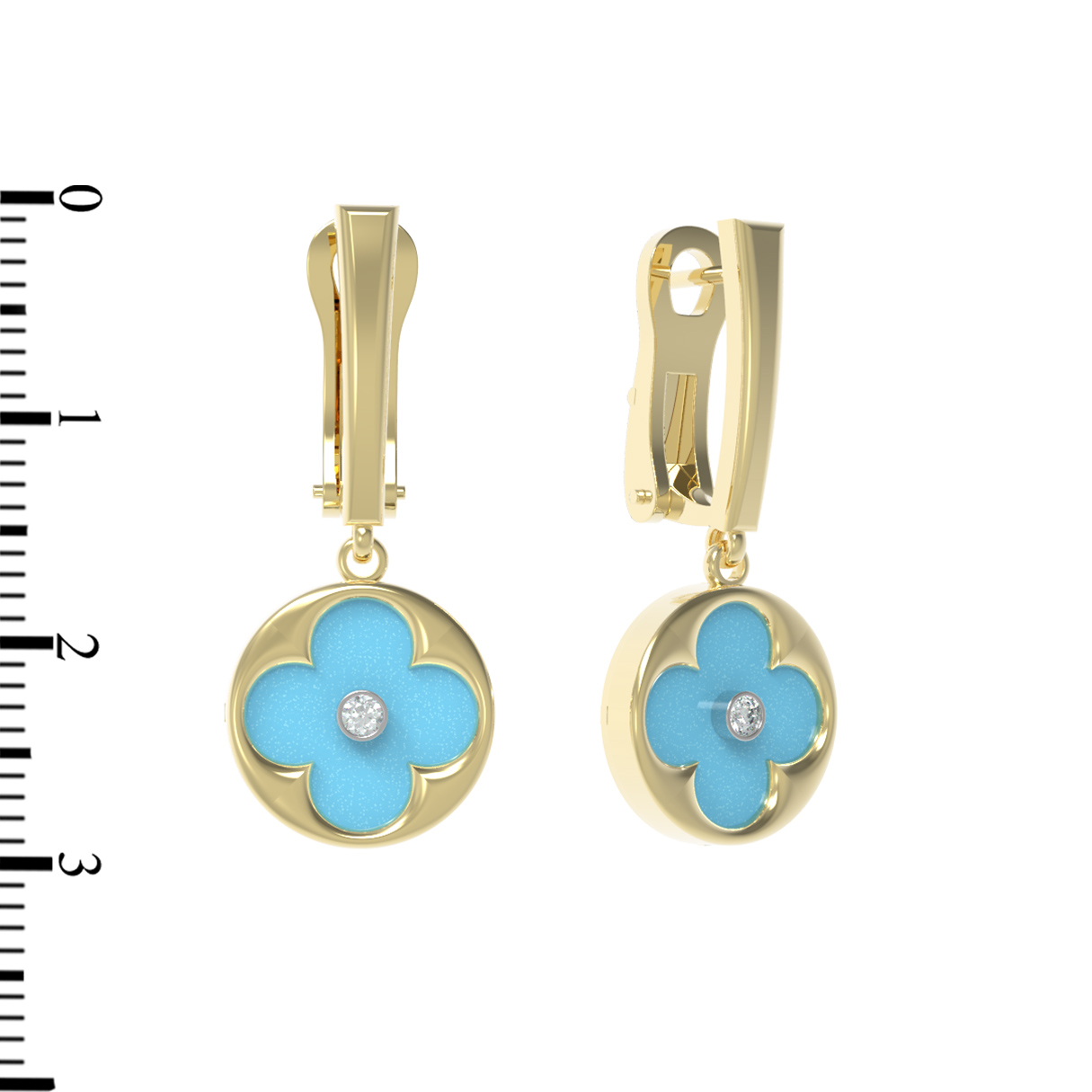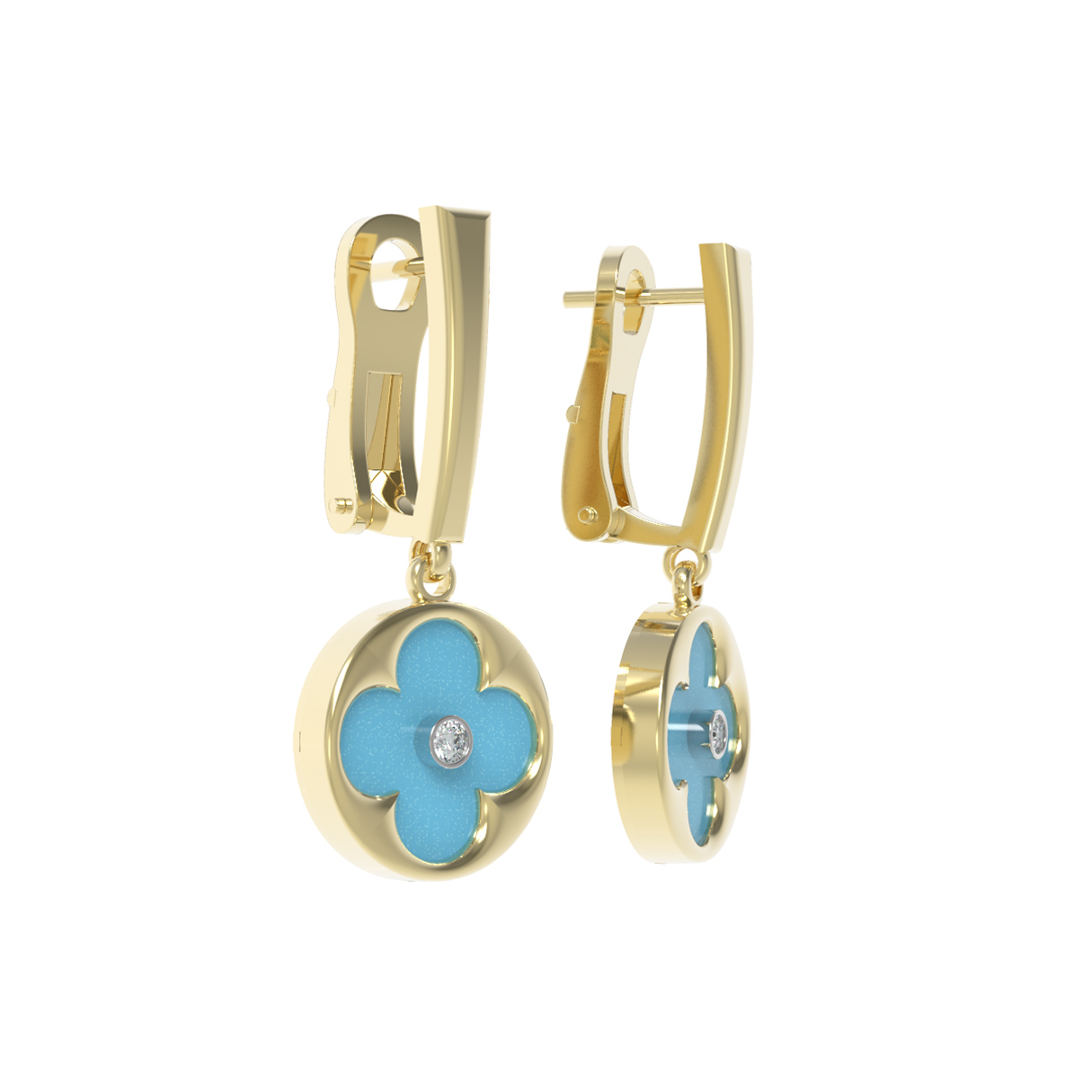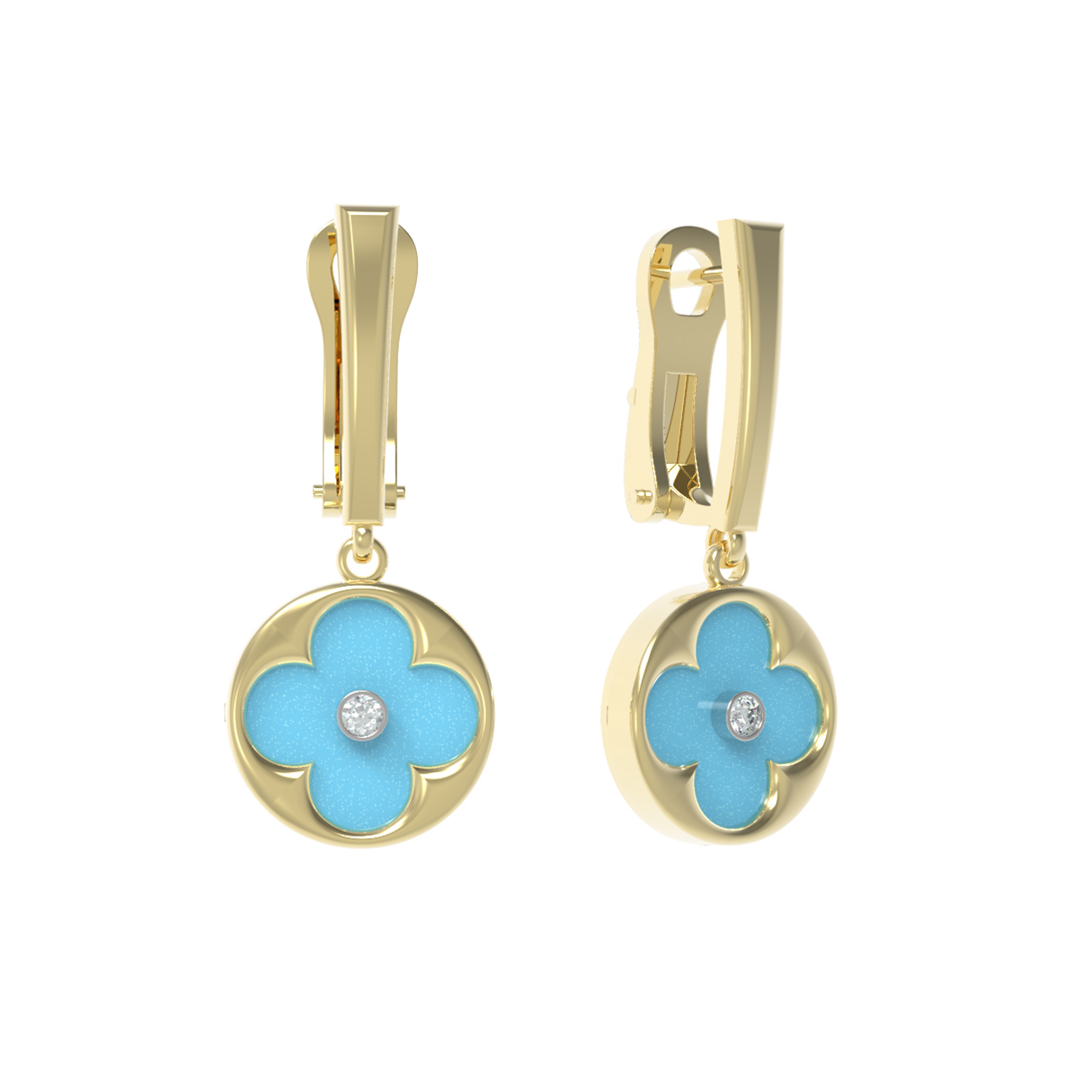 В этой модели использованы четыре вставки круглой формы: небесно-голубой оттенок бирюзы подчеркивает теплое сияние лимонного золота, а белый блеск бриллианта придает изделию роскошное свечение. Такие серьги универсальны — они подходят как для женщин, так и для мужчин, предпочитающих стильные и качественные ювелирные украшения. Лаконичная и продуманная конструкция серег обеспечивает комфорт при ношении и привлекает внимание своей эстетичностью.