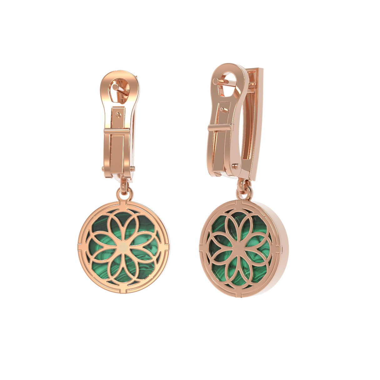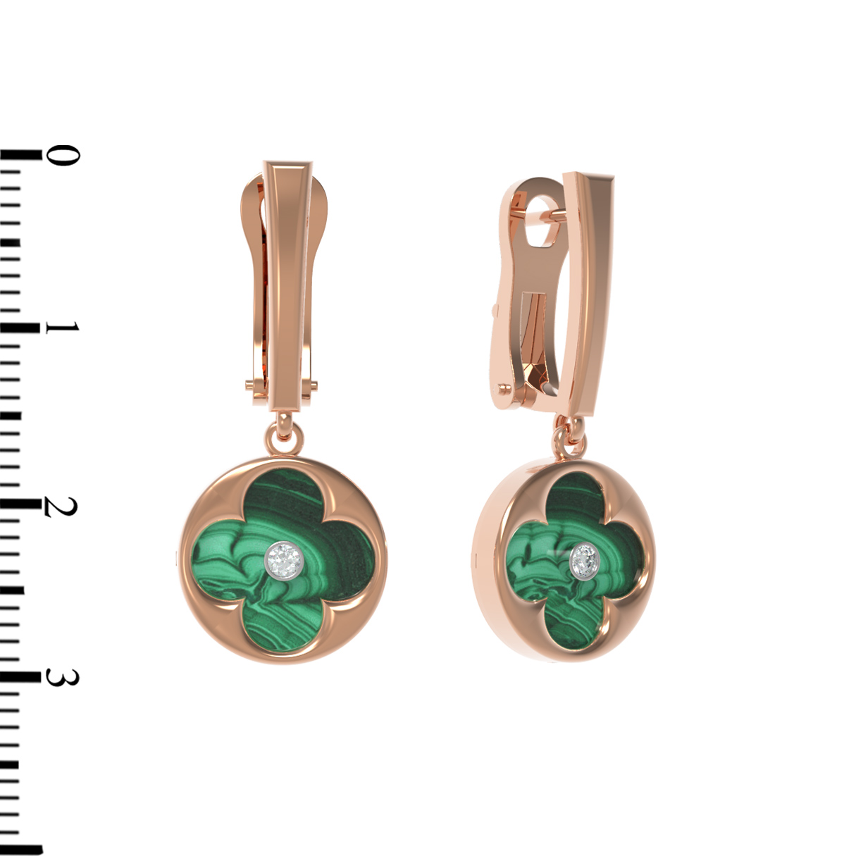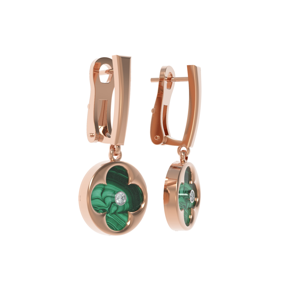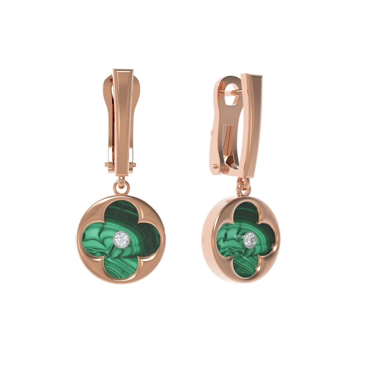Центральным элементом композиции является вставка из природного малахита глубокого зеленого цвета. Его естественный природный рисунок придает каждой паре серег уникальность. В центре малахитовой вставки закреплен сверкающий круглый бриллиант белого цвета, который добавляет изделию роскошное сияние. Всего в паре серег использовано 4 вставки, гармонично дополняющих друг друга.
