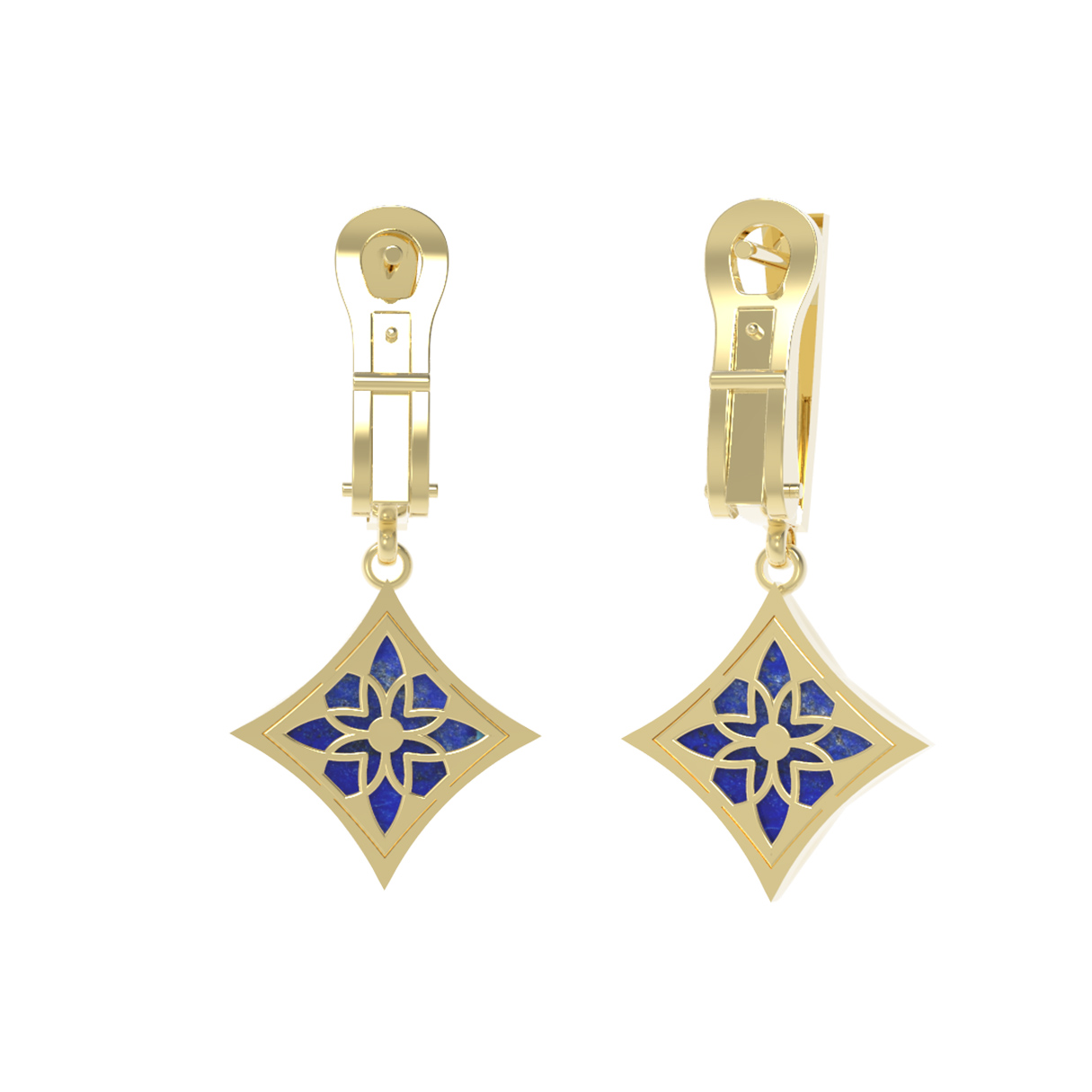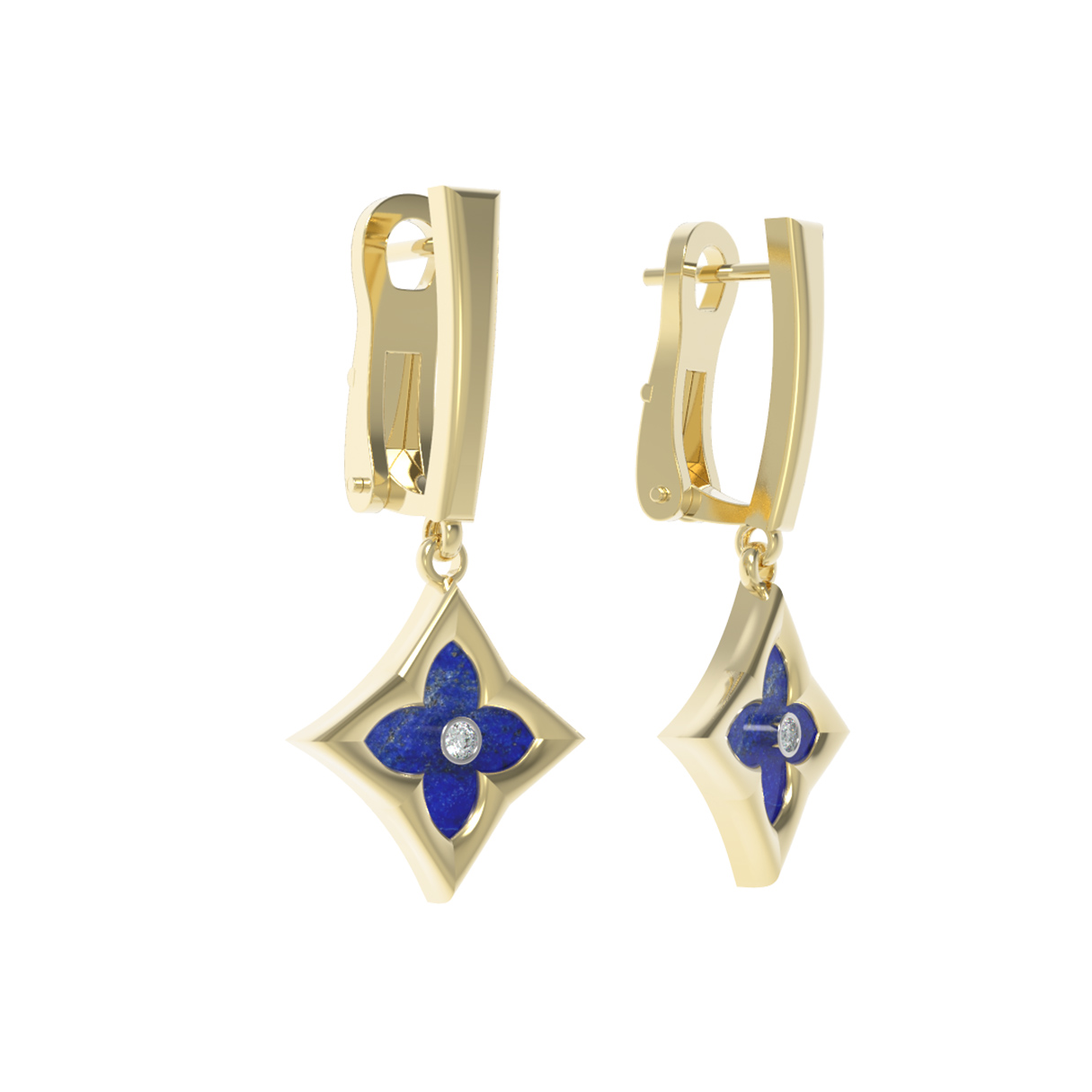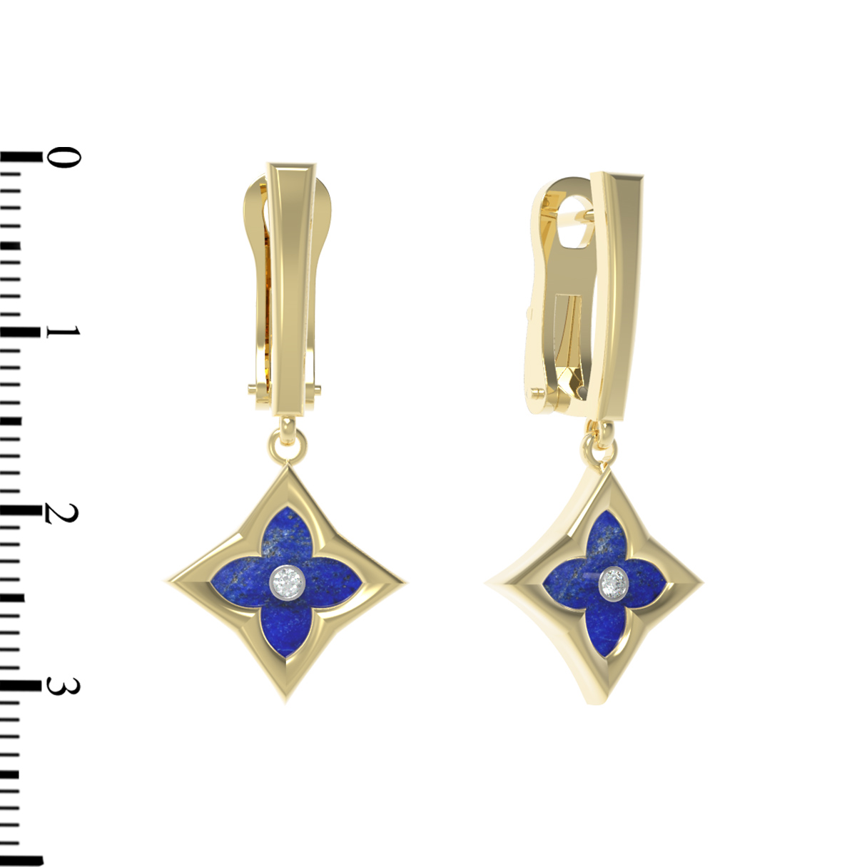 Центральный элемент композиции выполнен в форме изящного клевера, в центре которого сияет круглый бриллиант белого цвета. Глубокий, насыщенный синий цвет лазурита в форме ромба придает украшению особую статусность и выразительность. Всего в паре серег предусмотрено 4 вставки, которые гармонично дополняют друг друга, создавая завершенный и стильный образ. Дизайн украшения продуман до мелочей: строгие линии и сдержанная роскошь делают эти серьги универсальным аксессуаром, который одинаково хорошо подойдет как для женщин, так и для мужчин, предпочитающих эксклюзивные ювелирные решения.