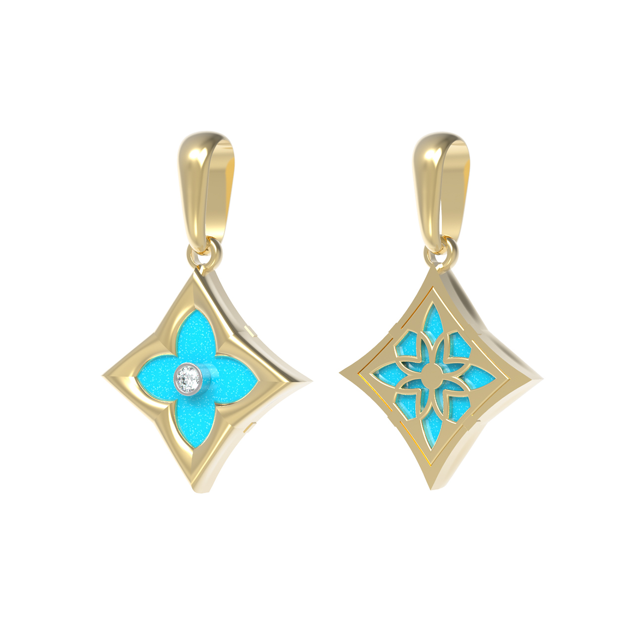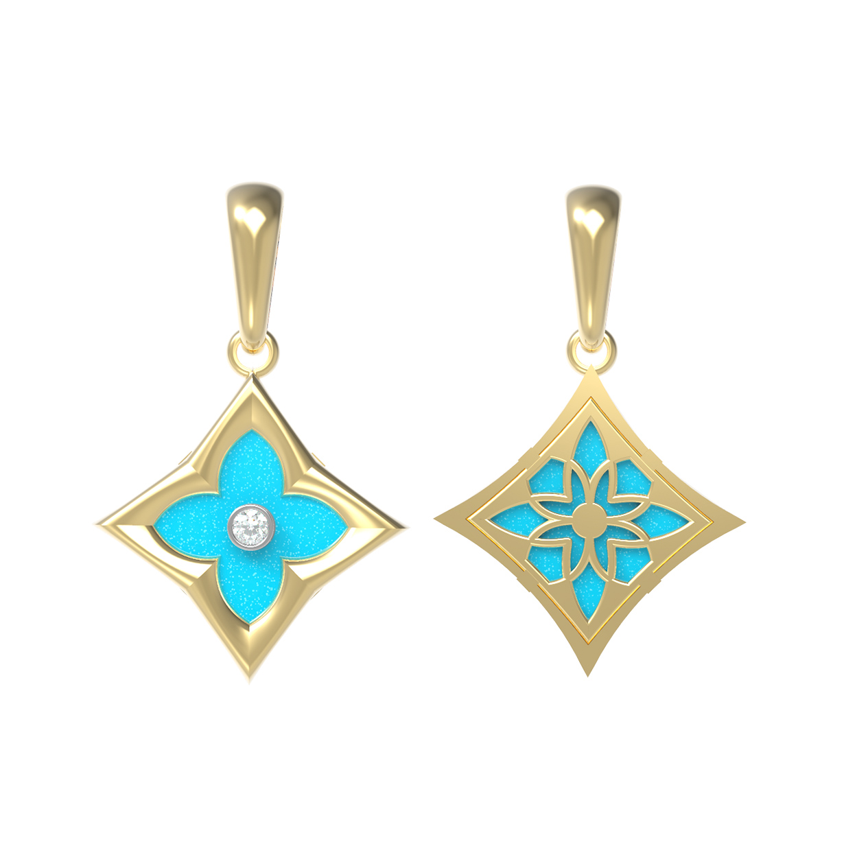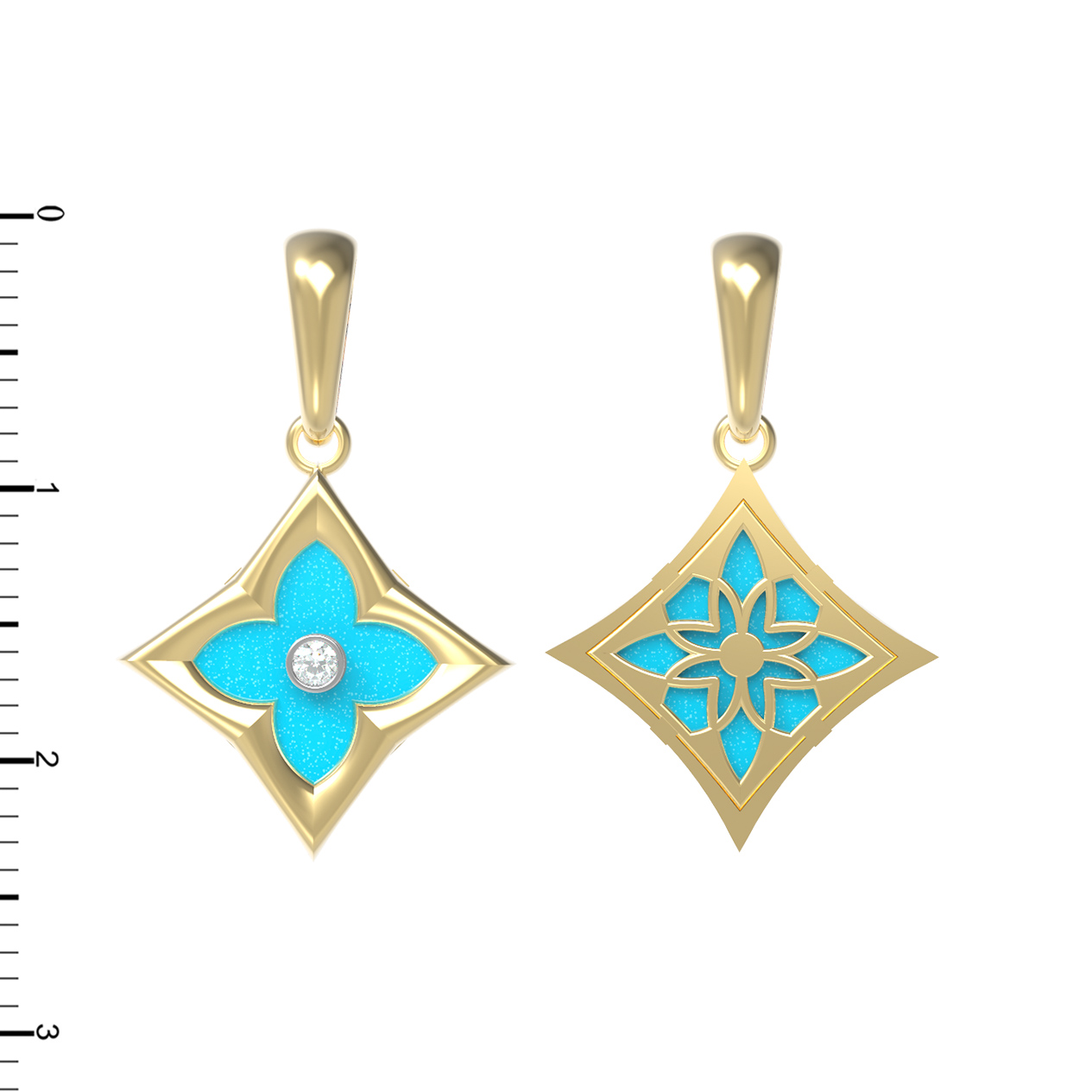 Особую выразительность подвеске придает сочетание двух вставок: яркой бирюзы небесного оттенка и сияющего белого бриллианта круглой формы. Контраст теплого лимонного золота с холодным блеском камней создает стильный визуальный эффект. Изделие включает 2 вставки, которые подчеркивают статусность и утонченный вкус владельца.