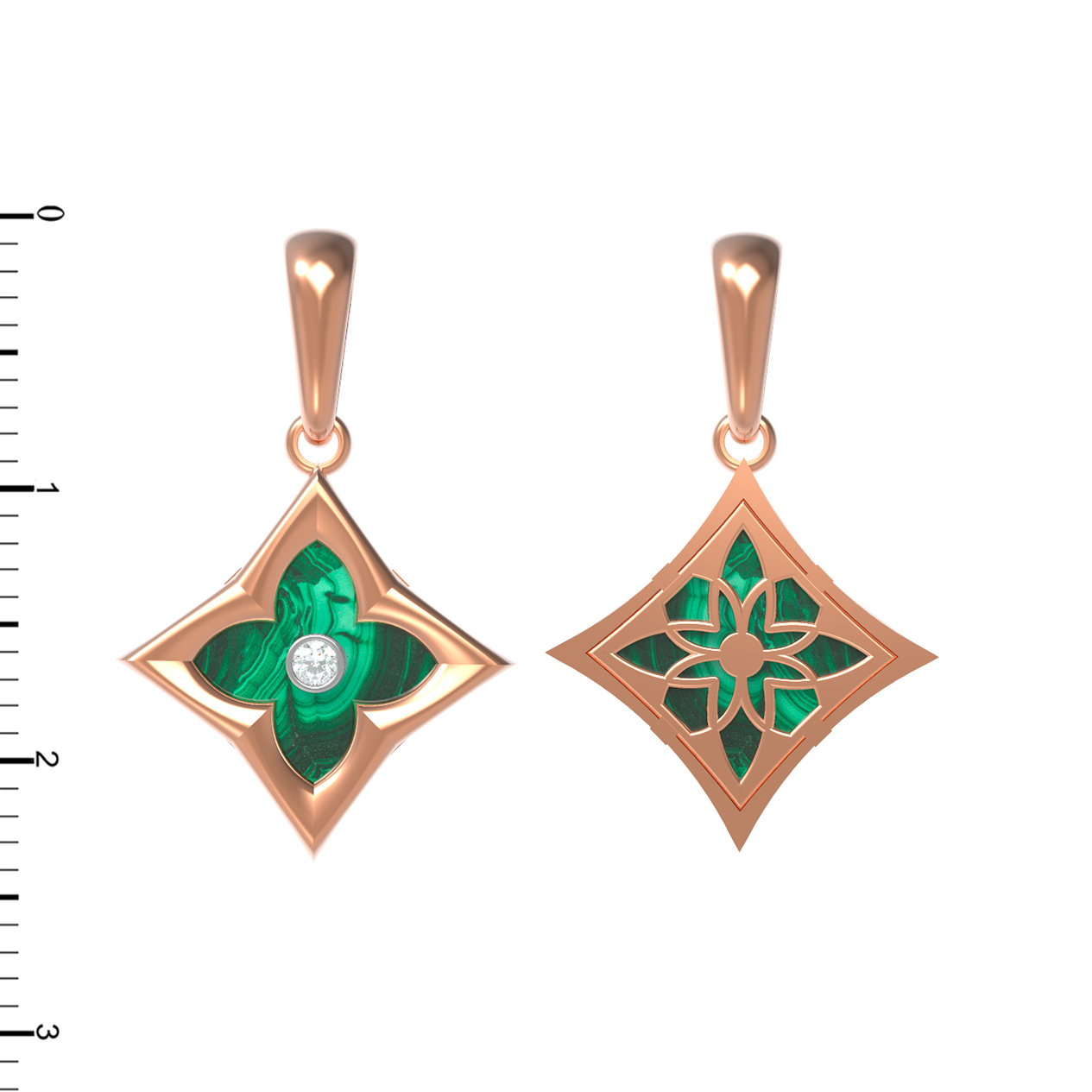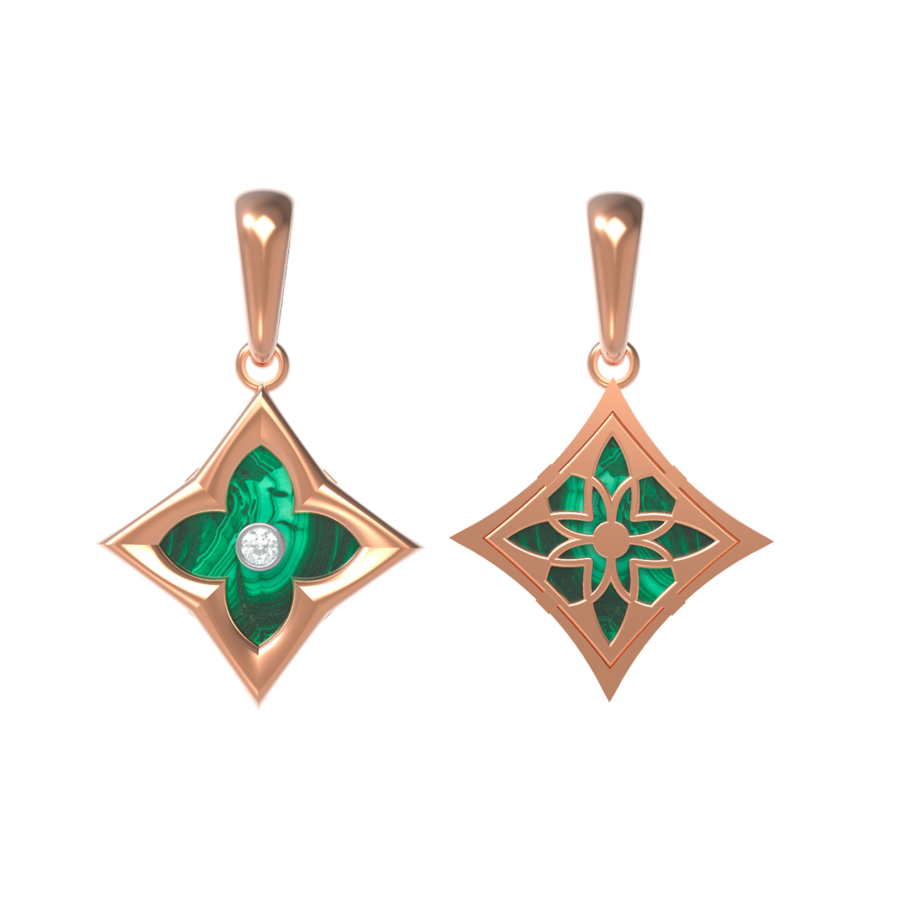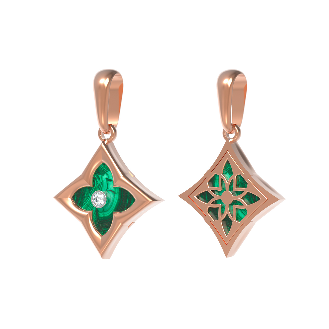 Элегантная подвеска из коллекции De Luxe — Амальфи — Бриллианты станет идеальным дополнением вашего образа, подчеркивая безупречный вкус и статус. Это ювелирное изделие выполнено из красного золота 585 пробы, чей теплый оттенок гармонично сочетается с глубоким зеленым цветом малахита. Дизайн подвески представляет собой стилизованный клевер, заключенный в геометрическую форму ромба, что придает украшению современный и выразительный вид.
