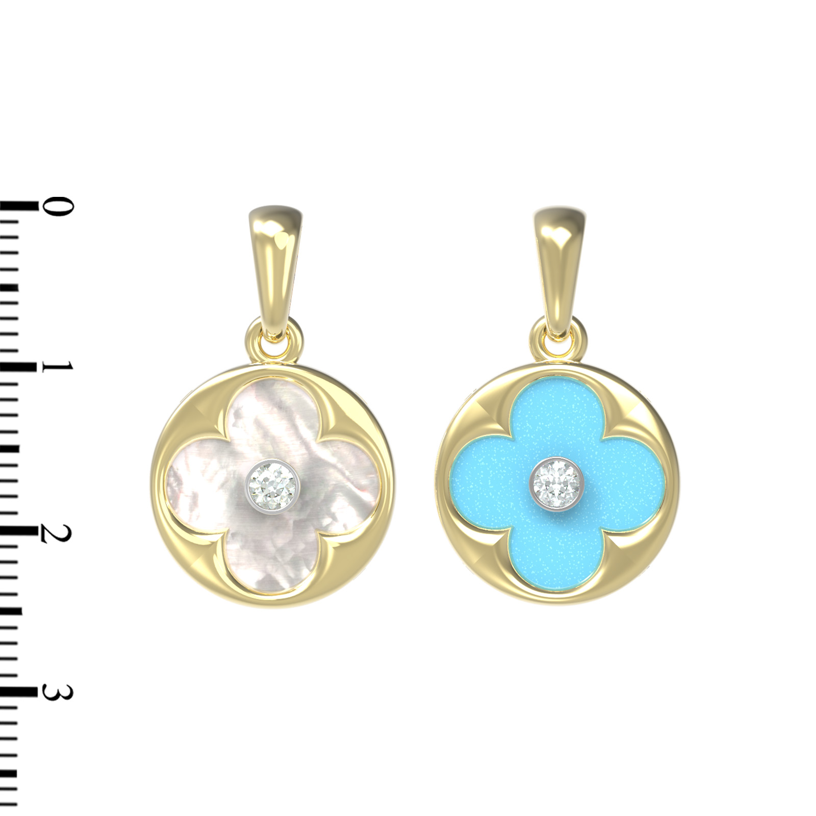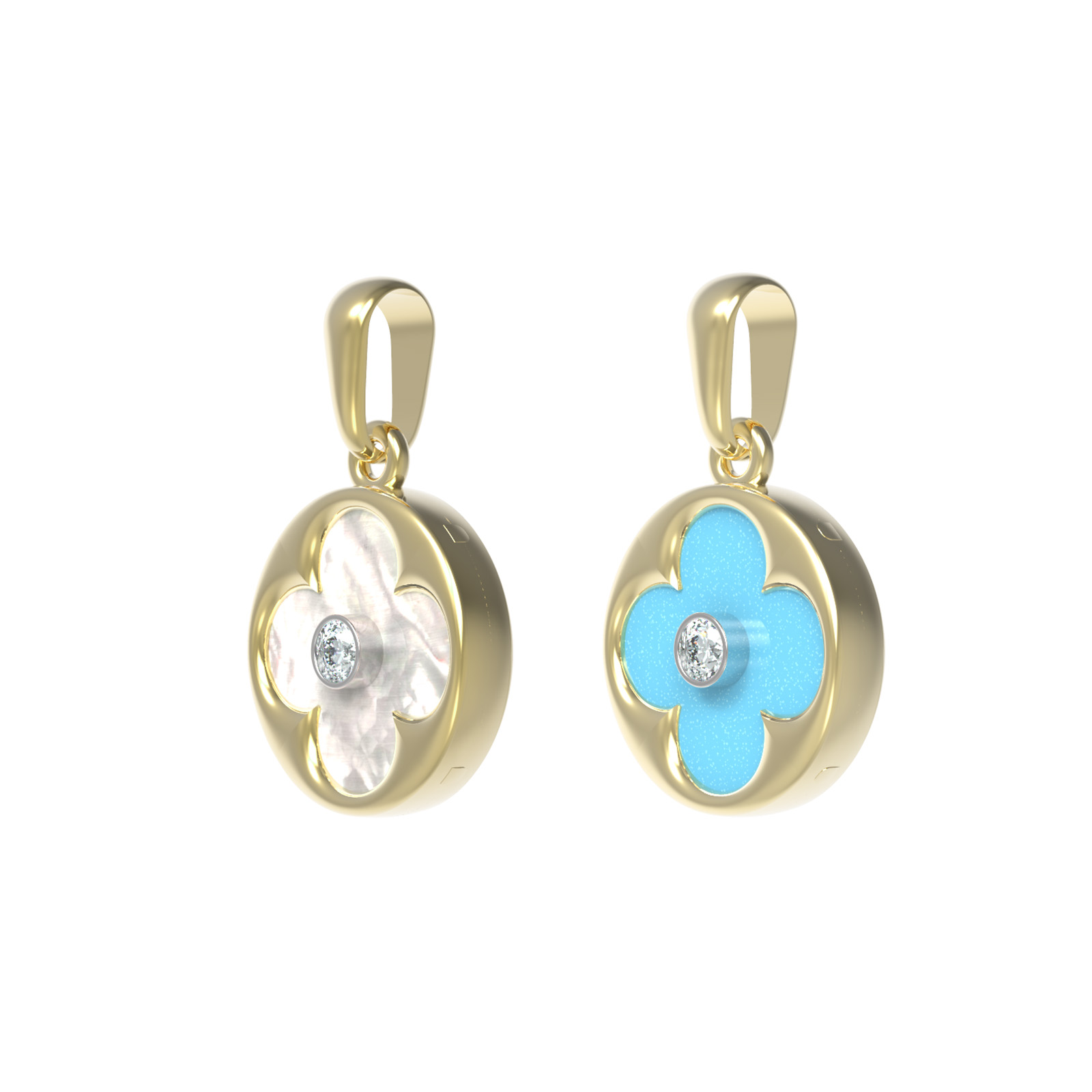 В центре композиции размещена вставка круглой формы: сияющий бриллиант, обрамленный бирюзой или перламутром. Мы используем три вставки с контрастными цветами — нежно-голубым бирюзовым и переливчатым белым, что создает игру света и оттенков. Такая подвеска универсальна и подходит как для женщин, так и для мужчин, предпочитающих стильные и качественные ювелирные изделия.