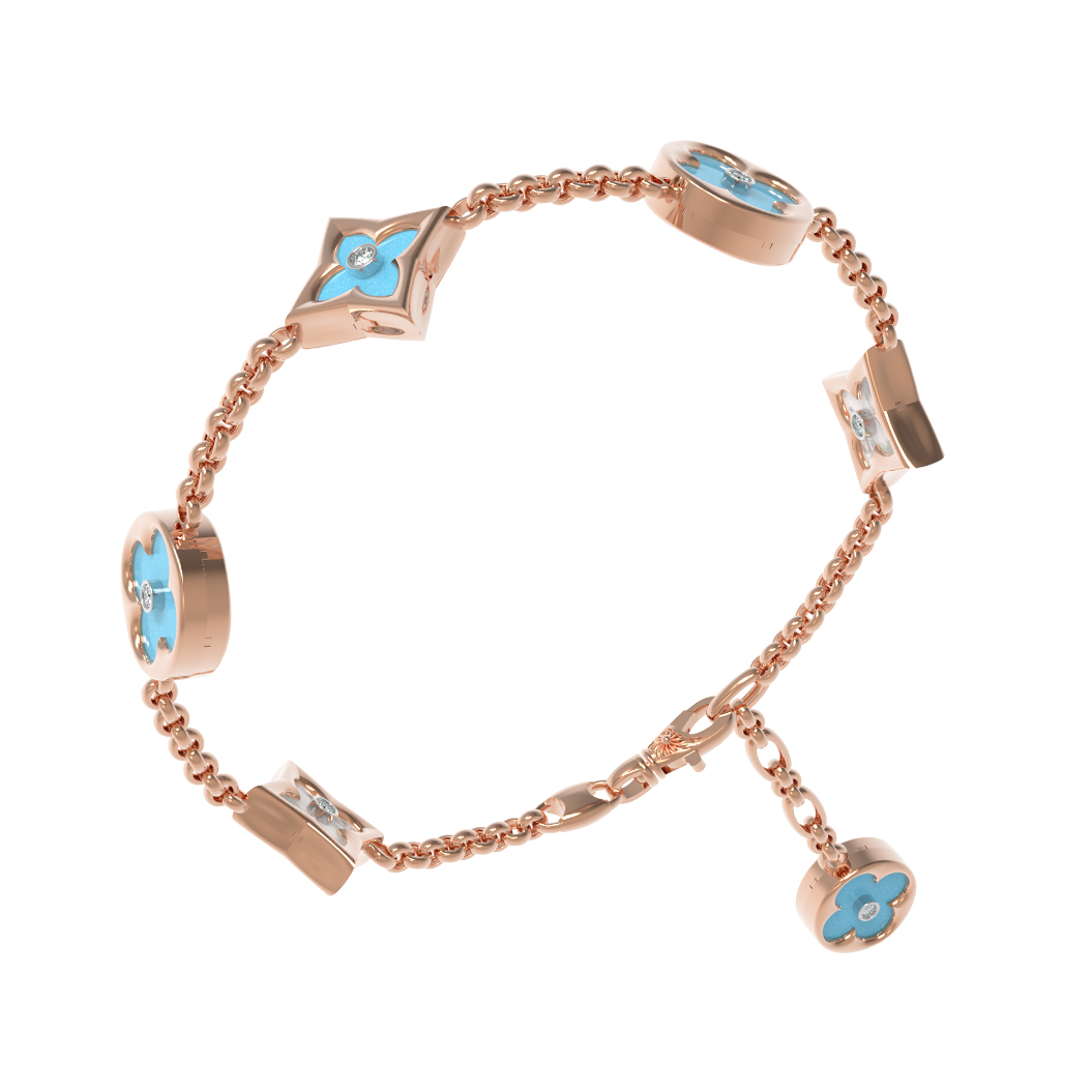 В центре композиции — 18 вставок, искусно сочетающих природную красоту бирюзы бирюзового цвета и нежное сияние перламутра. Дополняют этот ансамбль искрящиеся бриллианты белого цвета, которые придают украшению роскошный вид. Вставки различной геометрической формы — круг и ромб — создают динамичный и современный облик, подчеркивая безупречное мастерство исполнения.