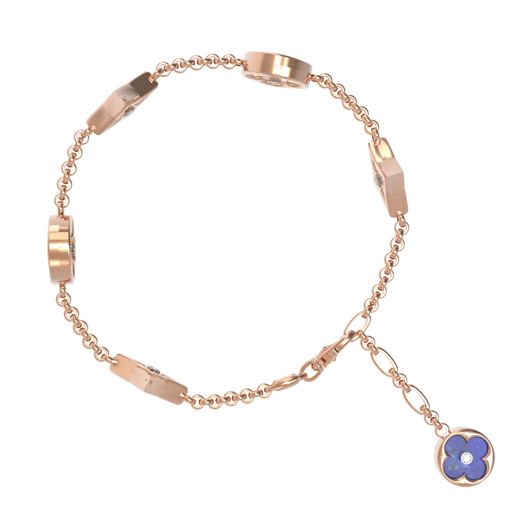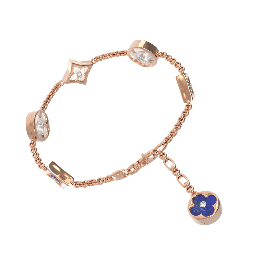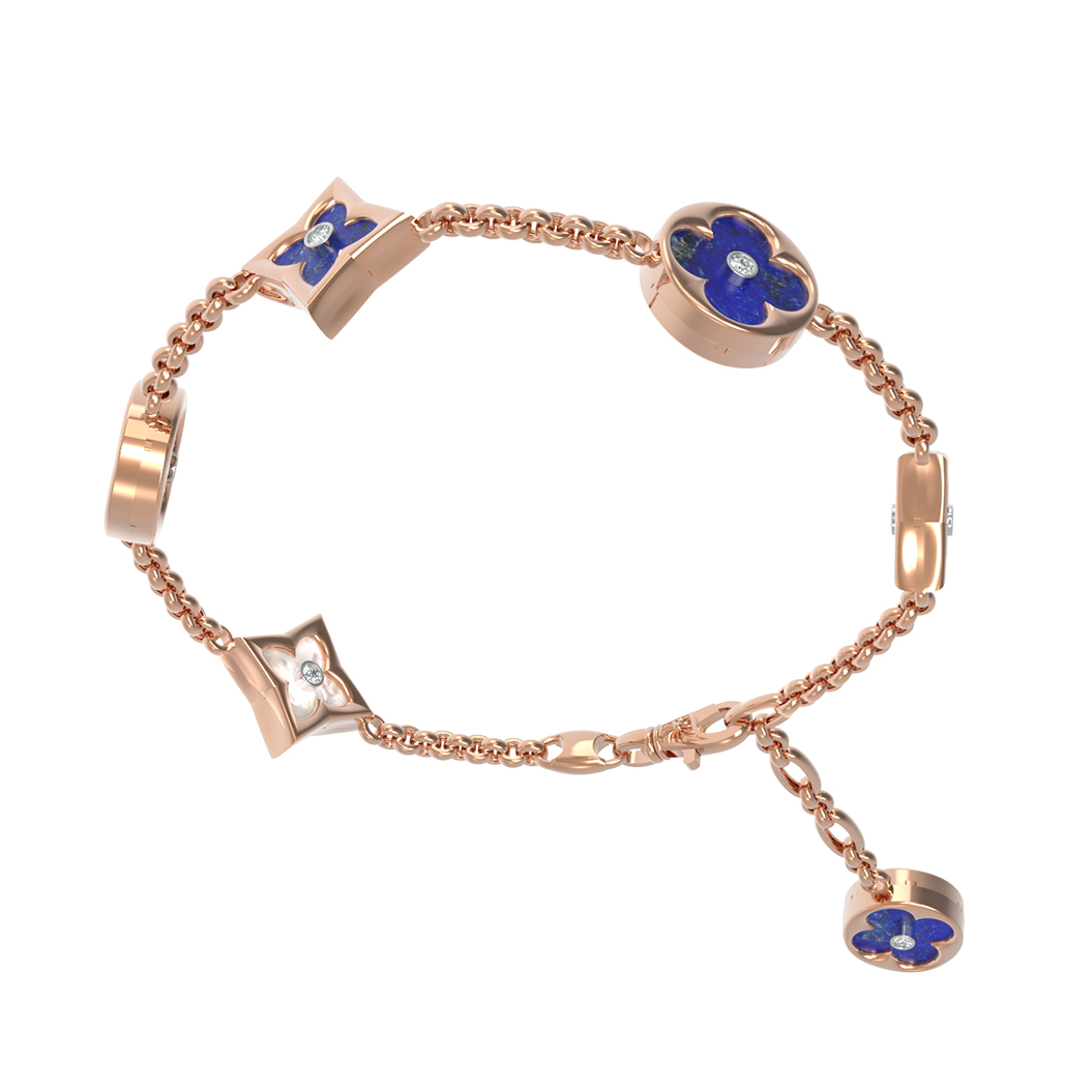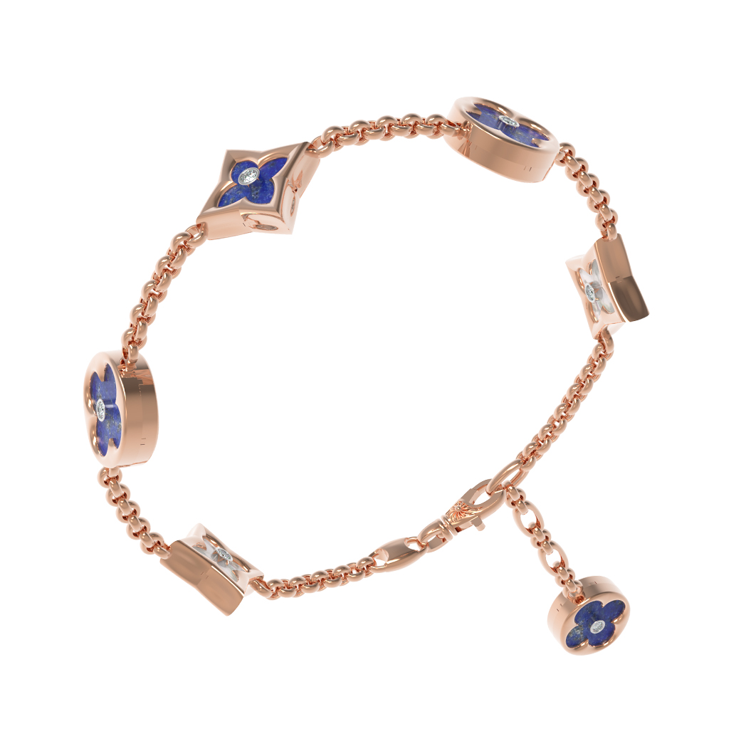 В центре композиции расположены 18 вставок: насыщенный синий лазурит и нежный перламутр сочетаются с сияющими бриллиантами. Круглая и ромбовидная формы вставок придают изделию динамику и глубину. Белый цвет бриллиантов, синий оттенок лазурита и переливы перламутра создают завораживающий контраст, делая этот браслет универсальным аксессуаром.