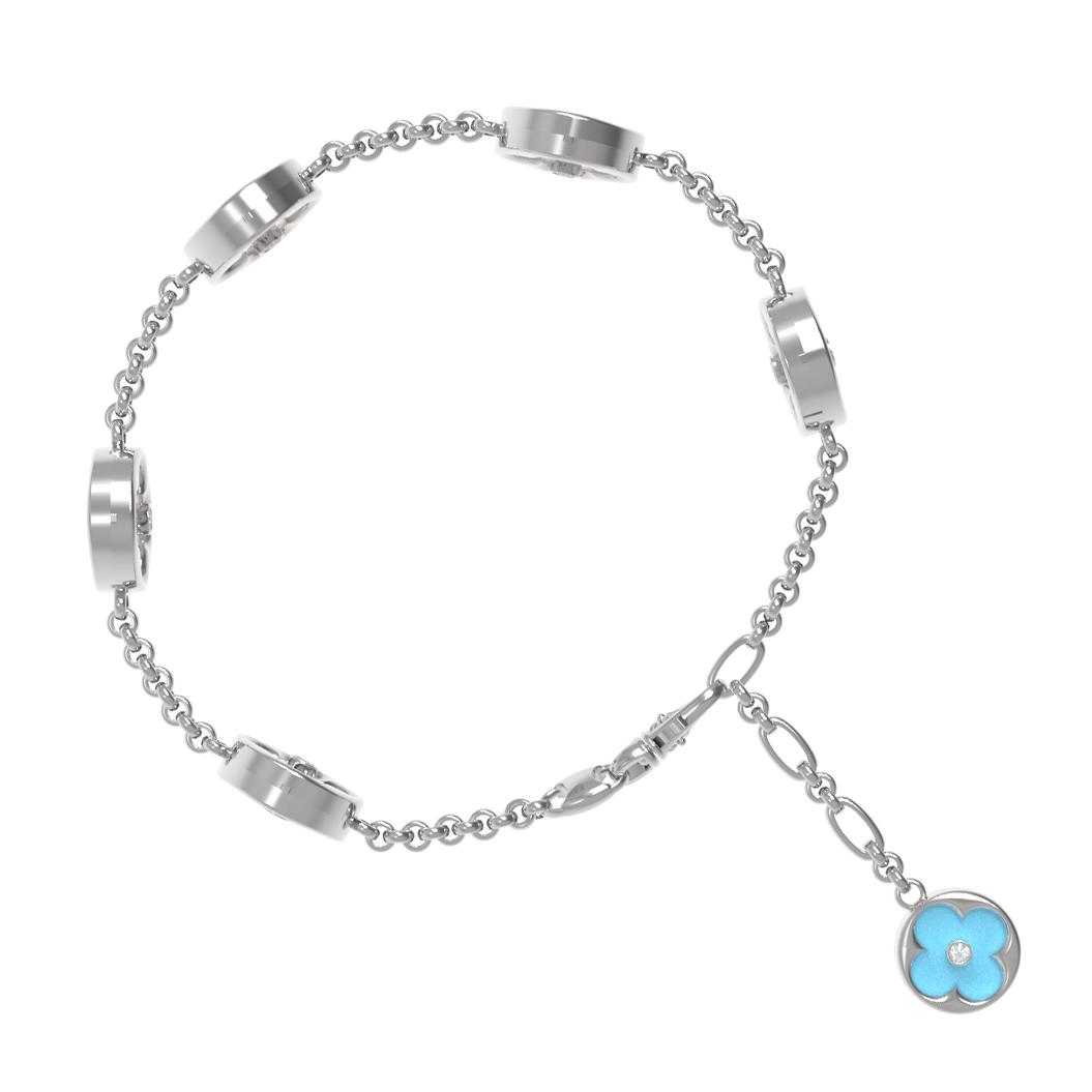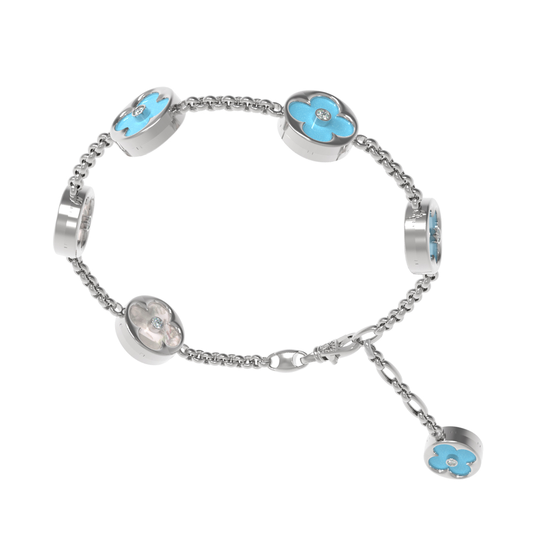 В оформлении модели использовано 18 вставок круглой формы, создающих чарующую игру света и цвета. Роскошная комбинация яркой бирюзы, нежного перламутра и классических бриллиантов превращает этот браслет в настоящее произведение искусства. Белоснежный блеск металла идеально гармонирует с белыми бриллиантами, небесно-бирюзовыми оттенками и мягким перламутровым сиянием вставок.