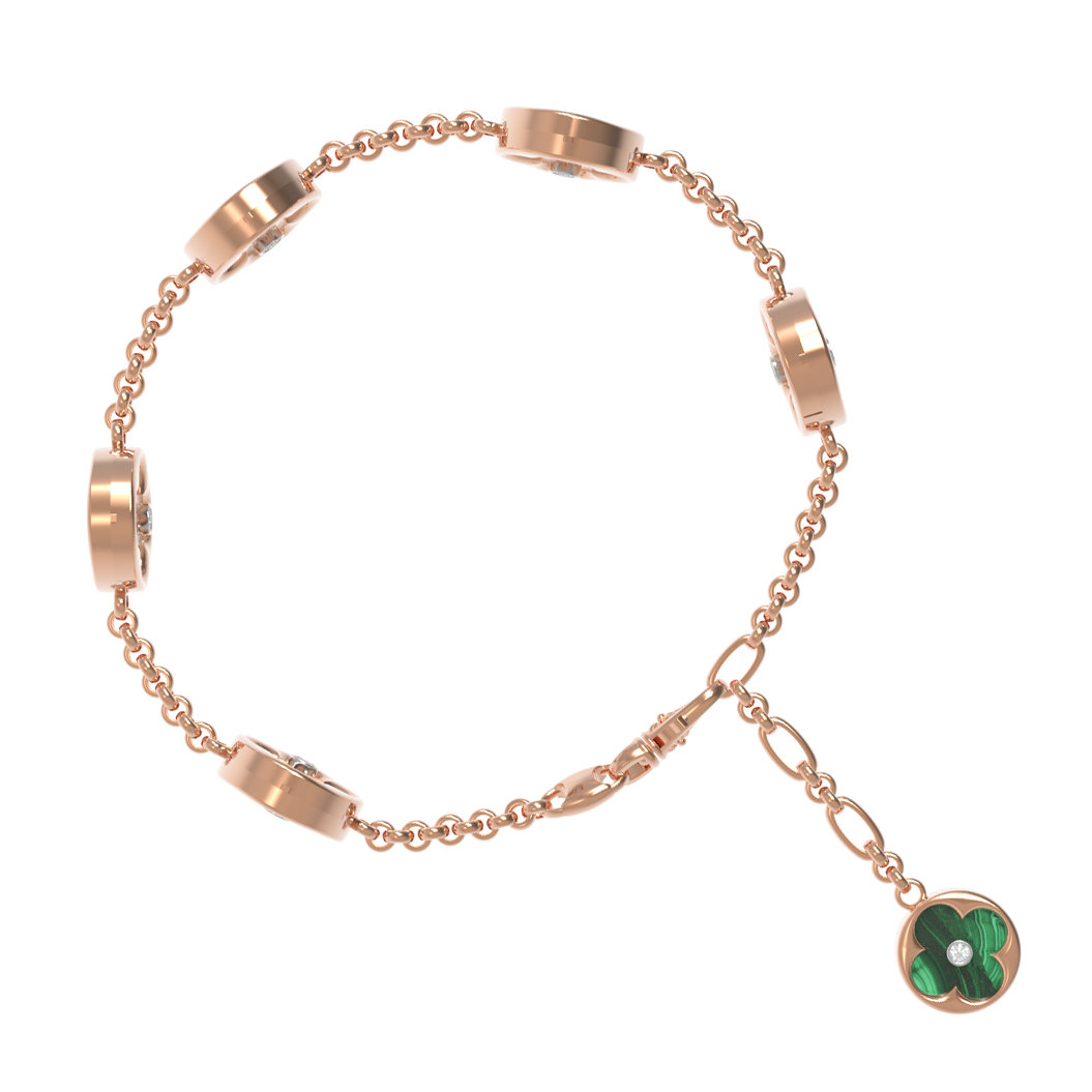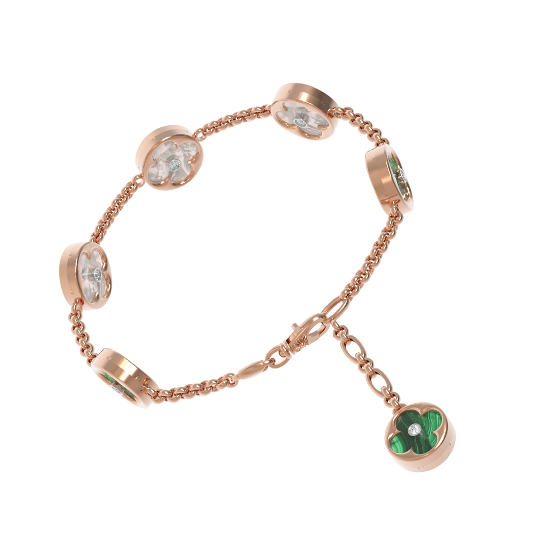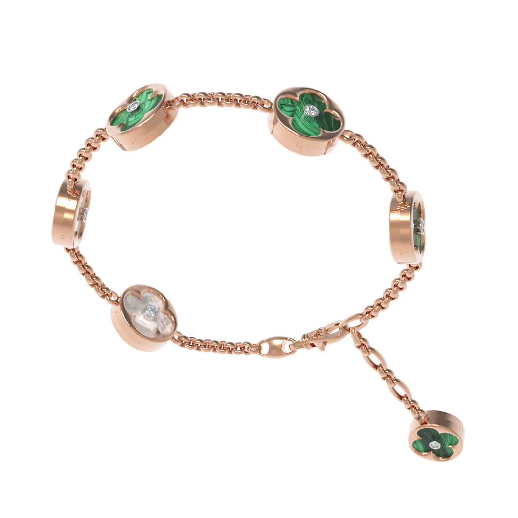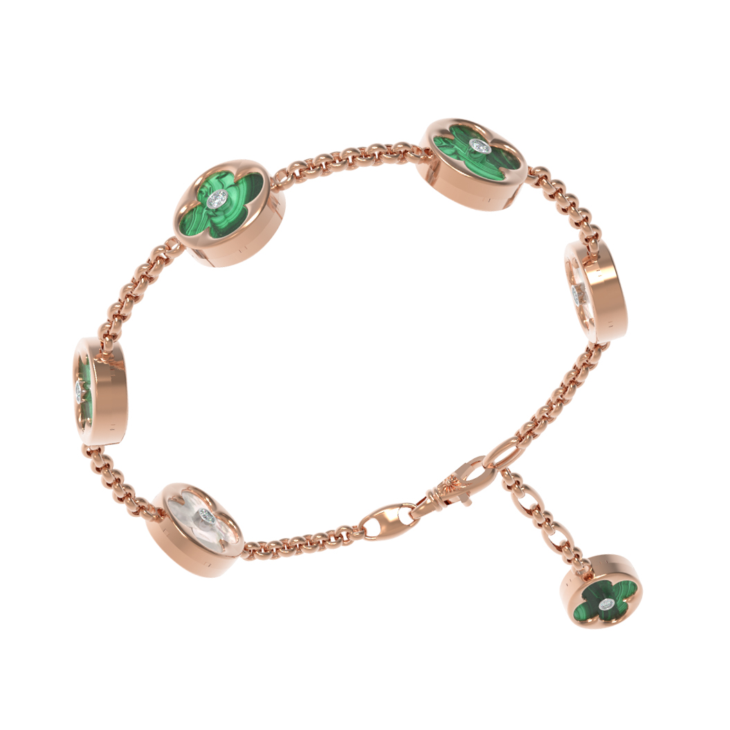 Центральными элементами композиции выступают 18 вставок круглой формы. Глубокий зеленый цвет малахита гармонично сочетается с нежным перламутром, создавая неповторимый контраст, который дополняется сиянием бриллиантов. Белые, зеленые и перламутровые оттенки вставок эффектно играют на свету, подчеркивая безупречное качество исполнения. Этот браслет станет отличным дополнением к вашему образу, а при желании вы можете собрать полноценный сет, выбрав другие украшения из этой же серии, ведь изделие гармонично вписывается в составные комплекты.