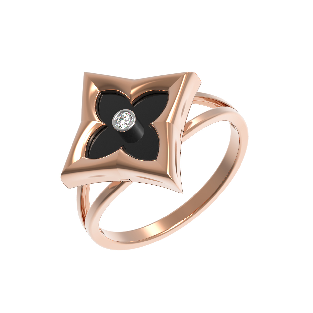 Элегантное кольцо из красного золота 585 пробы — это воплощение утонченного стиля и современного дизайна. Данное украшение, представленное в коллекции De Luxe — Амальфи — Бриллианты, сразу привлекает внимание своей необычной формой в виде клевера, которая придает изделию особое очарование и символический смысл. Благородный блеск красного золота гармонично сочетается с контрастными вставками: глубоким черным ониксом ромбовидной формы и сияющим белым бриллиантом круглой огранки.