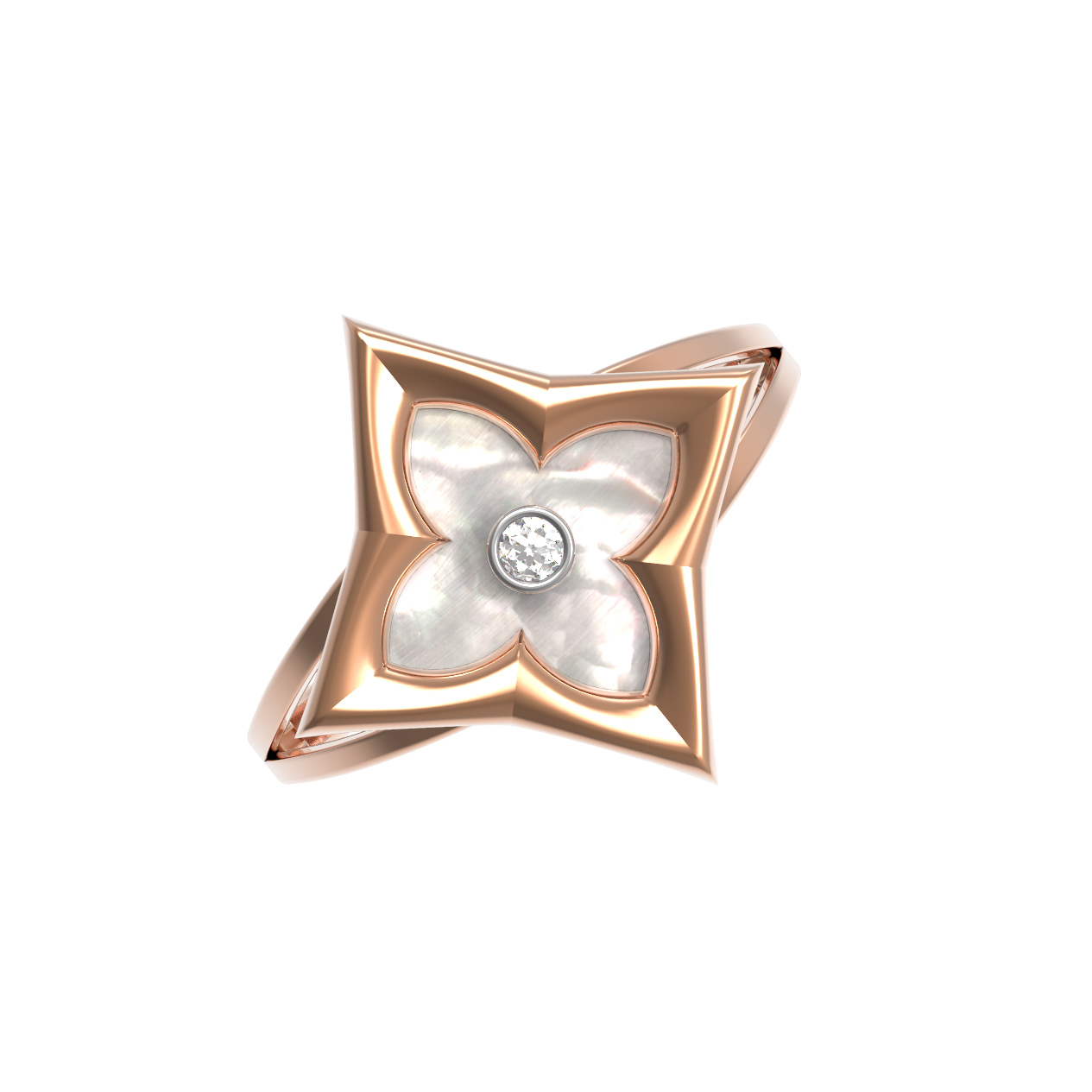Элегантное кольцо из красного золота 585 пробы — гармоничное сочетание классики и современного ювелирного дизайна. Украшение входит в коллекцию De Luxe — Амальфи — Бриллианты, отличающуюся своим утонченным стилем. Центральным элементом композиции является вставка в форме клевера, выполненная из нежного перламутра с характерным переливающимся белым оттенком. В самом сердце перламутровой вставки, имеющей форму ромба, расположен сияющий бриллиант круглой огранки.
