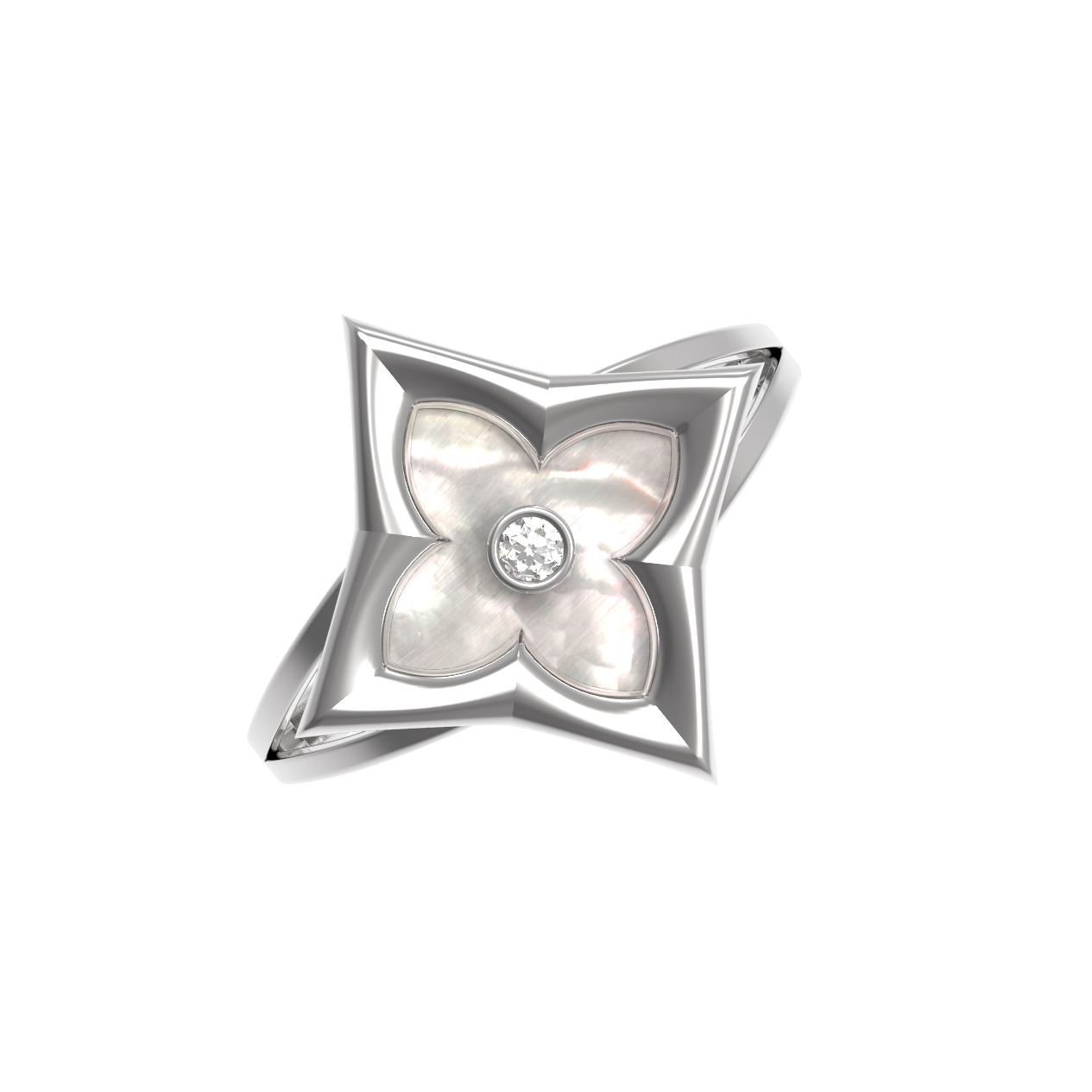 Кольцо из белого золота 585 пробы из коллекции De Luxe — Амальфи — Бриллианты воплощает в себе лаконичность и изысканный стиль. Дизайн изделия вдохновлен образом клевера: центральным элементом украшения стала геометрическая вставка в форме ромба, внутри которой деликатно расположился перламутр с его мягким внутренним свечением. В самом сердце композиции сияет круглый бриллиант, добавляя акцент и подчеркивая благородство белого золота.