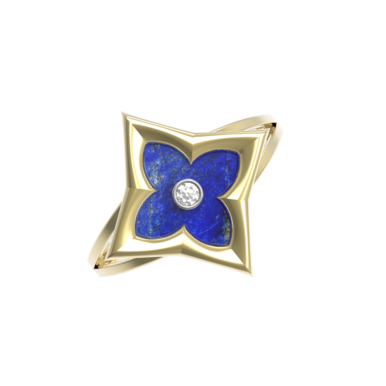 Кольцо из лимонного золота 585 пробы из коллекции De Luxe — Амальфи — Бриллианты воплощает в себе изысканность и утонченный стиль. Главным акцентом украшения является выразительный дизайн в форме клевера, который придает изделию особое очарование. Центральным элементом декора выступает глубокий синий лазурит ромбовидной формы, создающий благородный контраст с сиянием драгоценного металла. В сердце композиции расположен белый бриллиант круглой огранки, добавляющий кольцу роскошный блеск.
