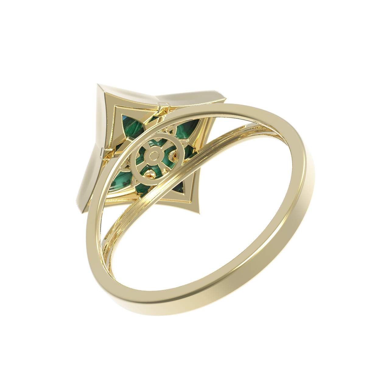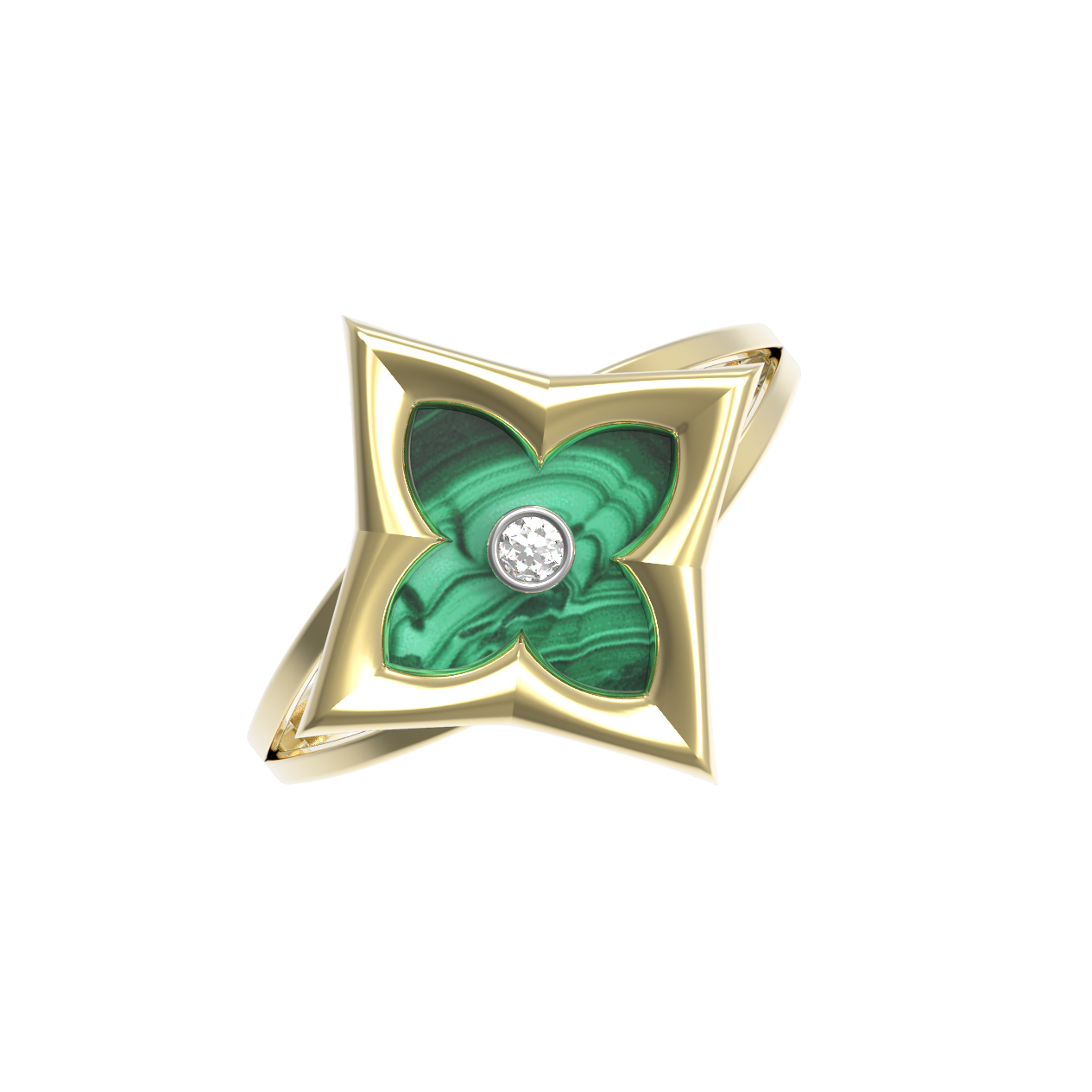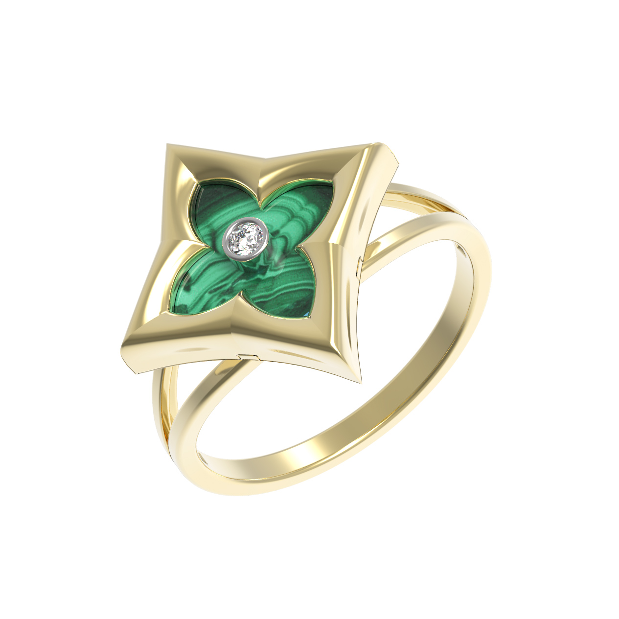 Кольцо из лимонного золота 585 пробы из коллекции De Luxe — Амальфи — Бриллианты воплощает эстетику утонченного стиля и природной красоты. Дизайн изделия вдохновлен символом четырехлистного клевера, где мягкие грани металла гармонично сочетаются с глубоким зеленым оттенком малахита ромбовидной формы. Этот редкий природный минерал обладает неповторимым рисунком, придающим украшению особую выразительность и статусность.