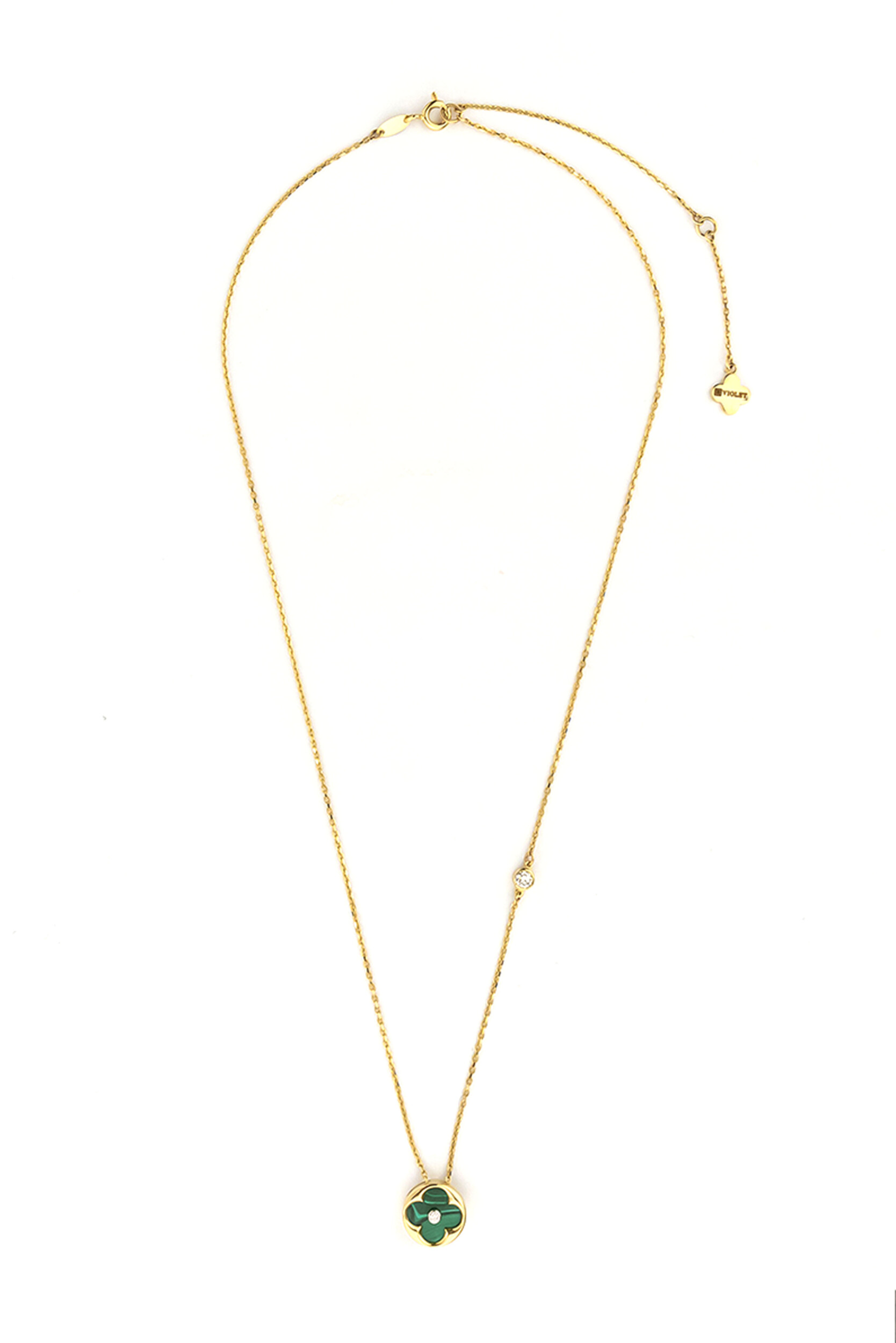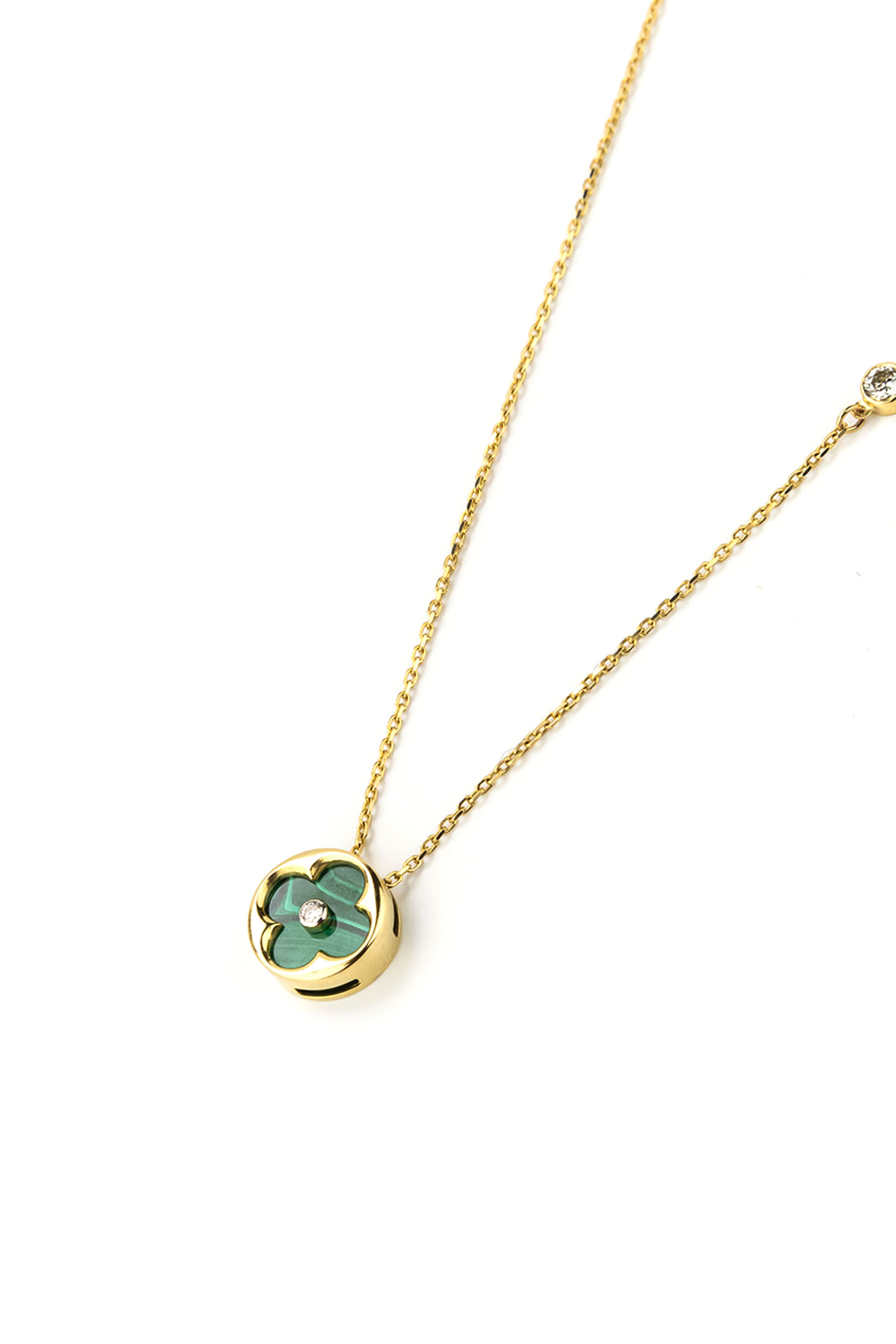 Колье из лимонного золота 585 пробы из коллекции De Luxe — Амальфи — Бриллианты станет безупречным акцентом вашего образа. Дизайн украшения воплощает классическую эстетику в современном прочтении, обыгрывая популярный мотив клевера. Центральным элементом композиции является вставка из природного малахита глубокого зеленого цвета, которая гармонично сочетается с теплым сиянием драгоценного металла.