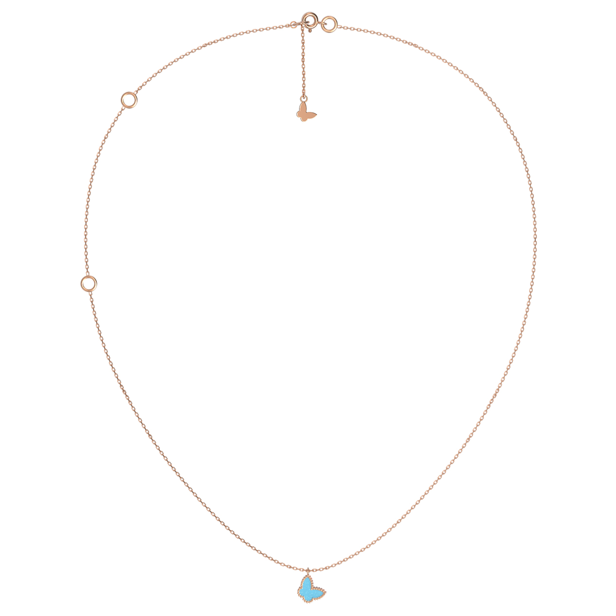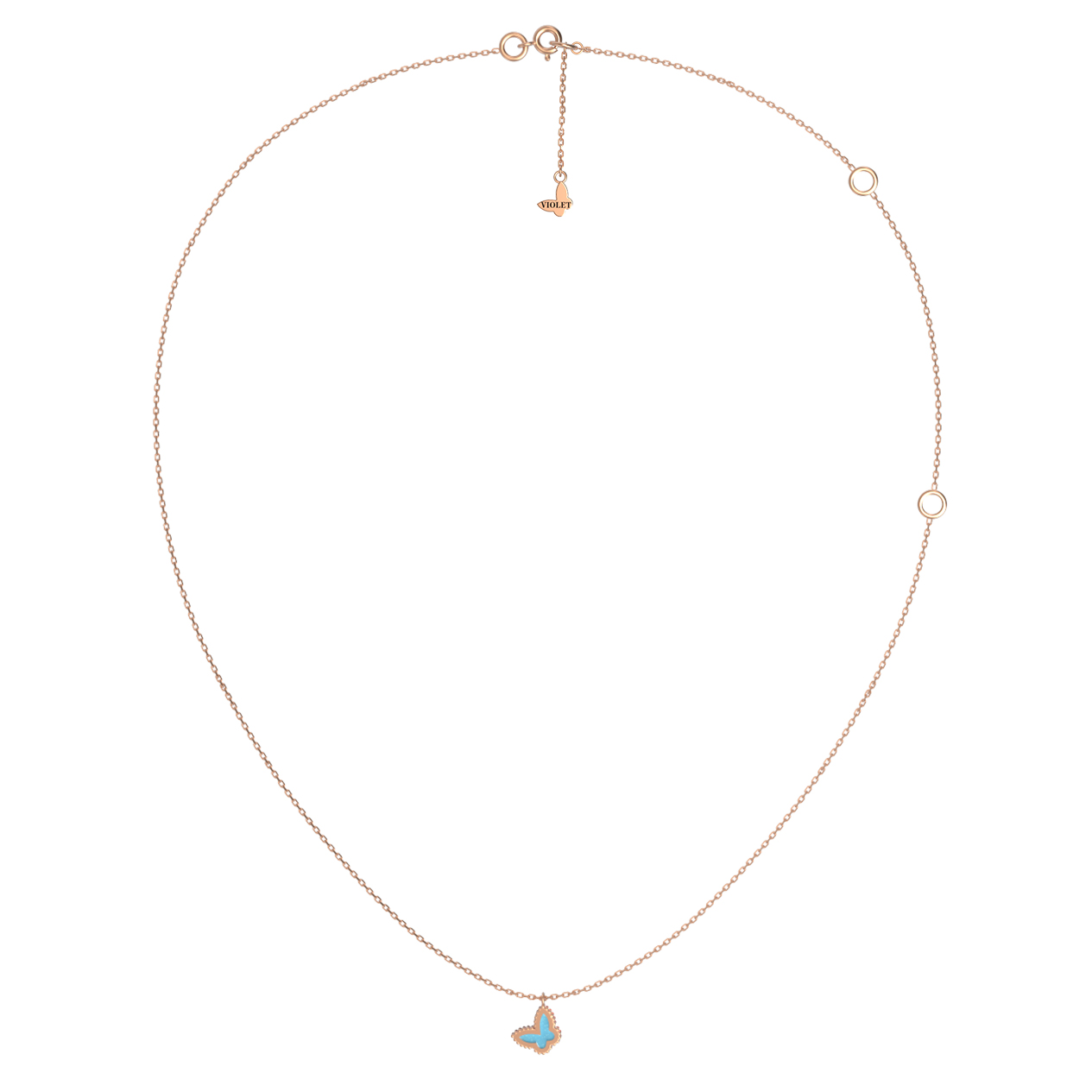 Элегантное колье из красного золота 585 пробы станет утонченным дополнением вашего образа. Это украшение из коллекции De Luxe — Бабочки привлекает внимание своим лаконичным и воздушным дизайном в виде изящной бабочки. Центральным элементом композиции выступает одна вставка из натуральной бирюзы яркого бирюзового цвета, которая гармонично сочетается с теплым блеском красного золота. Такое сочетание материалов создает выразительный контраст, делая изделие притягательным акцентом на шее.