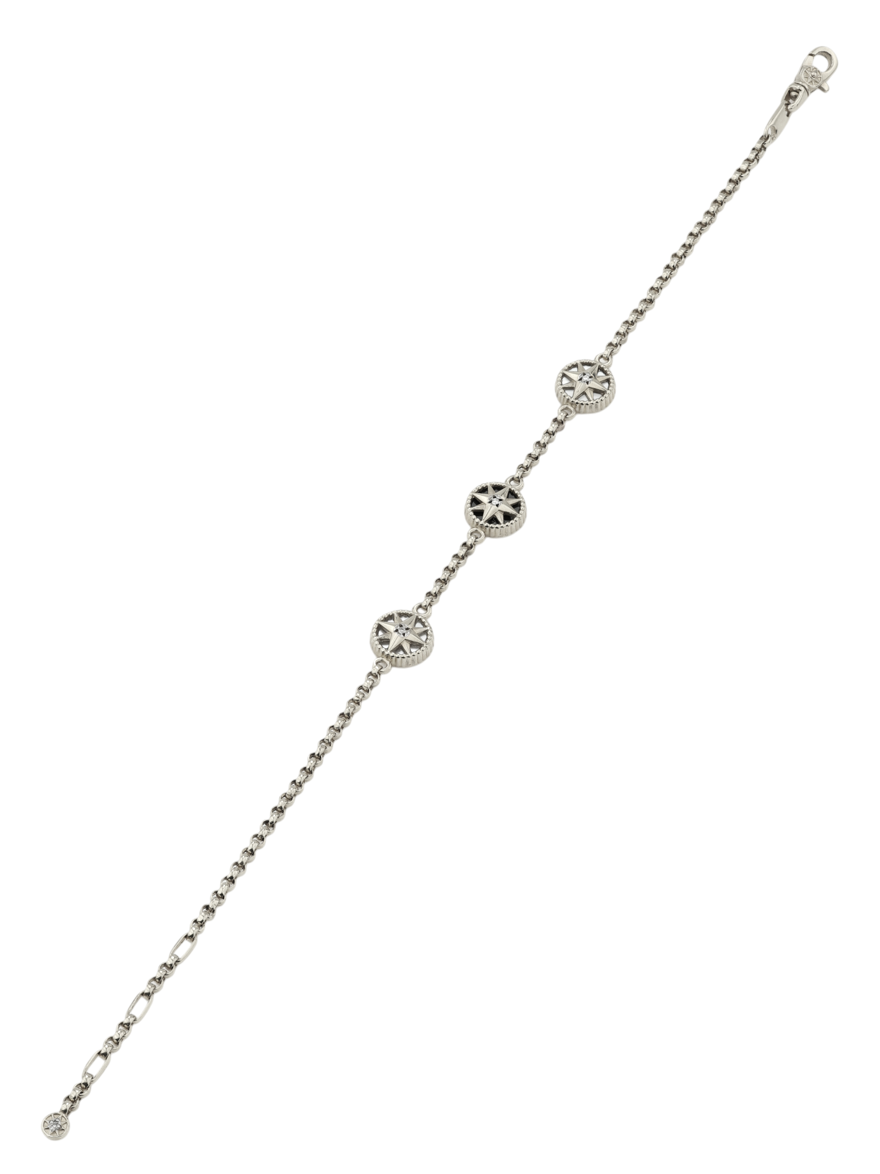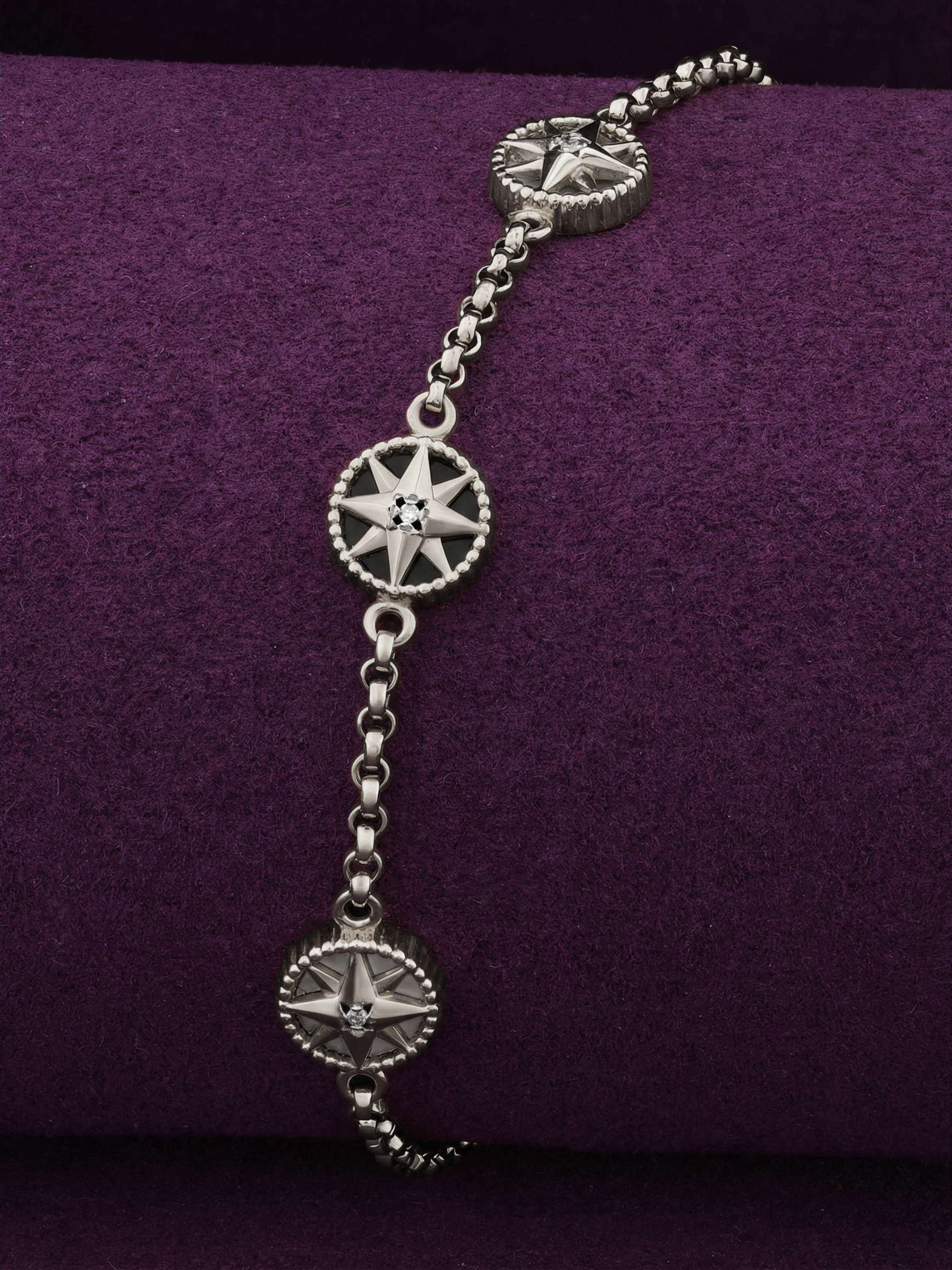 В оформлении браслета гармонично сочетаются четыре круглые вставки. Глубокий черный оникс перекликается с нежным перламутром, создавая выразительный визуальный эффект. Каждая звезда украшена сияющим бриллиантом, который добавляет аксессуару премиального блеска. Такое сочетание материалов — белого золота, черного оникса и светлого перламутра — позволяет браслету выглядеть современно и статусно.