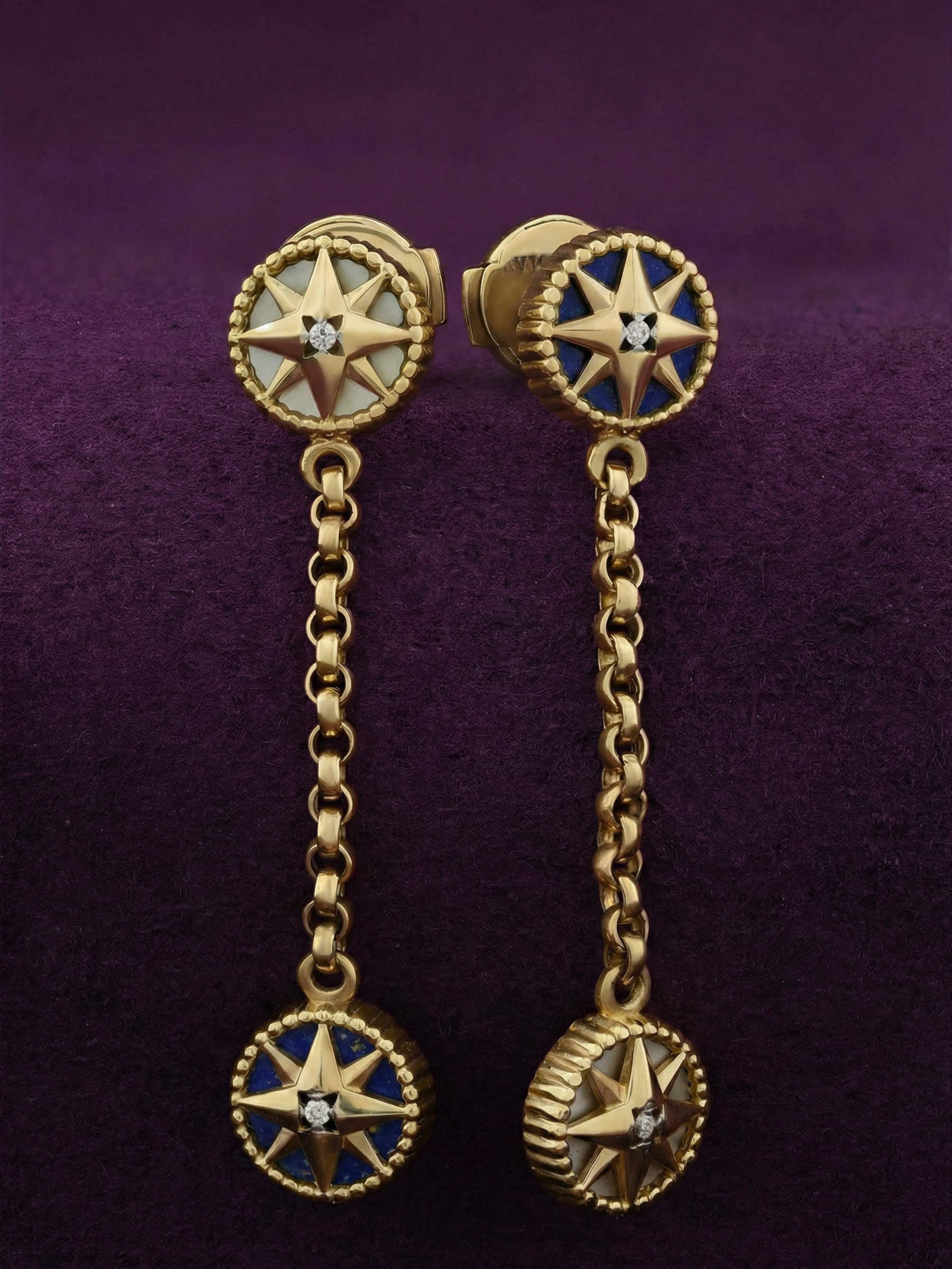 В центре композиции гармонично сочетаются драгоценные и полудрагоценные камни. Инкрустация включает 6 круглых вставок: сияющие бриллианты, глубокий синий лазурит и нежный перламутр. Контраст белого цвета бриллиантов, перламутровых переливов и яркого синего оттенка лазурита придает серьгам особую выразительность. Тщательная проработка деталей делает это украшение универсальным аксессуаром, который одинаково гармонично подойдет как для женщин, так и для мужчин.