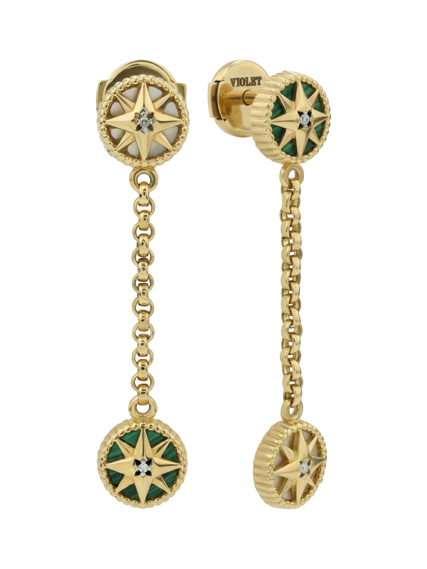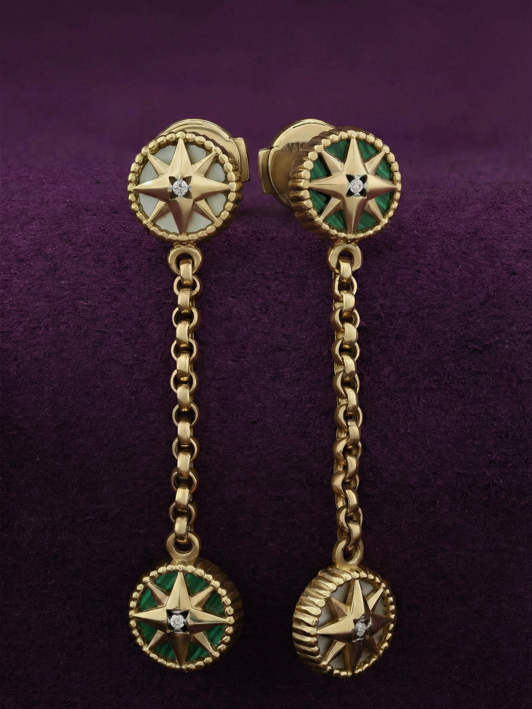 Композиция изделия строится на контрастном сочетании материалов: глубокий зеленый малахит, нежный перламутр и сияющие бриллианты гармонично дополняют друг друга. В дизайне использовано 6 вставок круглой формы, которые создают завораживающую игру света. Яркое сочетание белого, зеленого и перламутрового оттенков вставок превращает эти серьги в универсальный аксессуар, который подойдет как женщинам, так и мужчинам, предпочитающим смелые и статусные решения.