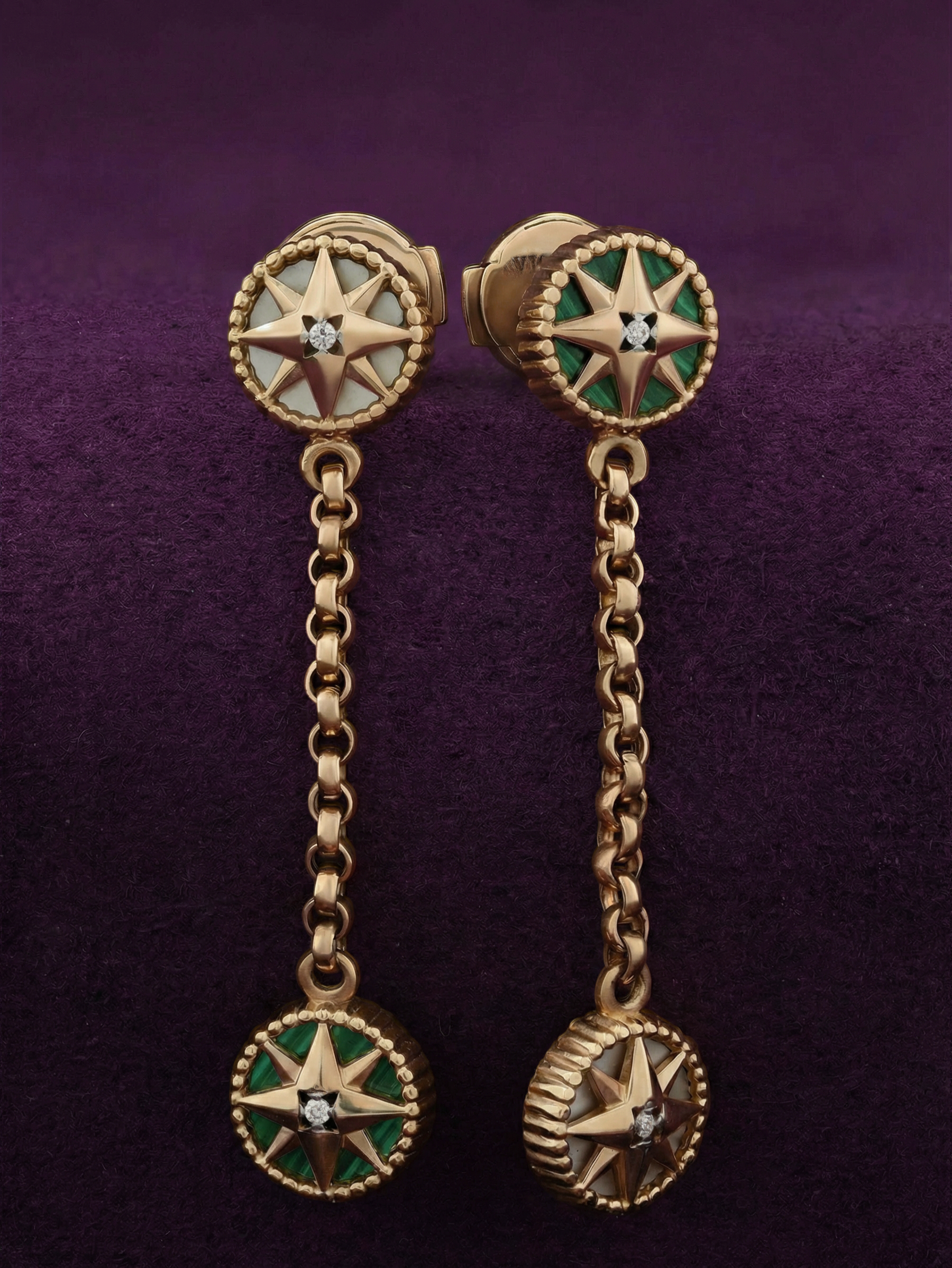 В этих серьгах использовано шесть вставок круглой формы: роскошные бриллианты, загадочный малахит с его характерным природным рисунком и нежный перламутр с мягким переливом. Цветовая палитра вставок включает классический белый цвет бриллиантов, глубокий зеленый оттенок малахита и естественное сияние перламутра, что придает изделию неповторимый шарм. Надежная конструкция делает их отличным выбором как для женщин, так и для мужчин, предпочитающих премиальные украшения.