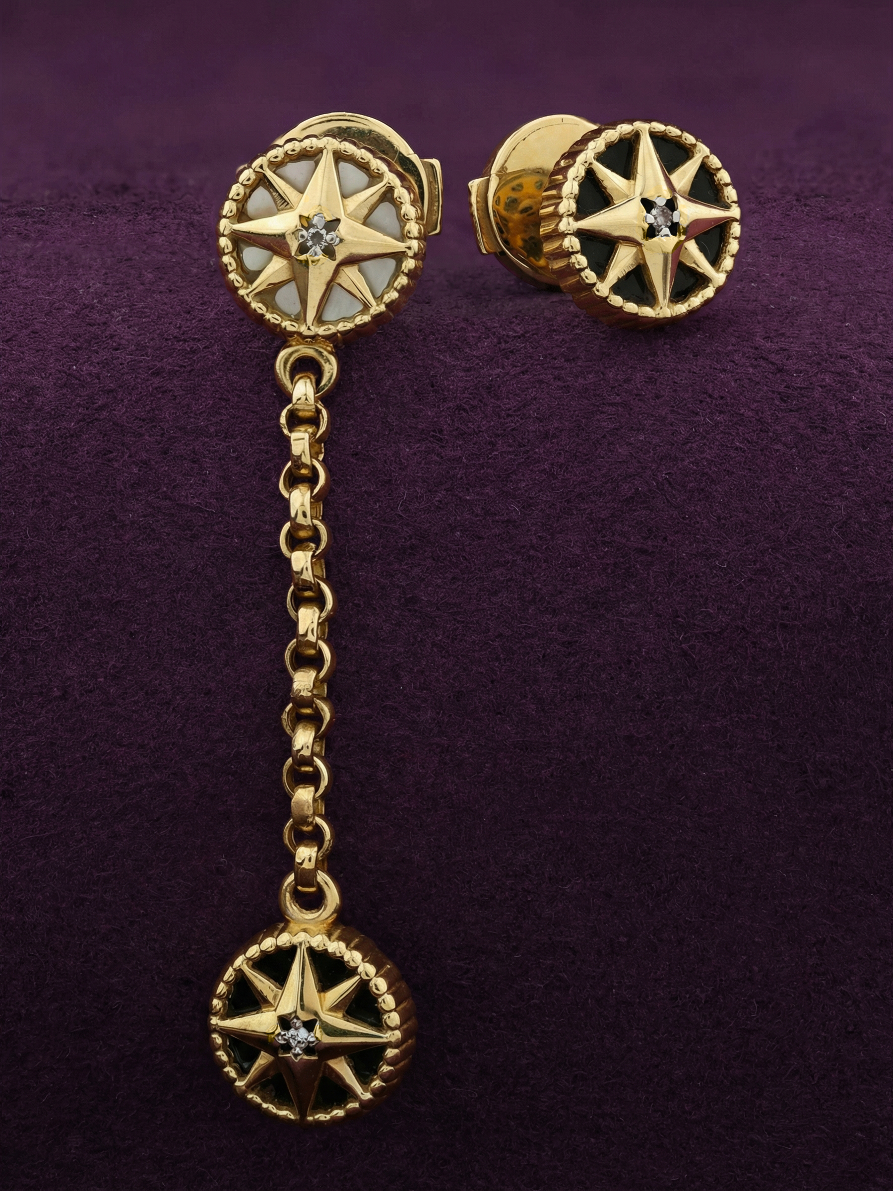 В центре внимания — 5 вставок круглой формы, которые гармонично сочетают в себе благородный блеск бриллиантов, таинственную глубину черного оникса и нежное сияние перламутра. Комбинация белого, черного и перламутрового цветов создает неповторимый визуальный акцент, делая эти серьги идеальным дополнением к вечернему наряду или акцентным элементом делового стиля.