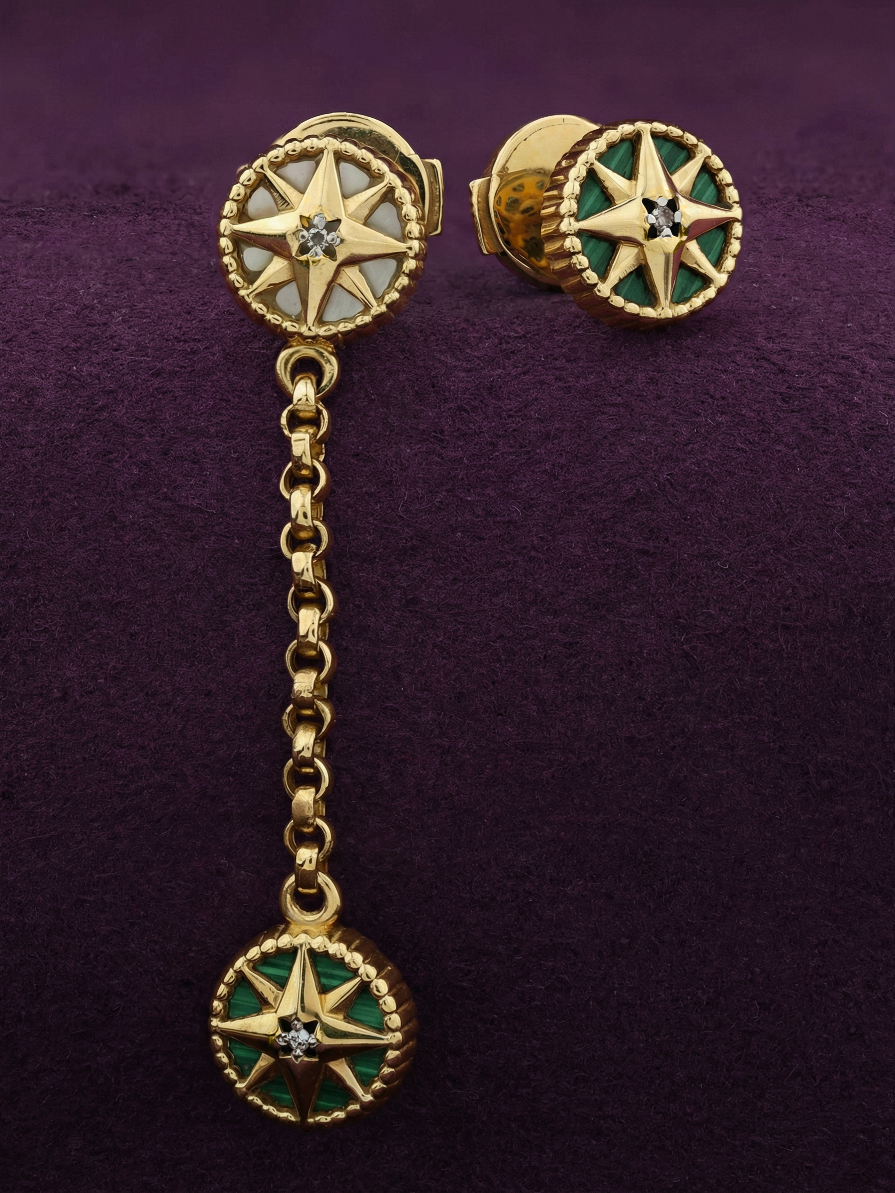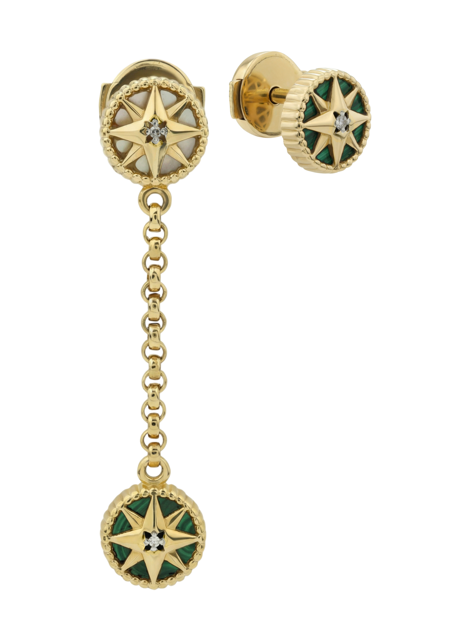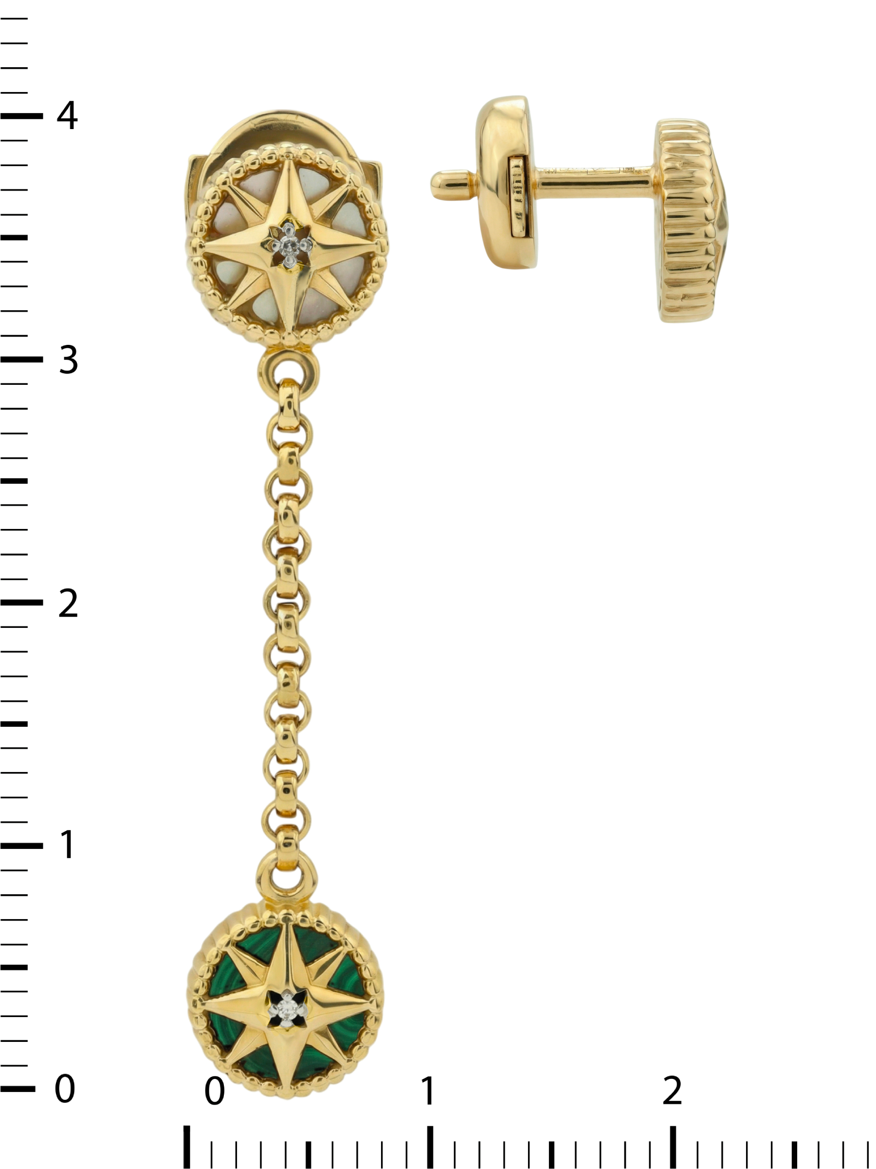 Особую ценность серьгам придает гармоничное сочетание вставок. В центре каждой композиции расположен сверкающий бриллиант круглой формы, дополненный контрастными вставками из глубокого зеленого малахита и нежного перламутра. Всего в изделии использовано 5 вставок, каждая из которых подчеркивает статусность и внимание к деталям. Белый цвет бриллиантов, насыщенный зеленый оттенок малахита и переливы перламутра создают завораживающую игру света, привлекающую внимание.